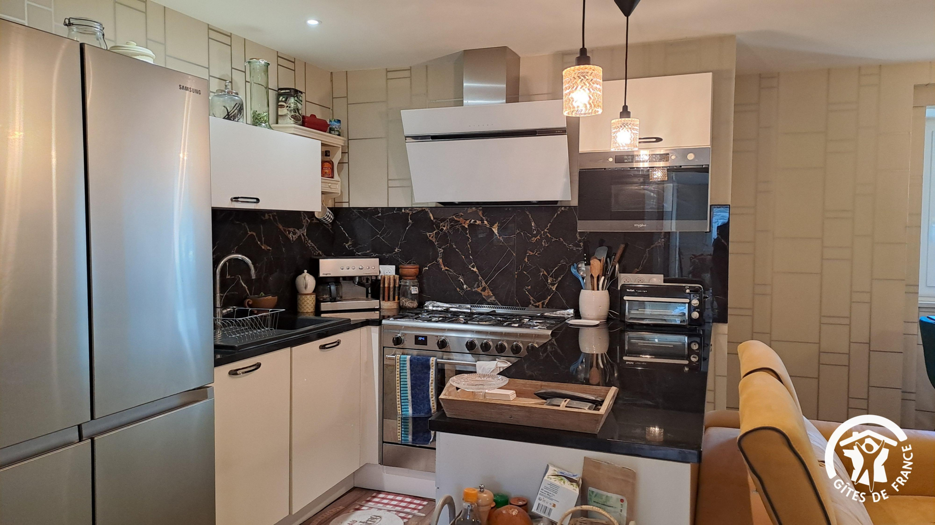 * cuisine avec réfrigérateur américain, piano de cuisson avec four, lave-vaisselle, micro-ondes, grille-pain, cafetière avec café moulue qui fait dosettes et café filtre, blender, hachoir, mixeur-plongeur, siffon, batteur…