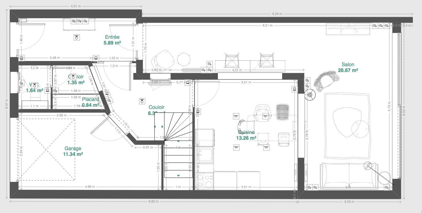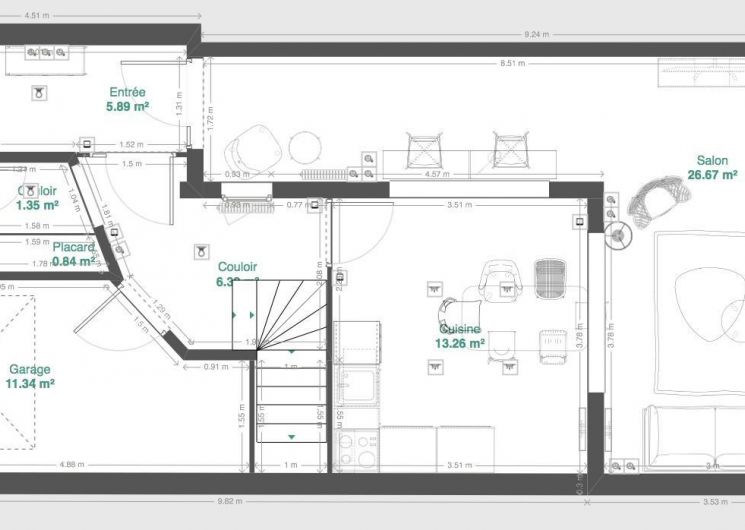 – Au rez-de-chaussée : entrée, pièce de vie claire et lumineuse avec cuisine ouverte, donnant sur le jardinet et ses terrasses. WC indépendant. Accès au garage (lave-linge et container).