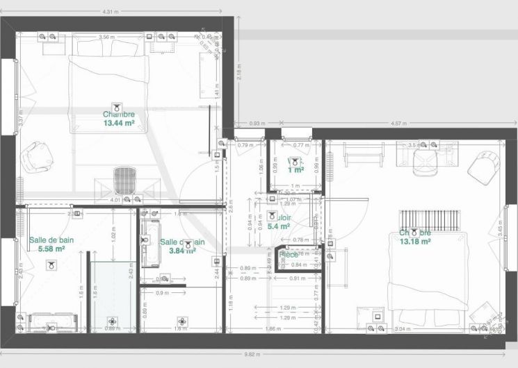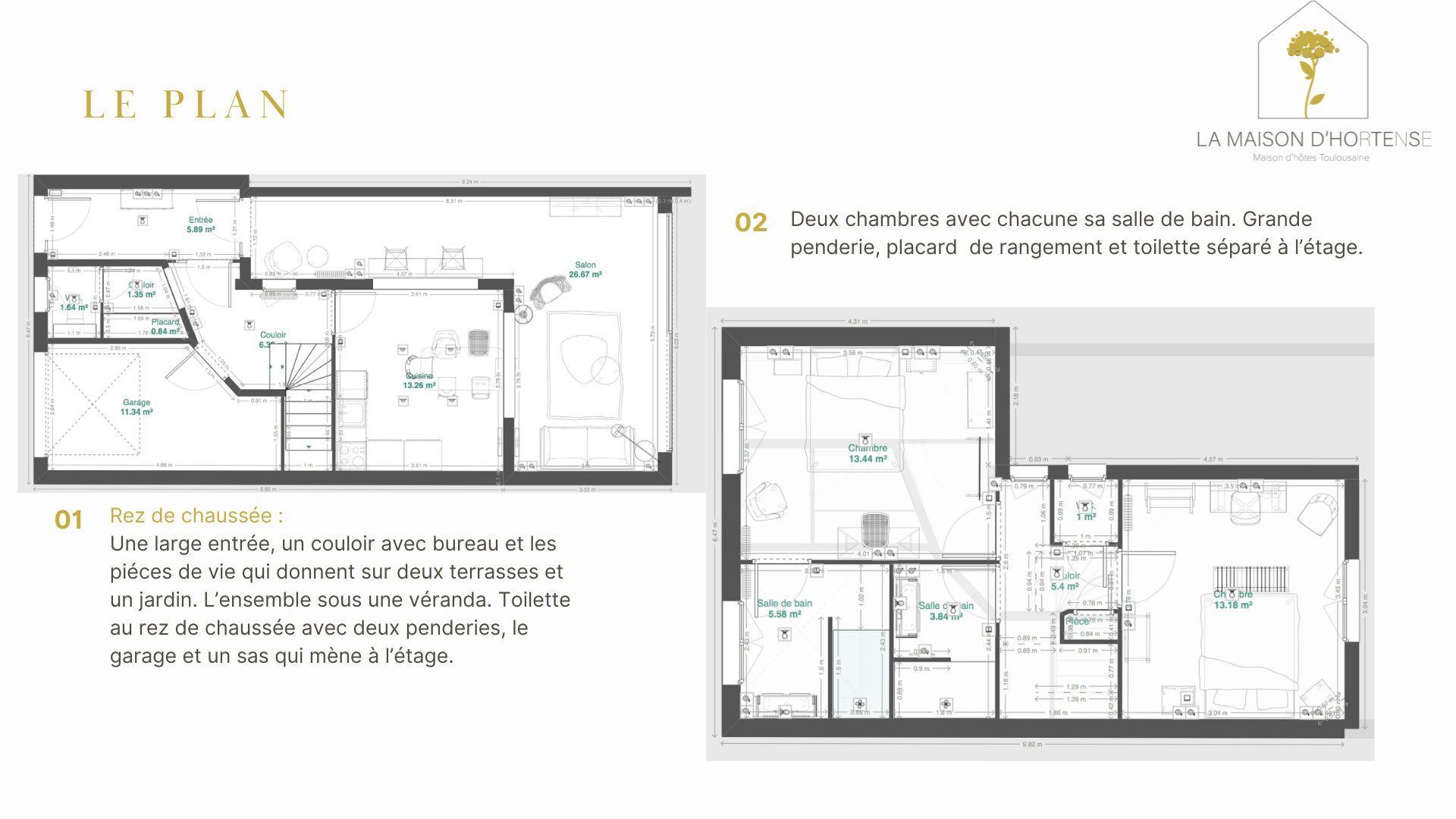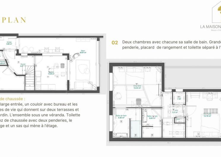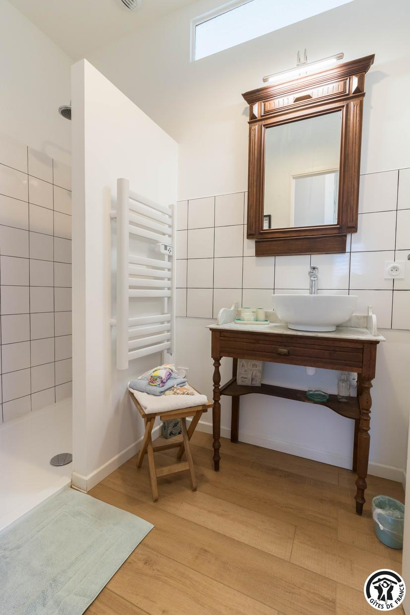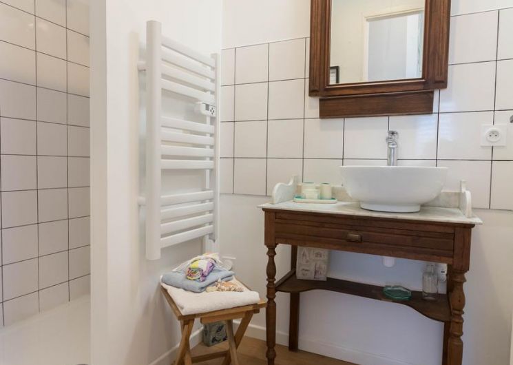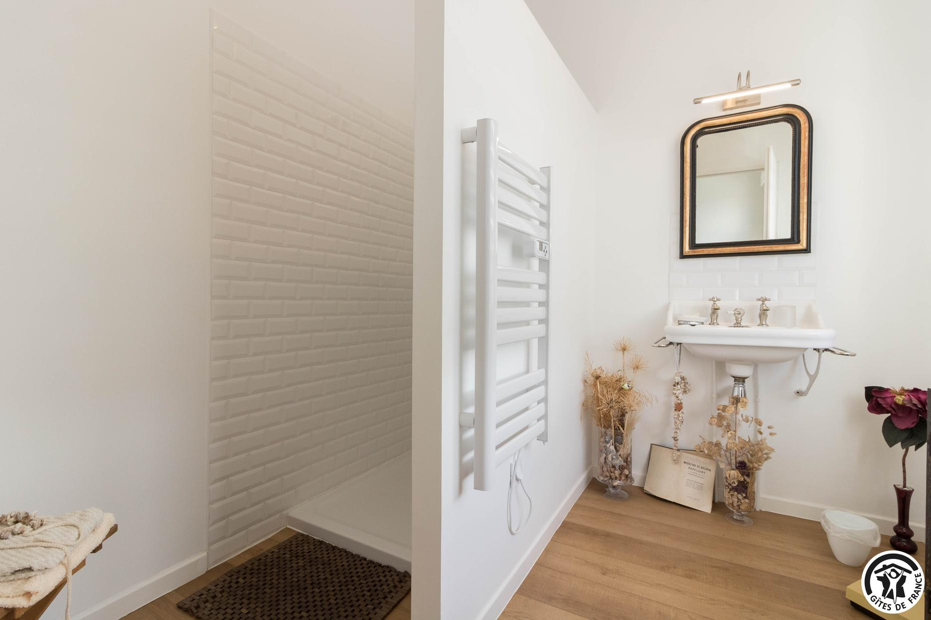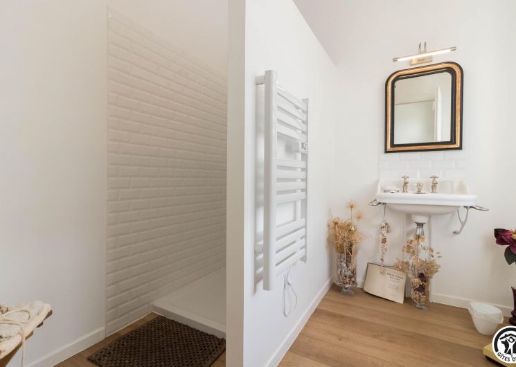 – A l’étage : 2 chambres proposant chacune un lit pour 2 personnes en 160, 2 salles d’eau dont 1 privative à une chambre, WC indépendant.