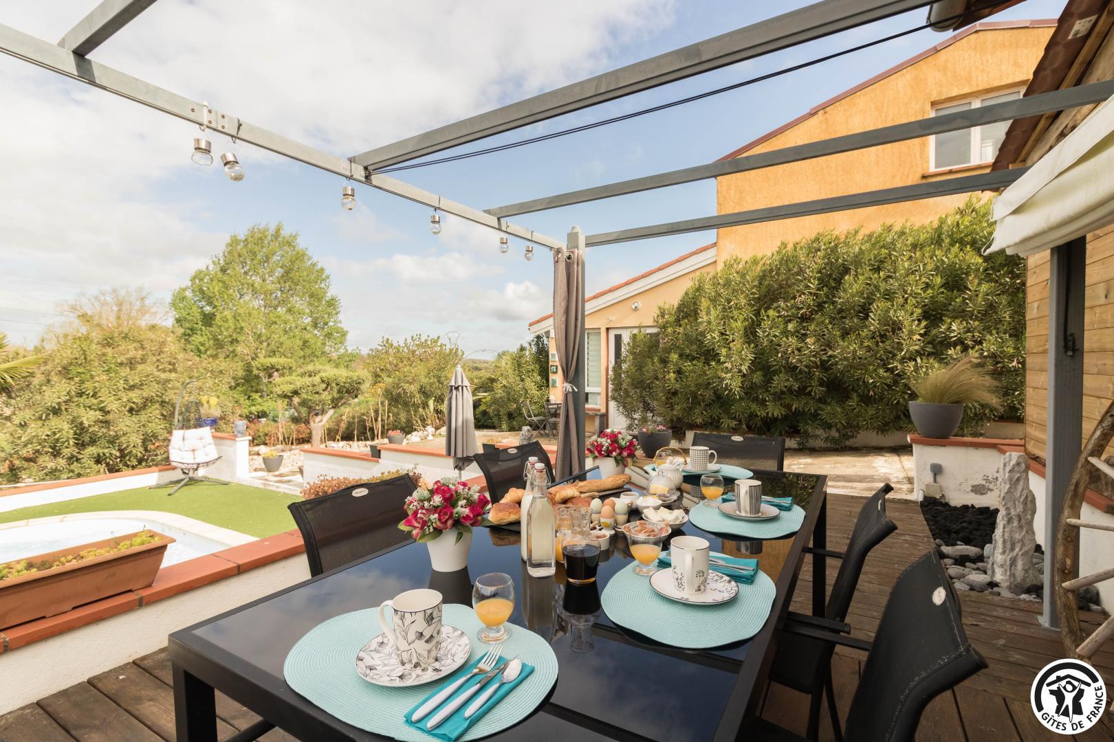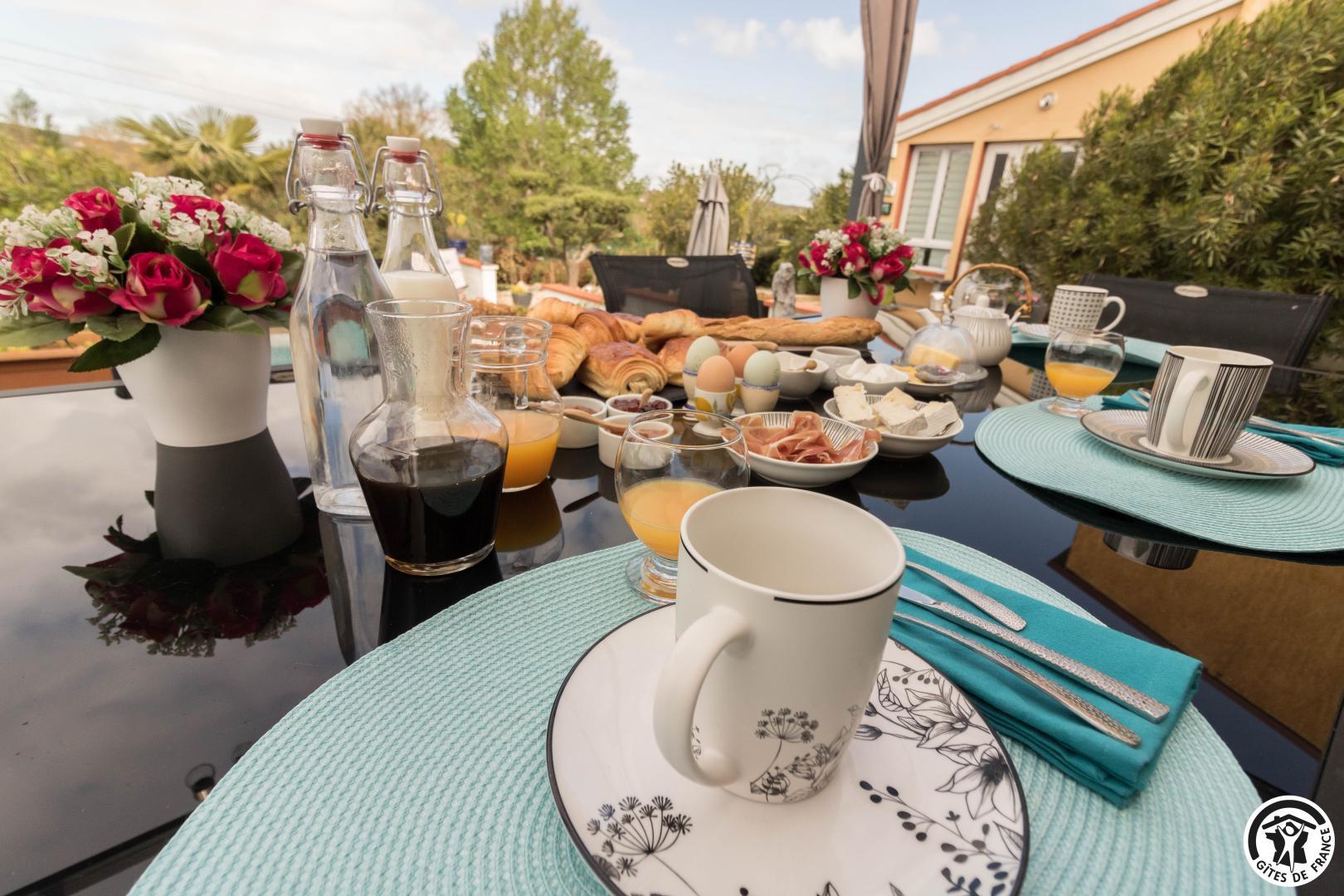 Pour bien commencer votre journée, un petit déjeuner exquis vous attend dans la salle à manger, ou bien à l’extérieur face à la piscine si le temps le permet, préparé par notre hôtesse Léontina. Profitez d’un assortiment de boissons chaudes, de jus d’orange pressé, de viennoiseries fraîches, de pains, de confitures maison, de bons oeufs frais, de charcuterie et de fromage, parmi d’autres délices.