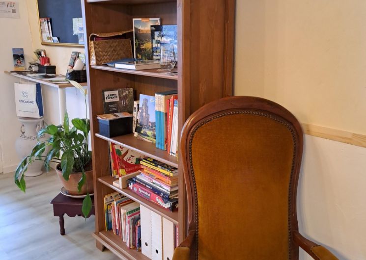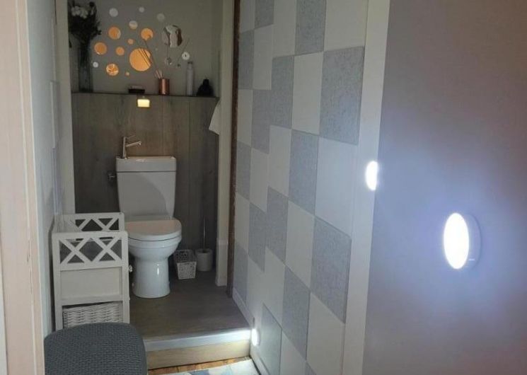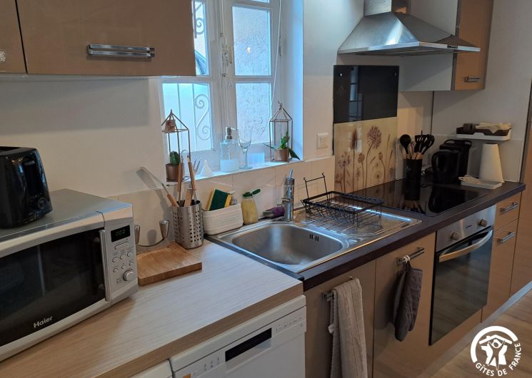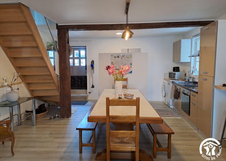 Au rez-de-chaussée, la cuisine ouverte sur la pièce à vivre est équipée de tout le nécessaire pour cuisiner, un équipement électroménager complet (lave-vaisselle, four, micro-ondes, etc… et même un Air Fryer et un Blender) . Le coin salon invite à la détente, à la lecture avec une petite bibliothèque et une télévision connectée. On trouve également à ce niveau la salle d’eau et un wc.