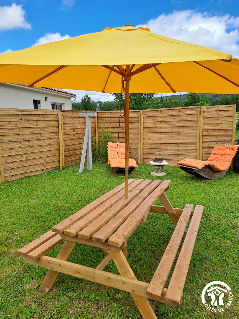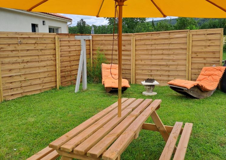 À l’extérieur, profitez de la terrasse avec un salon de jardin agréable. Le jardin privé et clos de 200 m² est idéal pour un moment en famille ou entre amis, avec barbecue, table de pique-nique en bois, bains de soleil en bois et table de ping-pong.