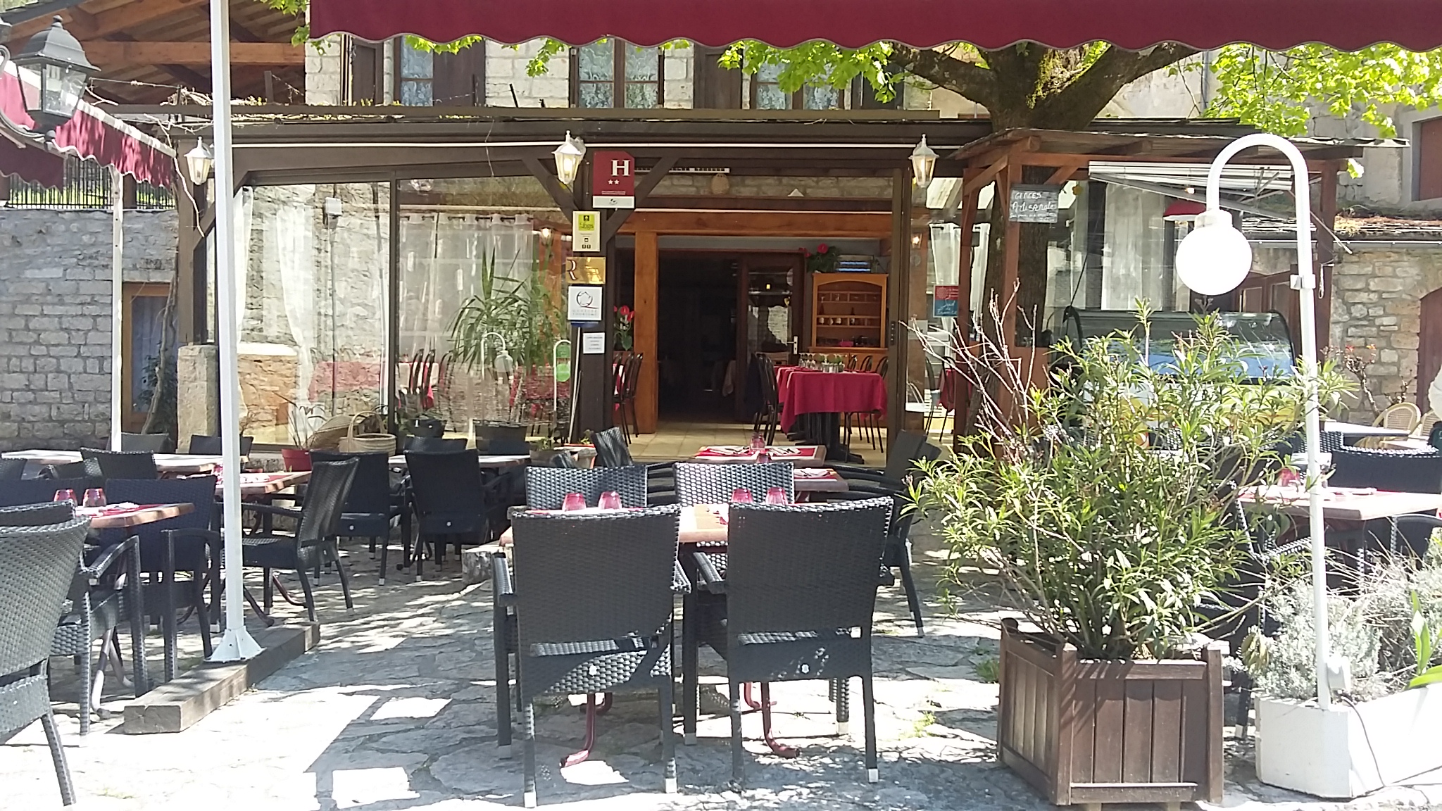 Maison indépendante 2 épis. En plein coeur des Gorges du Tarn une terrasse avec vue panoramique sur les Gorges du Tarn. Accés à la piscine couverte de l’hôtel Rez-de-chaussée : 1 kitchenette (lave-linge, lave-vaisselle, micro-ondes, congélateur), séjour, TV couleur, canapé clic clac. A l’étage : 1 chambre (1 lit 2 places, 1 lit 1 place), salle d’eau, WC. Chauffage électrique, parking privé. Terrasse ombragée, barbecue. Garage gratuit pour motos, vélo et Quad. Vue panoramique sur les Gorges du Tarn.