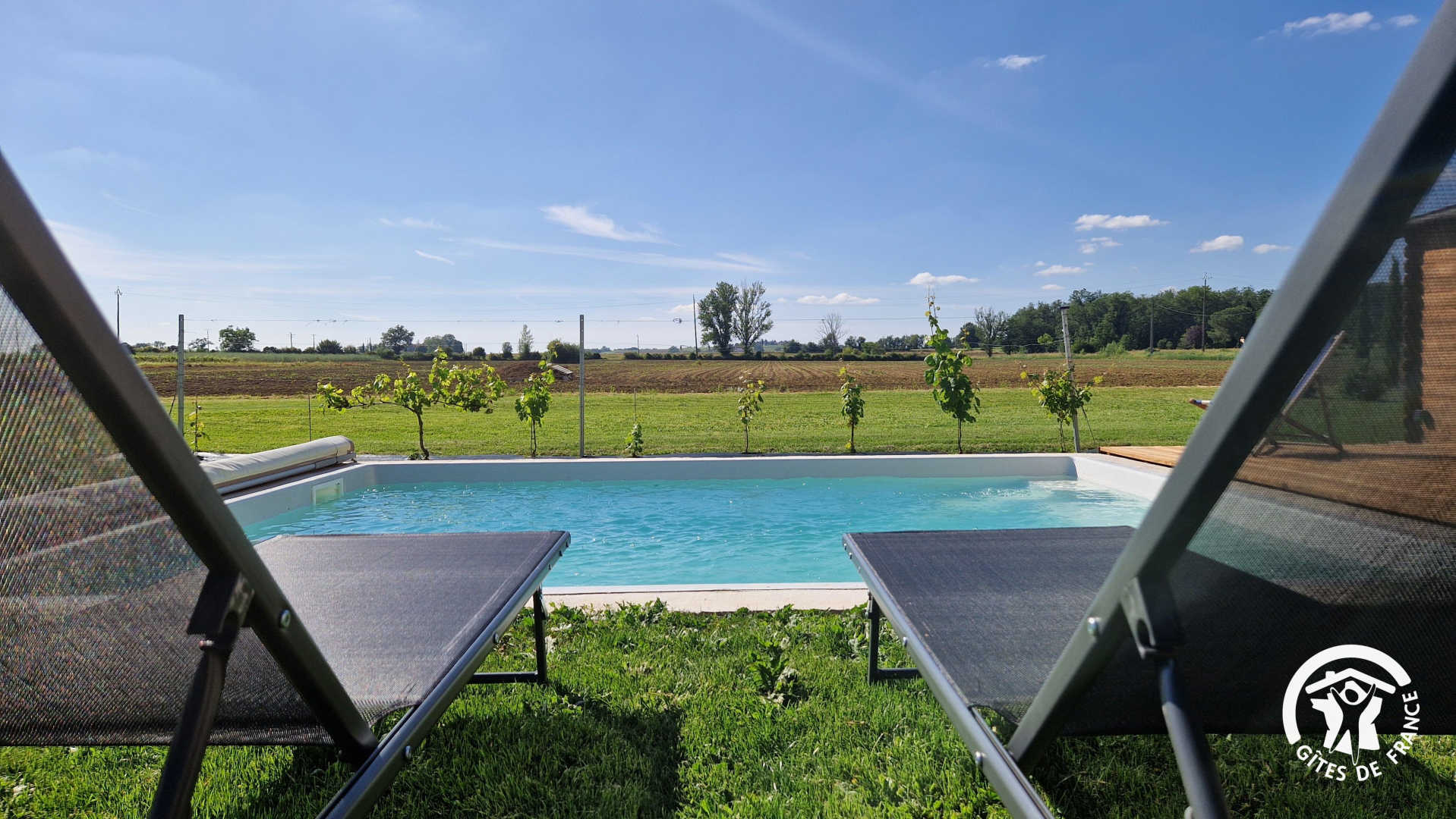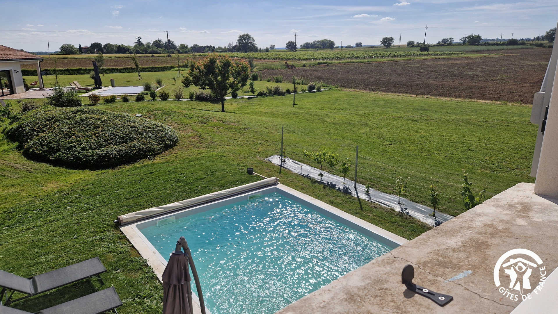 – Piscine privative de 4 x 5m avec marches et petite plage, fond plat 1,50m, bâche à barres. Piscine ouverte de début mai à fin octobre