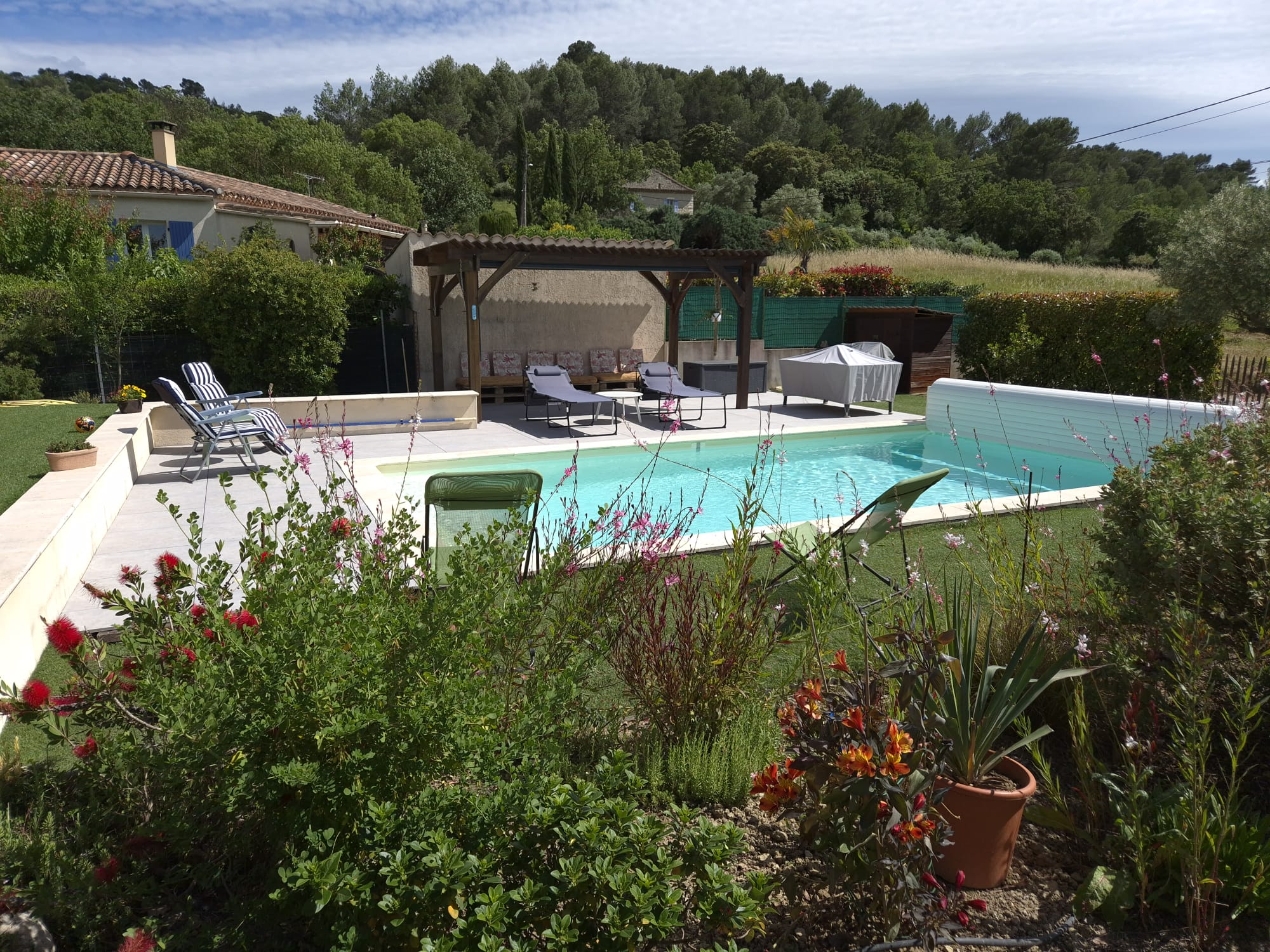 L’accès à la piscine est sécurisé (portillons,volet à lamelles), bains de soleil à disposition.