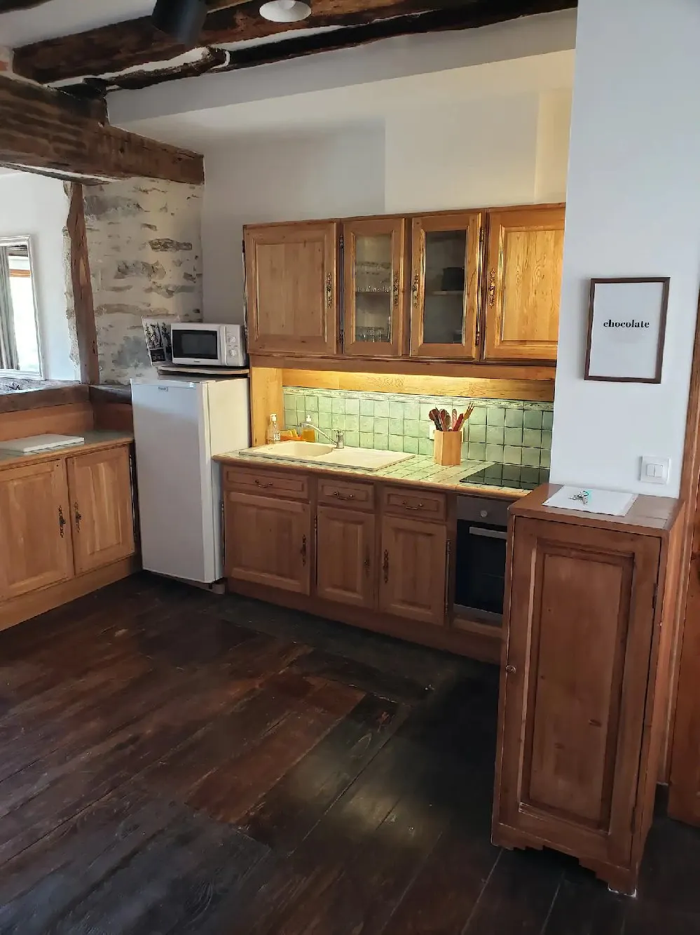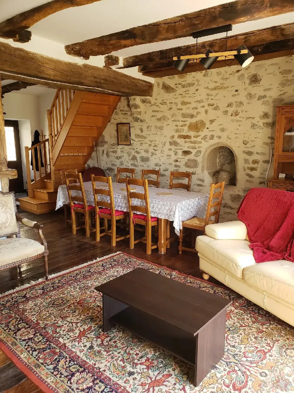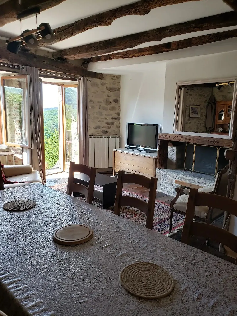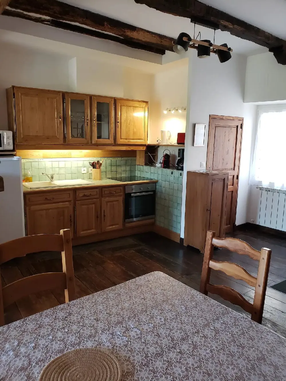 Cuisine équipée, salle à manger/séjour: table, chaises, canapé, fauteuils, télévision (utilisation de la cheminée à foyer ouvert possible en période froide avec supplément pour le bois)