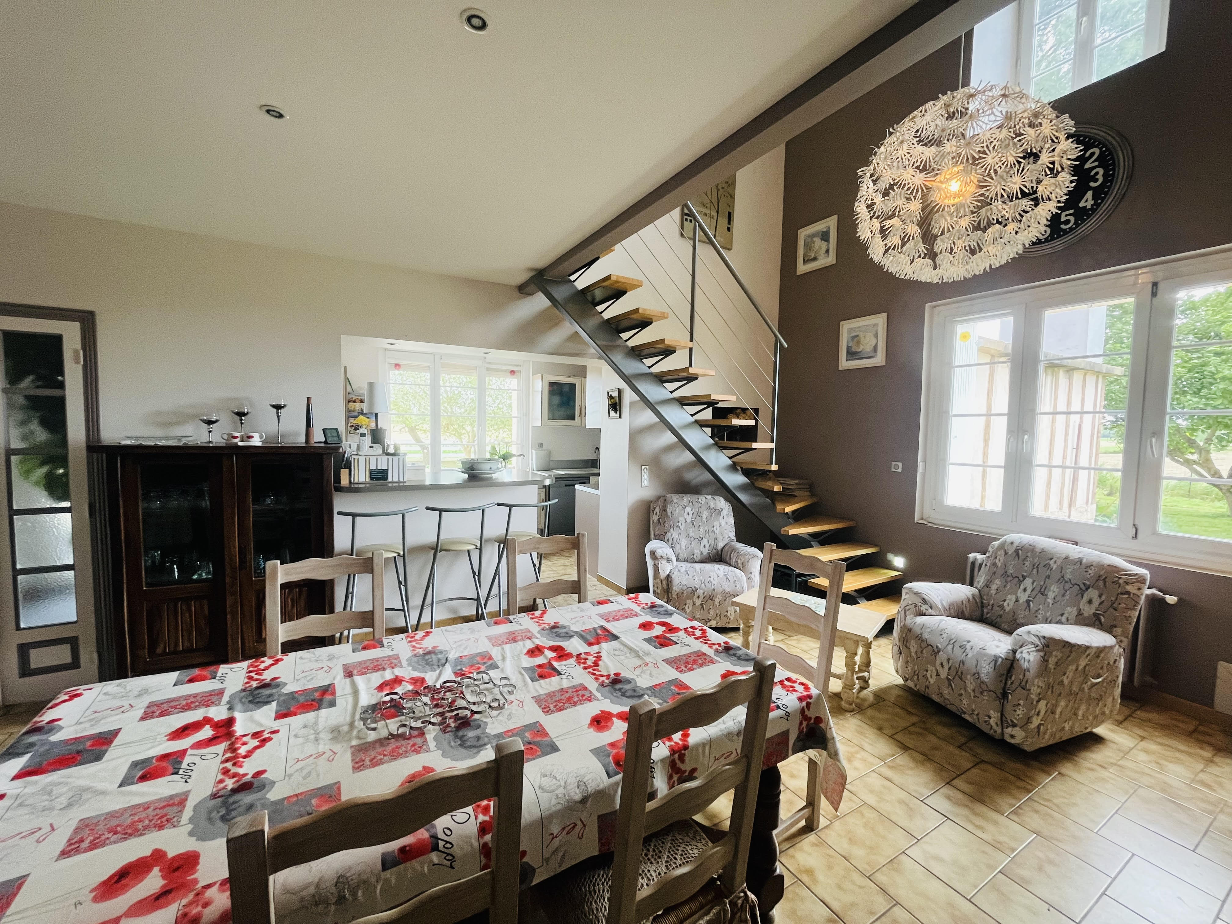 Cette merveilleuse maison familiale située à la campagne, offre une vue pittoresque sur les champs verdoyants. Cette propriété spacieuse dospise de beaux volumes offrent des espaces confortables pour se détendre et profiter de moments conviviaux.