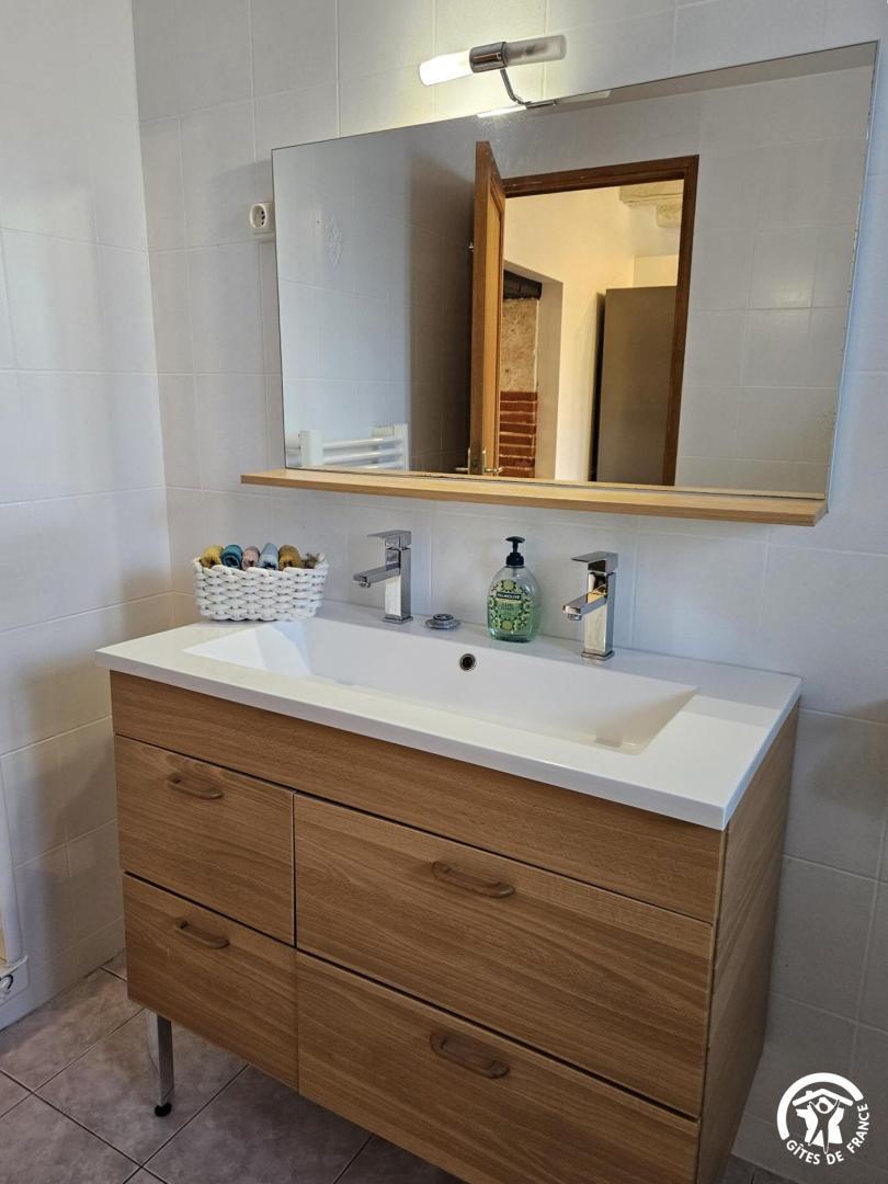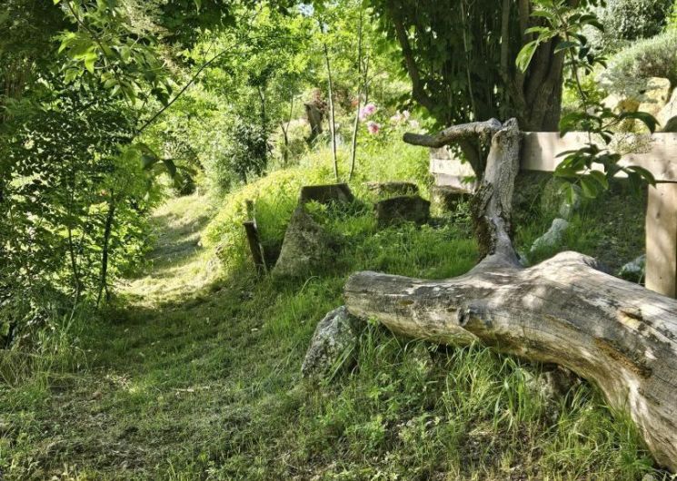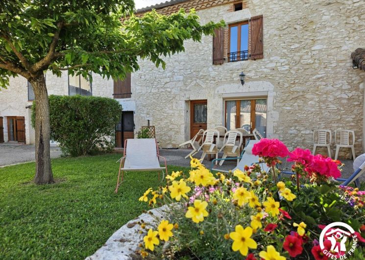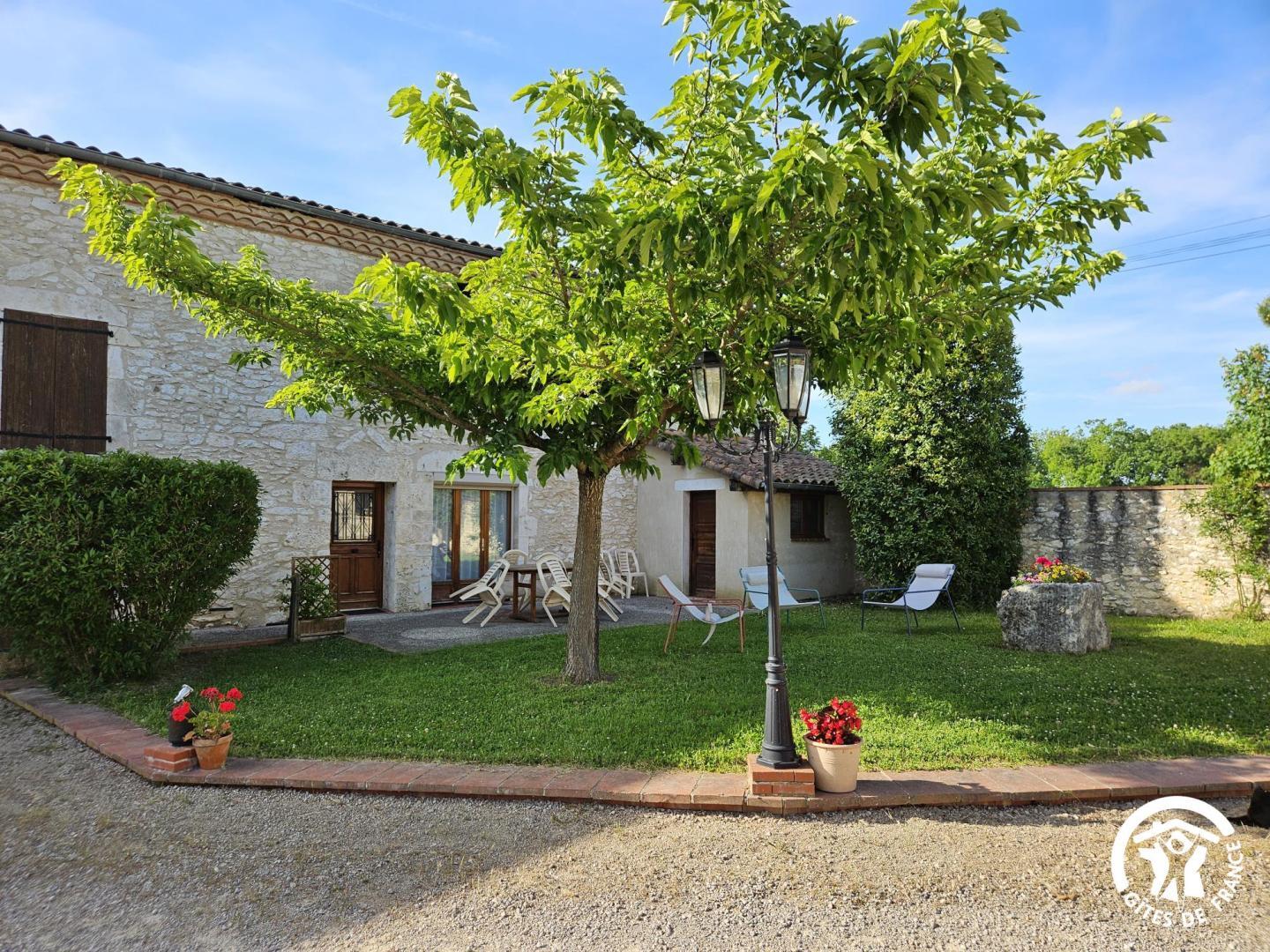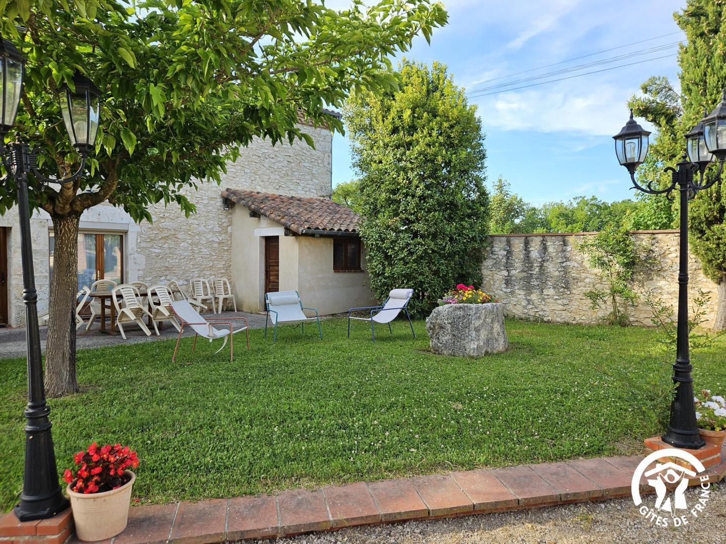 Devant le gîte, vous profiterez d’un espace repas ombragé avec une table, parasol, chiliennes confortables pour vous détendre à l’ombre du mûrier platane.