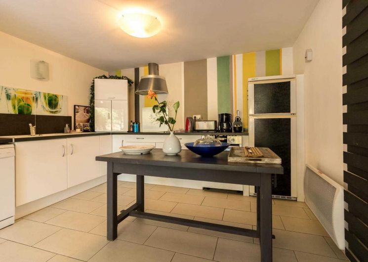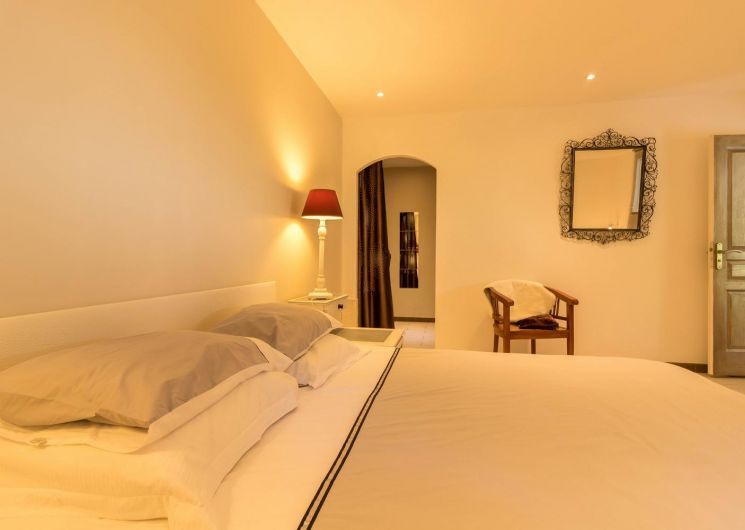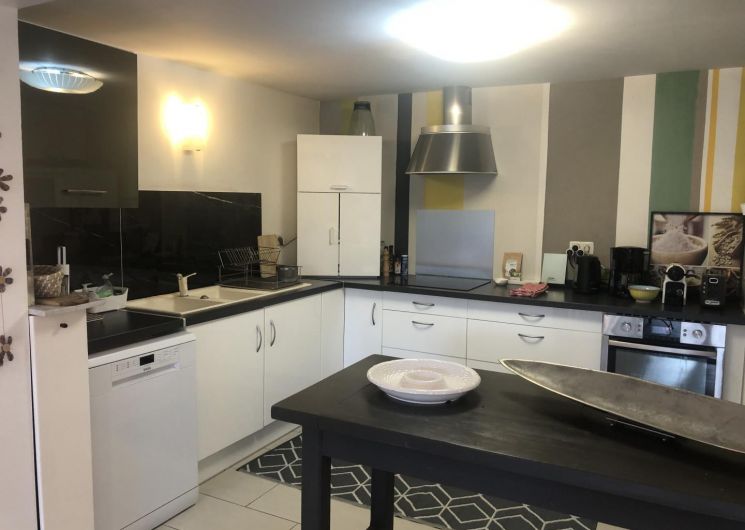 Plain pied : grand espace de vie, cuisine ouverte (frigo/congélateur, micro-ondes, plaque induction, four), salon deux banquettes (TV écran plat, TNT, portable à carte), chambre (1 lit 2 personnes en 160cm + 1 lit 1 personne en 110cm) avec dressing, salle d’eau et WC indépendant, buanderie (sèche-linge). Matériel bébé à la demande. Jardin et piscine en commun. Animaux admis. Internet.