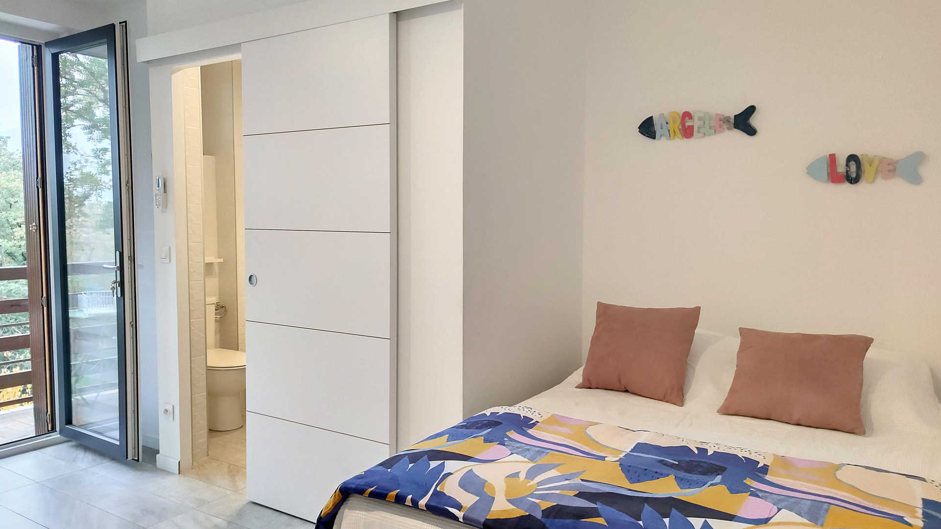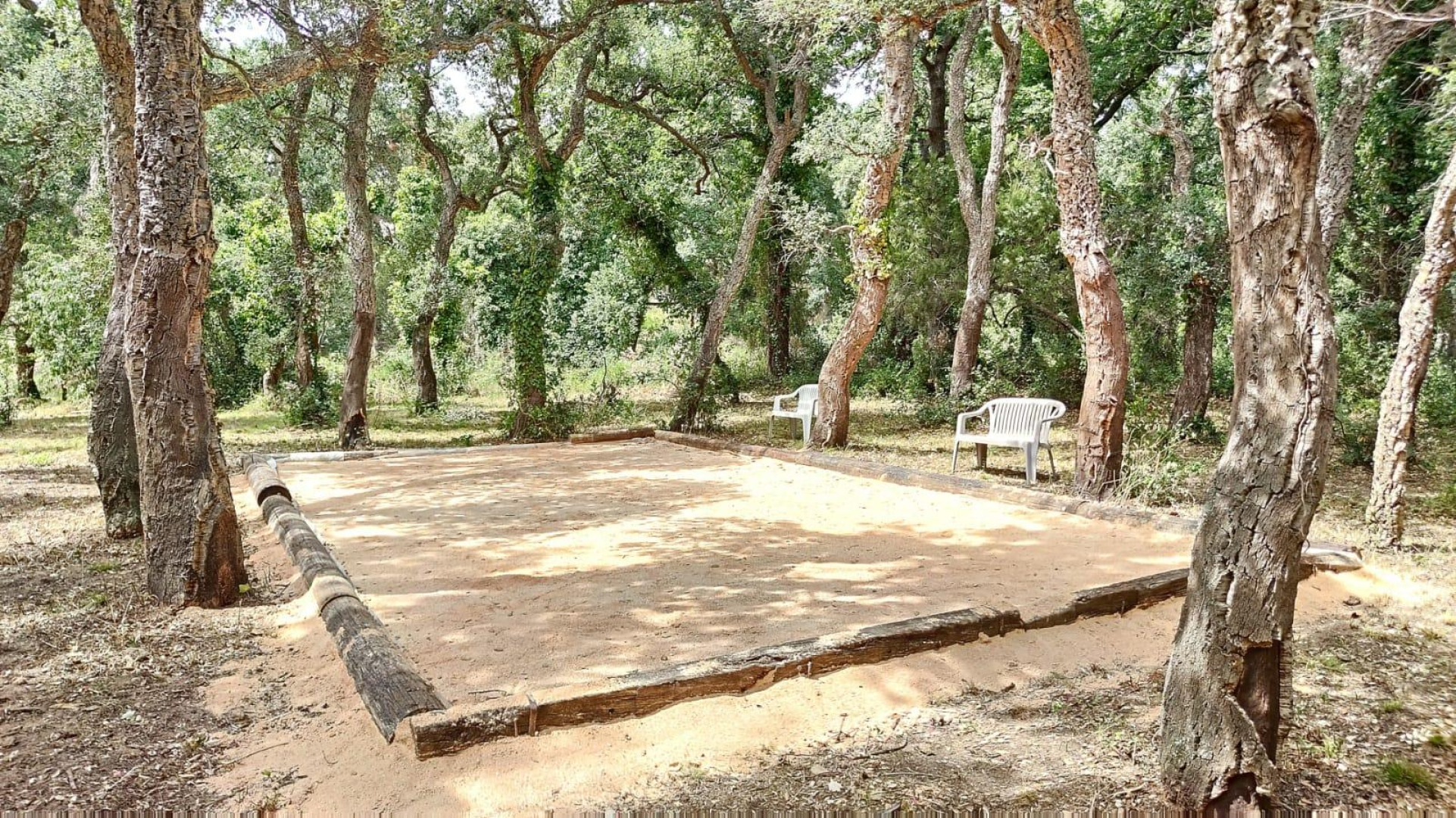 Vous apprécierez les grands espaces extérieurs de plus de 1,5 ha non clôturés, arborés de chênes lièges et d’oliviers. Studio, appartement ou villa…., choisissez ! En famille, entre amis, ce village de gîtes vous attend ! Vous séjournerez proche de la nature tout en étant à deux pas de l’animation, des plages et des criques ! La nouvelle piste cyclable EuroVelo8 passe devant le domaine. Pour chaque gîte, une place de parking privative et sécurisée est à votre disposition. A l’étage (3 marches): Ce joli studio, équipé d’une cuisine avec pièce à vivre (1 lit 140), d’une salle d’eau (wc), est ouvert sur son balcon de 5,5 m²avec vue sur les montagnes. Le balcon est aménagé en cursive commune à 3 gîtes.