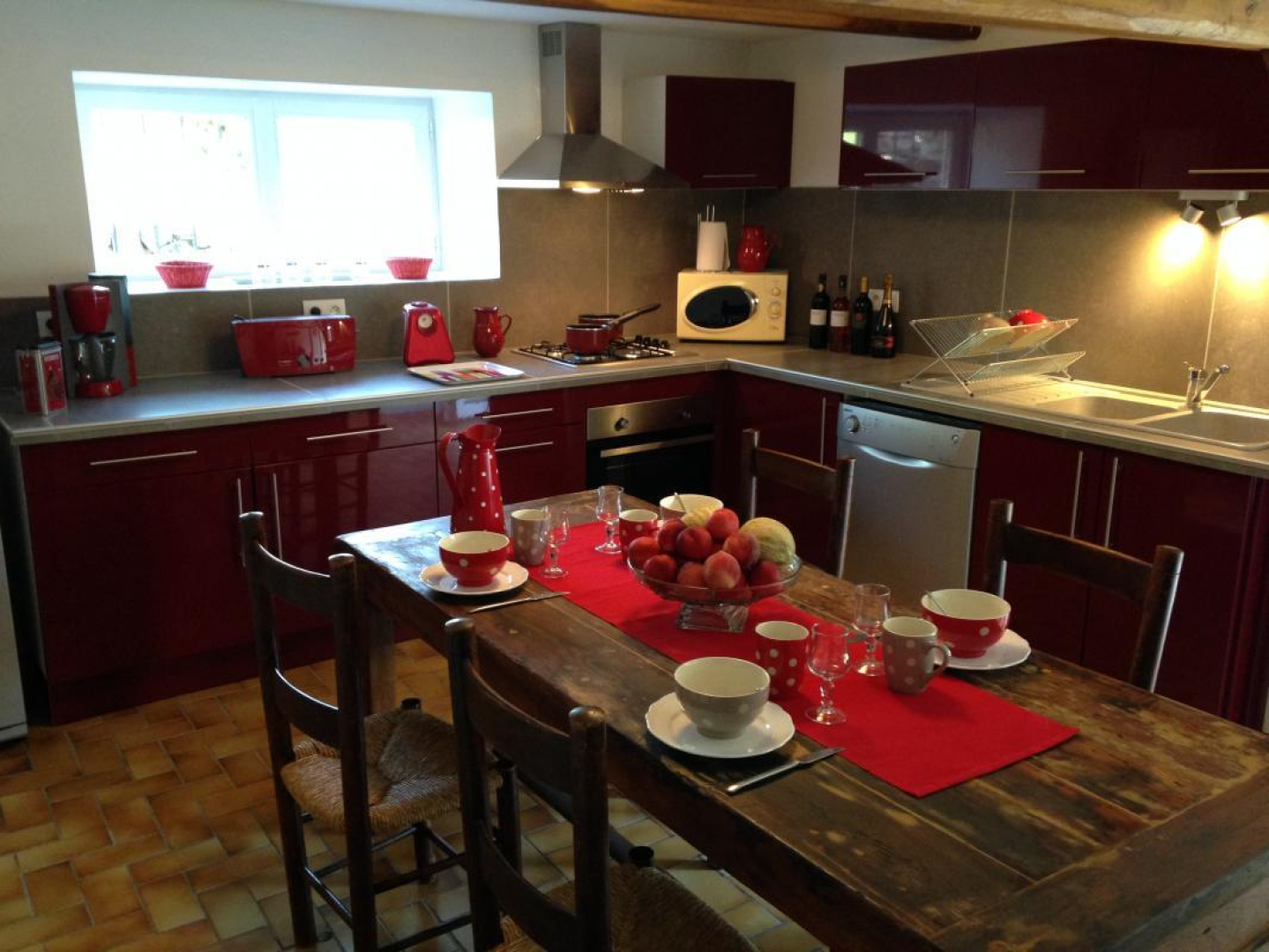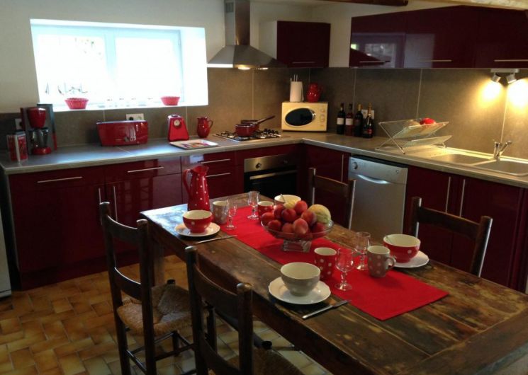 – la cuisine, accessible depuis le salon avec une marche. Cuisine équipée d’un lave-vaisselle, réfrigérateur avec congélateur, micro-ondes, four, grille-pain, cafetière…