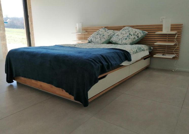 La grange se compose : – Au RDC, d’une grande pièce a vivre climatisée, cuisine toute équipée / salle a manger, ouverte sur le salon ; d’un WC ; et d’une chambre double avec salle d’eau. – Au premier étage, une mezzanine avec un canapé BZ pouvant servir de lit d’appoint, un WC, et une chambre double avec salle d’eau. – Au second, chambre triple (possibilité de rapprocher deux lits pour en faire un double) avec WC et salle d’eau. Le logement n’est pas adapté aux personnes à mobilité réduite. Sa terrasse ombragée, donnant sur un petit bosquet de chênes, sera parfaite pour cet été !