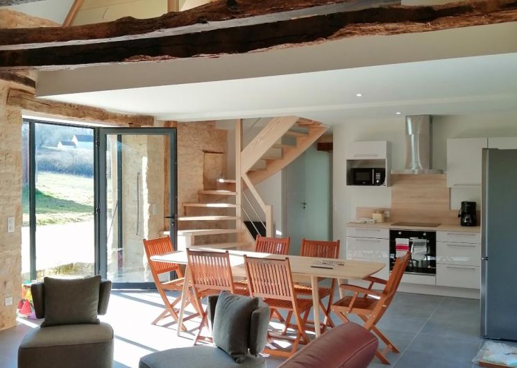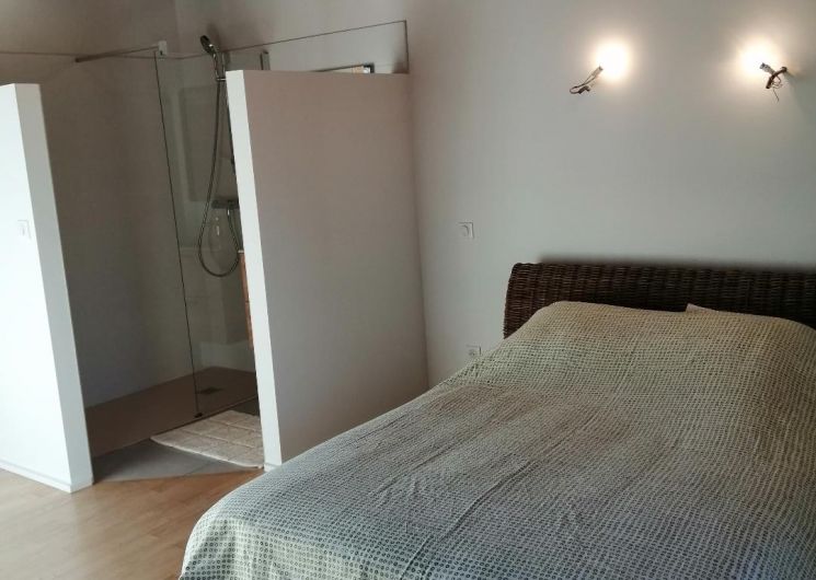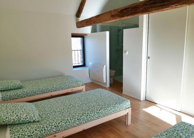 La grange se compose : – Au RDC, d’une grande pièce a vivre climatisée, cuisine toute équipée / salle a manger, ouverte sur le salon ; d’un WC ; et d’une chambre double avec salle d’eau. – Au premier étage, une mezzanine avec un canapé BZ pouvant servir de lit d’appoint, un WC, et une chambre double avec salle d’eau. – Au second, chambre triple (possibilité de rapprocher deux lits pour en faire un double) avec WC et salle d’eau. Le logement n’est pas adapté aux personnes à mobilité réduite. Sa terrasse ombragée, donnant sur un petit bosquet de chênes, sera parfaite pour cet été !