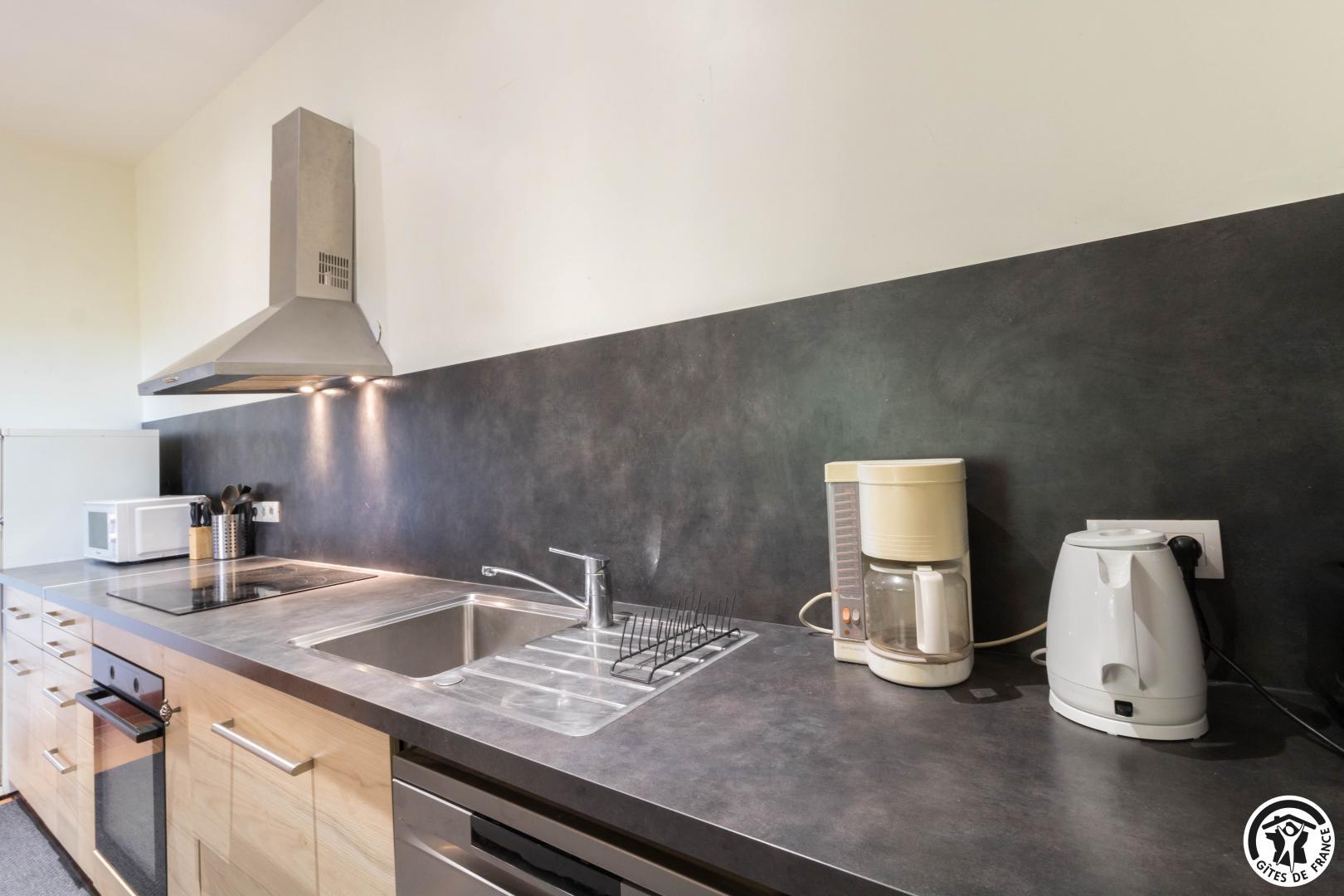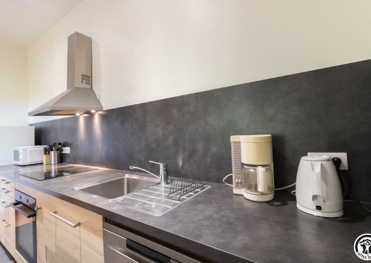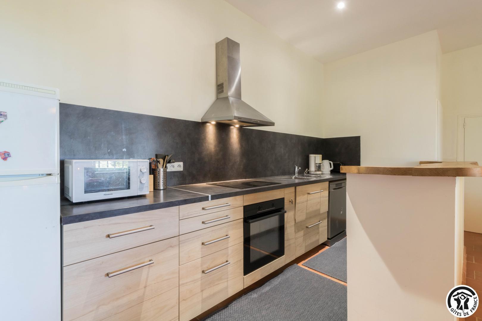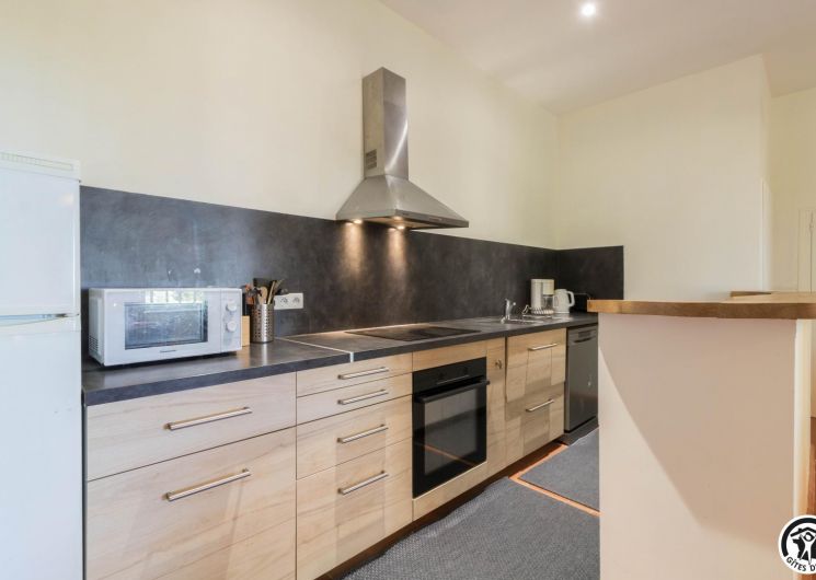 – Au rez-de-chaussée : une entrée (lit d’appoint en 90cm), un WC, un grand séjour composé d’une cuisine intégrée, séparée d’un coin salon par un grand bar en bois naturel et d’un espace repas.