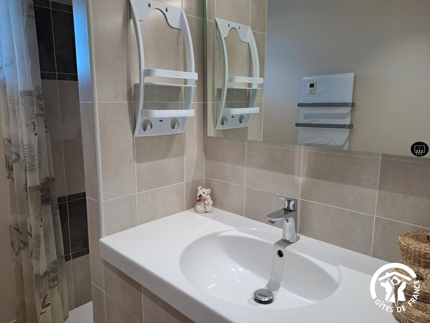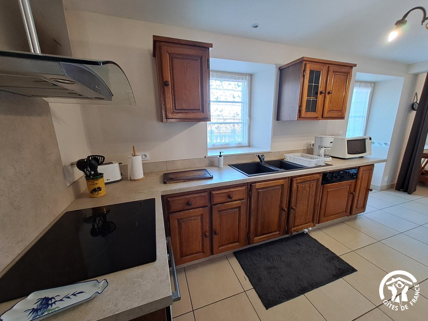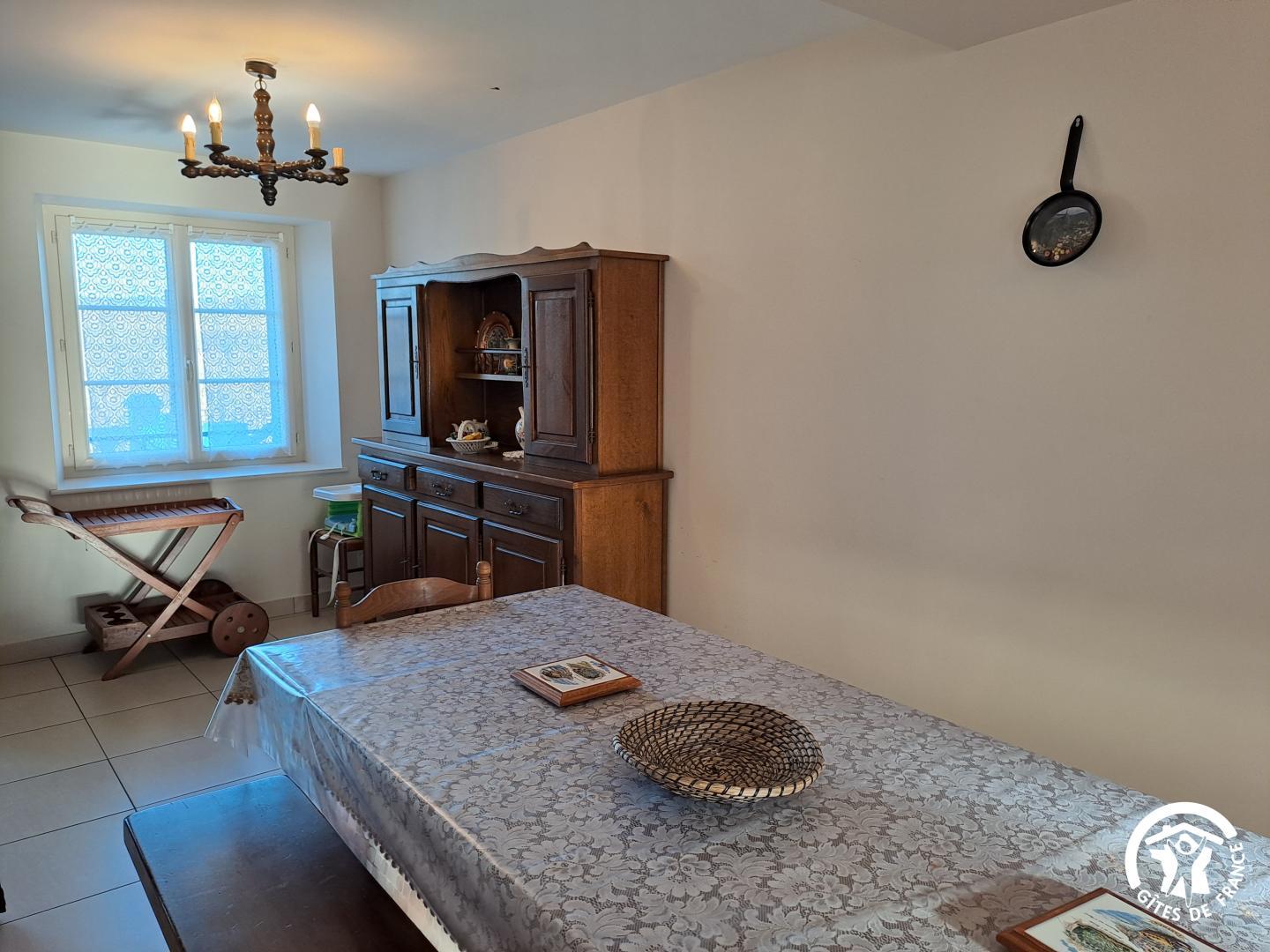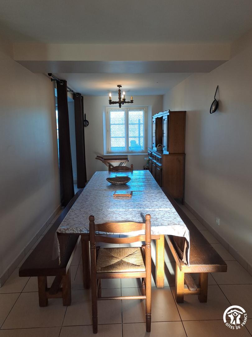 Le rez-de-chaussée s’articule autour d’une cuisine entièrement équipée, comme à la maison. La grande pièce de vie, véritable cœur du gîte, réunit un coin repas avec bancs, ainsi qu’un salon, propice aux instants de détente. Que ce soit autour d’un bon repas ou d’une partie de jeux de société, cet espace invite aux moments de partage.