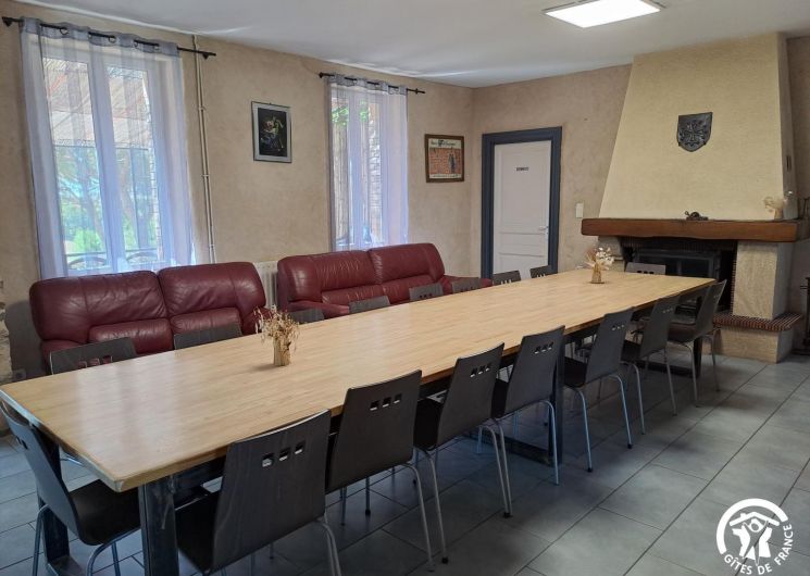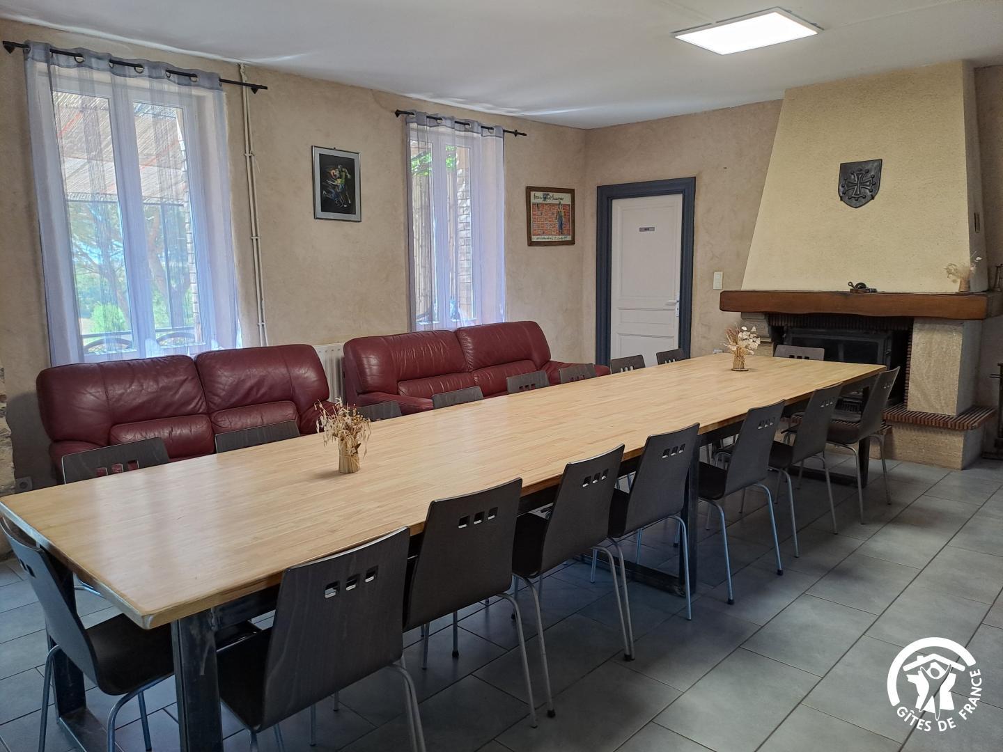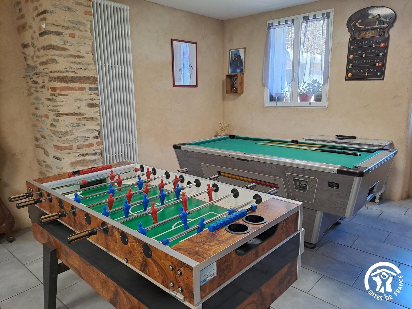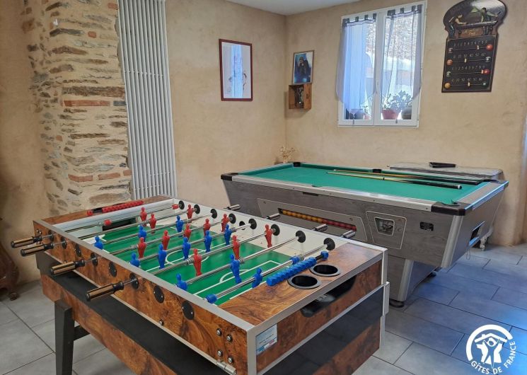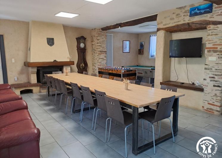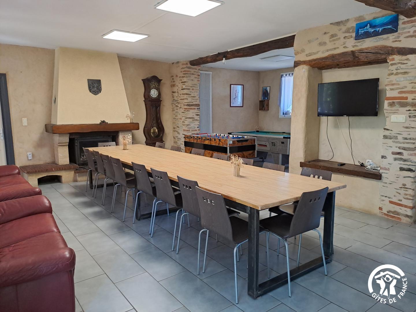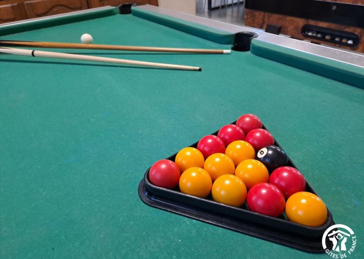 La pièce maîtresse est la vaste salle à manger, pensée pour la convivialité avec une cheminée (bois fourni), une grande table familiale, un billard, un babyfoot et une télévision qui permettent de partager des moments chaleureux, quelles que soient les envies ou la météo.