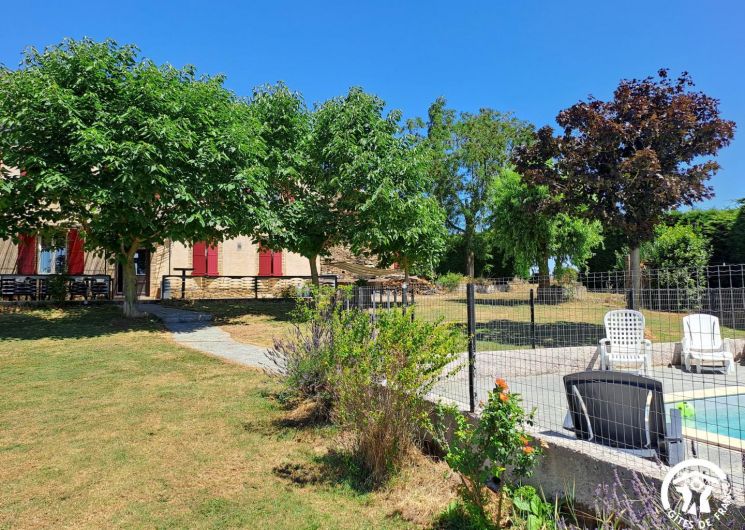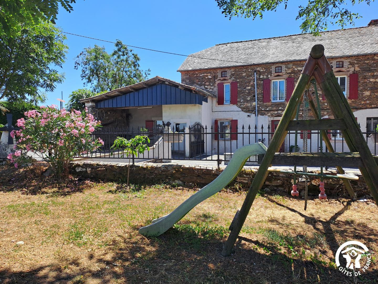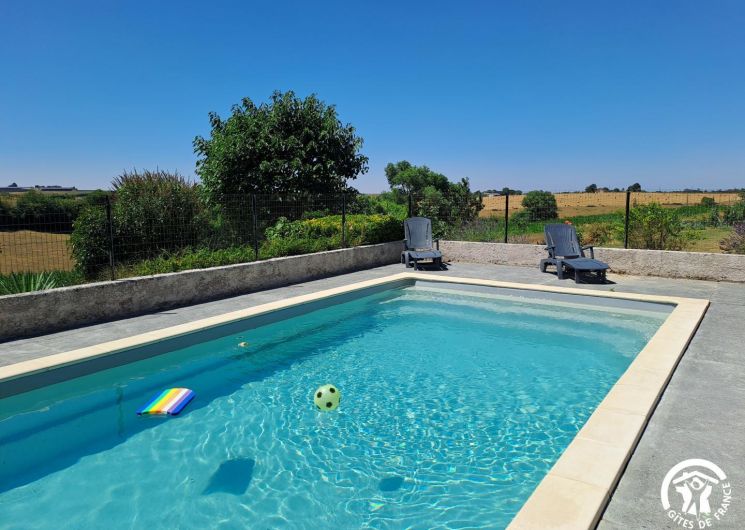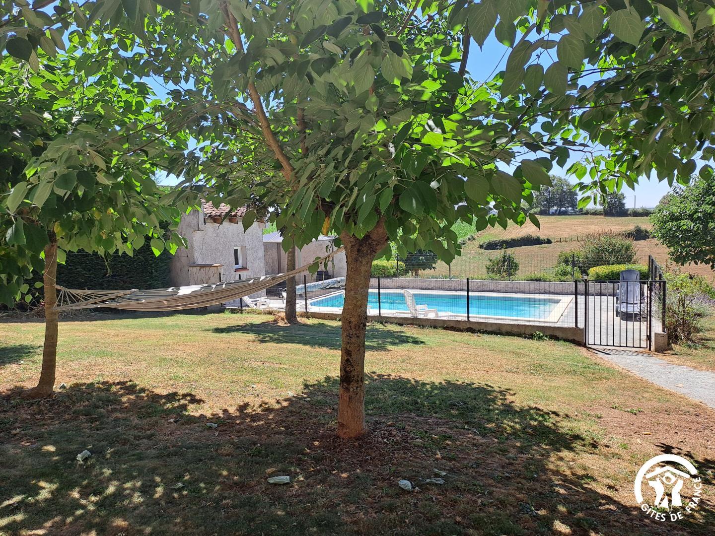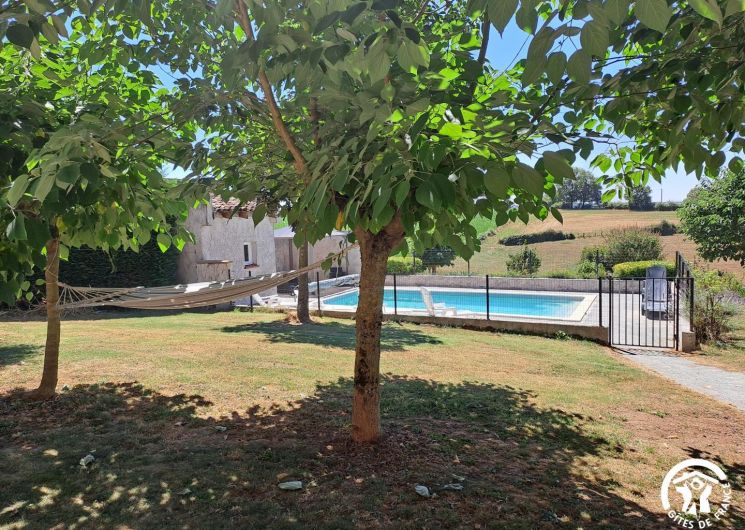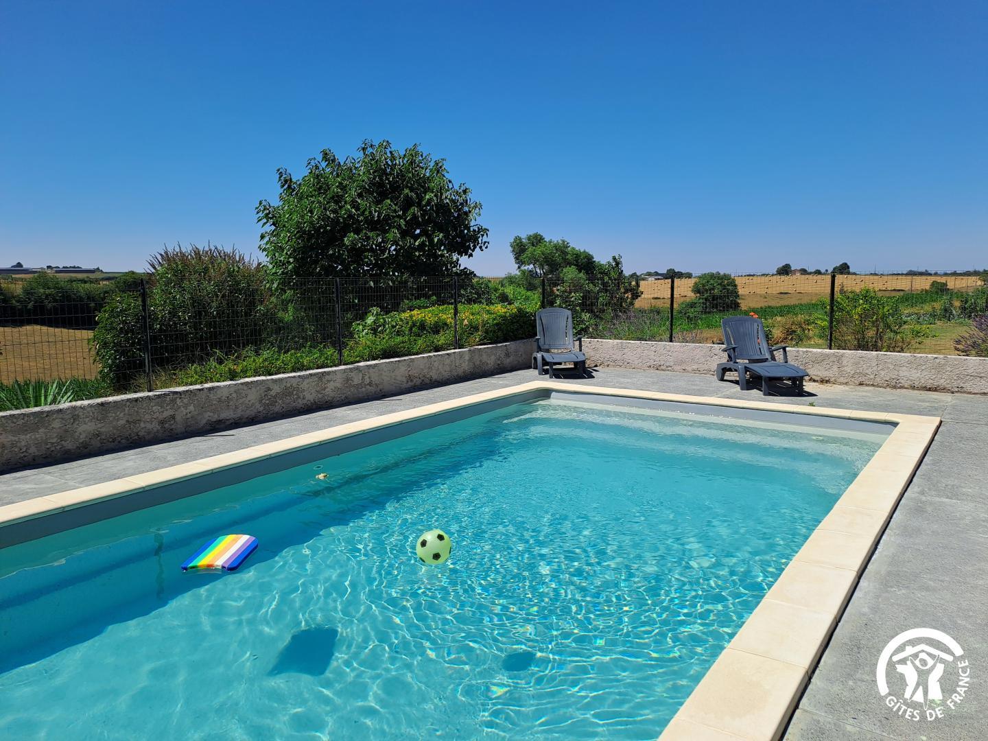 À l’extérieur, le gîte s’ouvre une grande terrasse ombragée, équipée d’une longue table. Un barbecue et une plancha sont à disposition pour les grillades. Le jardin accueille une piscine privative (8x4m, prof 1,40m), sécurisée par une clôture, entourée de bains de soleil et d’un petit salon de jardin. Un hamac est installé à l’ombre pour les siestes tranquilles, et les enfants peuvent profiter d’un espace de jeux avec balançoire, toboggan et trampoline.