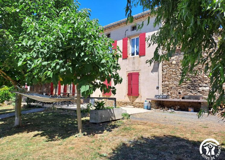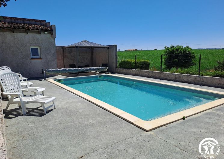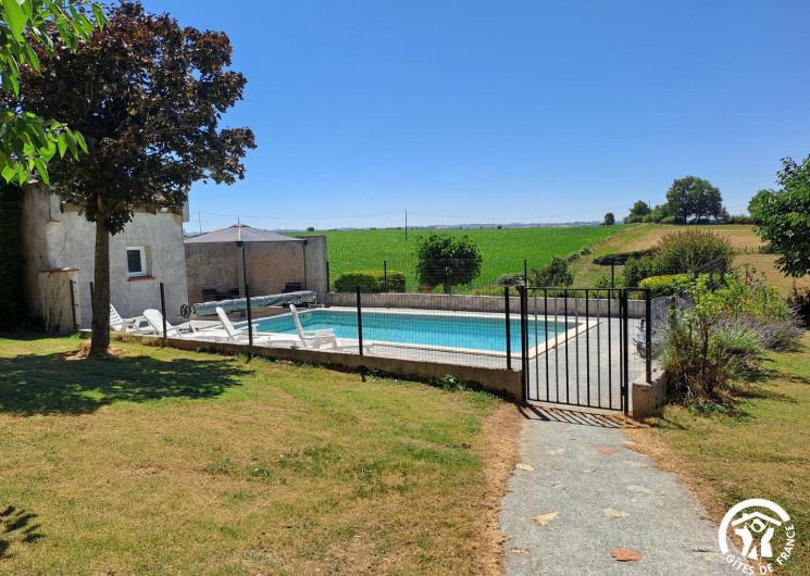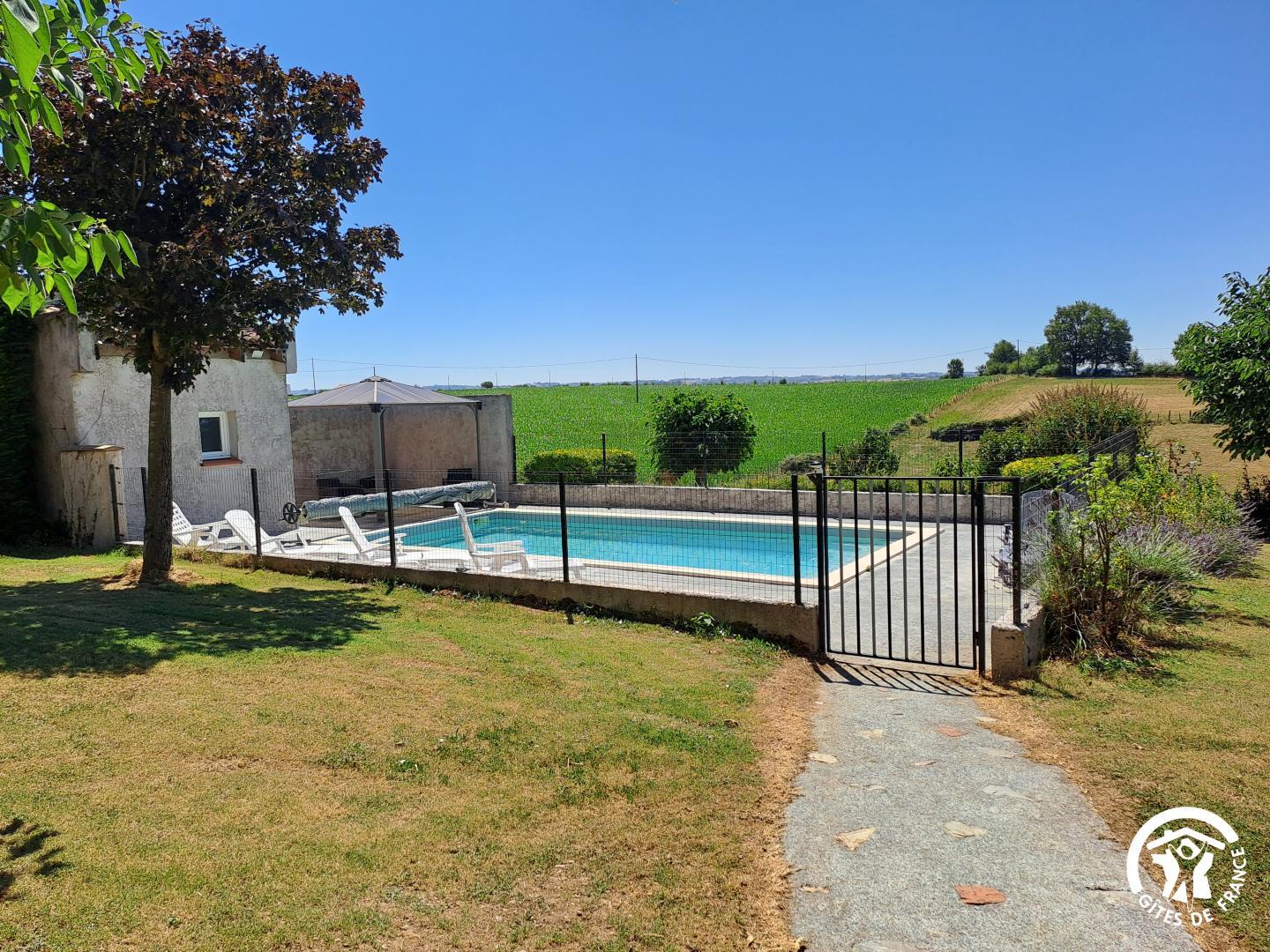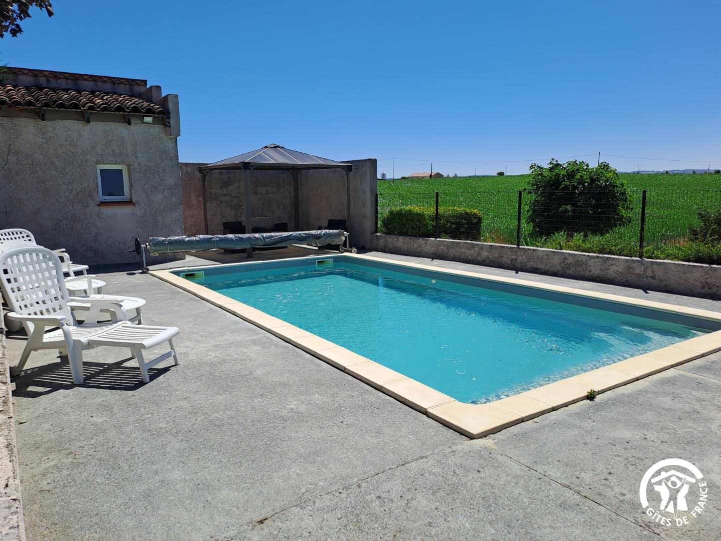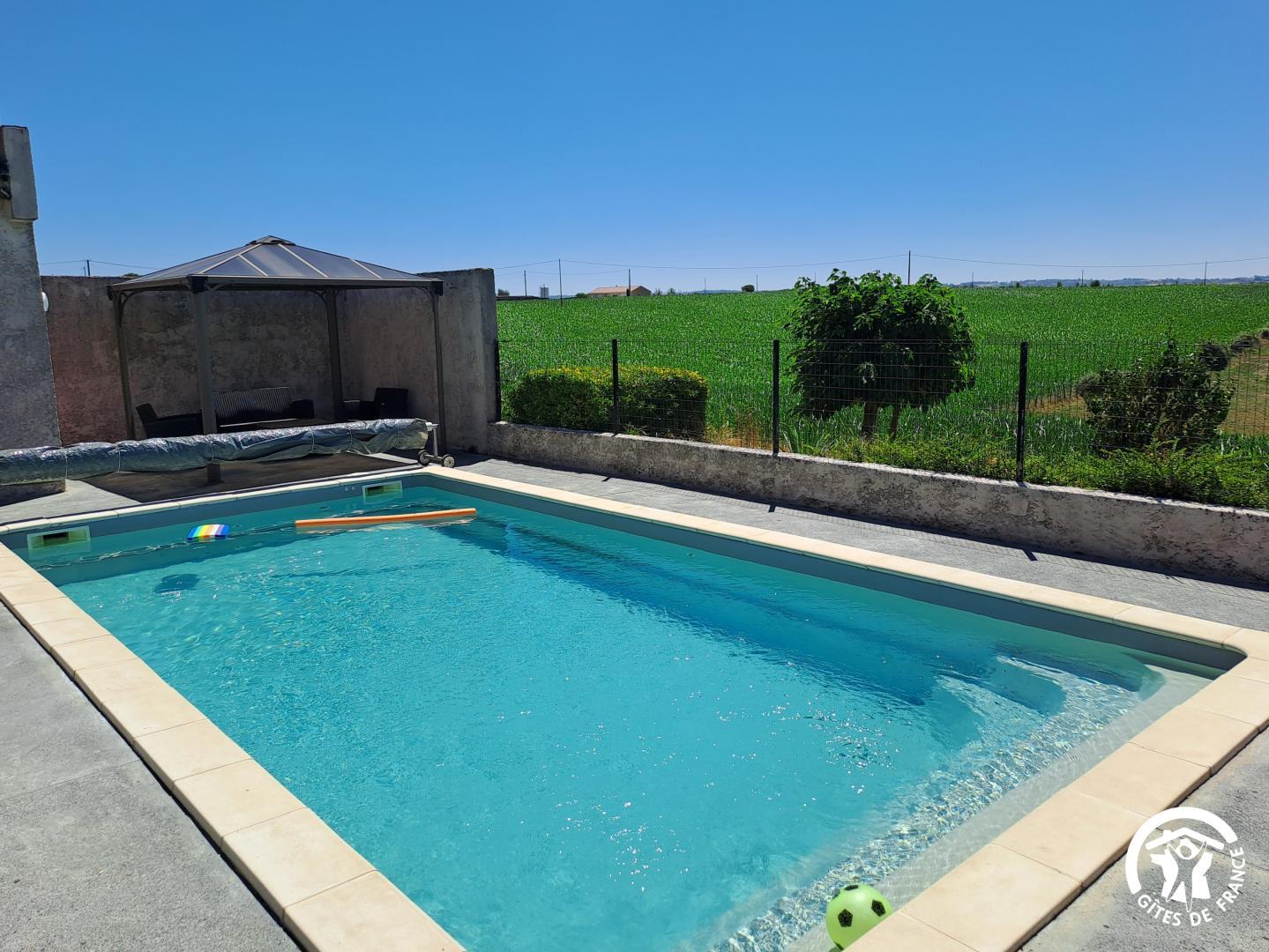 À l’extérieur, le gîte s’ouvre une grande terrasse ombragée, équipée d’une longue table. Un barbecue et une plancha sont à disposition pour les grillades. Le jardin accueille une piscine privative (8x4m, prof 1,40m), sécurisée par une clôture, entourée de bains de soleil et d’un petit salon de jardin. Un hamac est installé à l’ombre pour les siestes tranquilles, et les enfants peuvent profiter d’un espace de jeux avec balançoire, toboggan et trampoline.