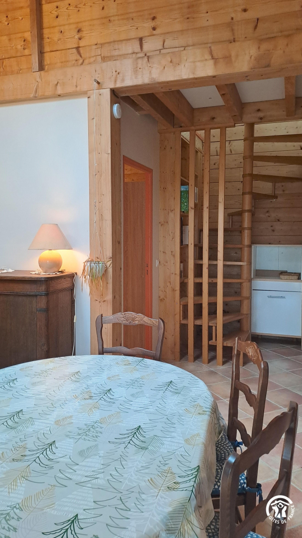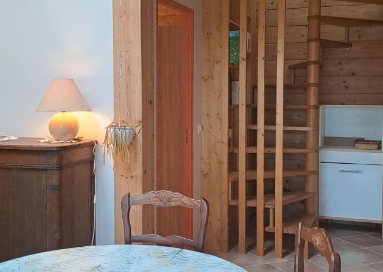 Accès à l’étage avec escalier en colimaçon en bois :