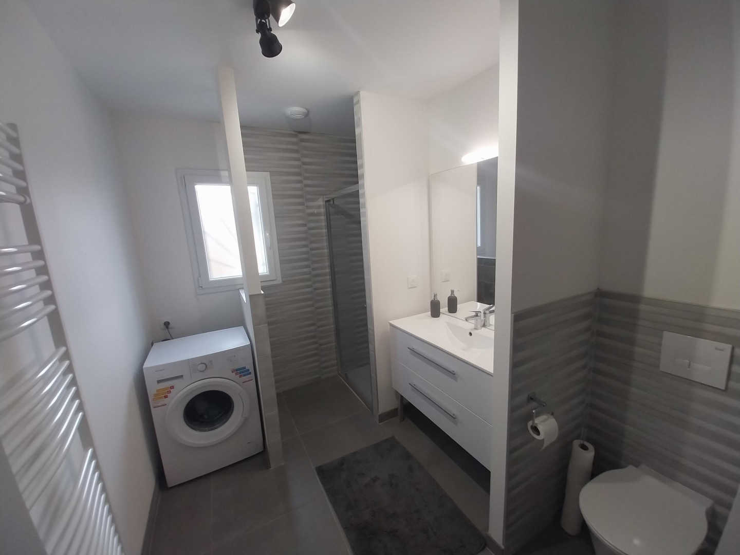 * salle d’eau avec douche, vasque simple, sèche-cheveux, WC et lave-linge