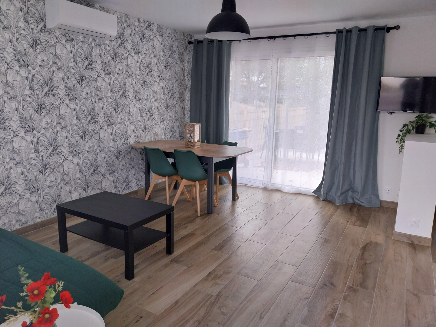 Pièce de vie avec salon, table à manger et cuisine ouverte, baie vitrée donnant sur une terrasse couverte avec jardinet à l’arrière du gîte