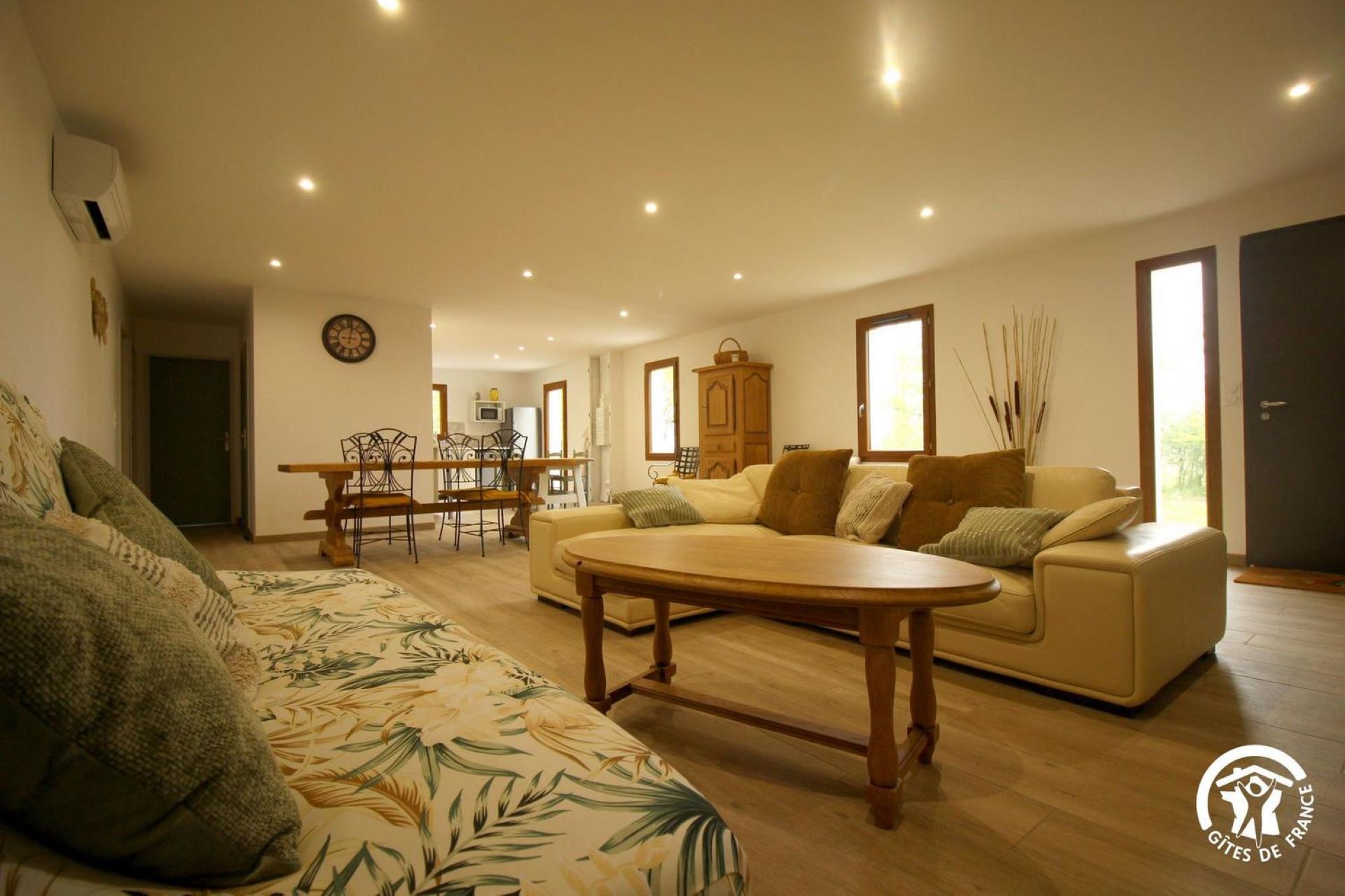 Le gîte propose une spacieuse et lumineuse pièce de vie avec cuisine ouverte entièrement équipée, donnant sur un séjour convivial avec canapé convertible (couchage d’appoint). Vous disposerez également d’une buanderie, d’une salle d’eau avec douche et WC, ainsi que de deux chambres :