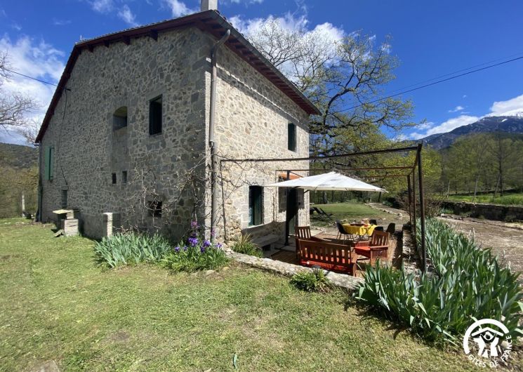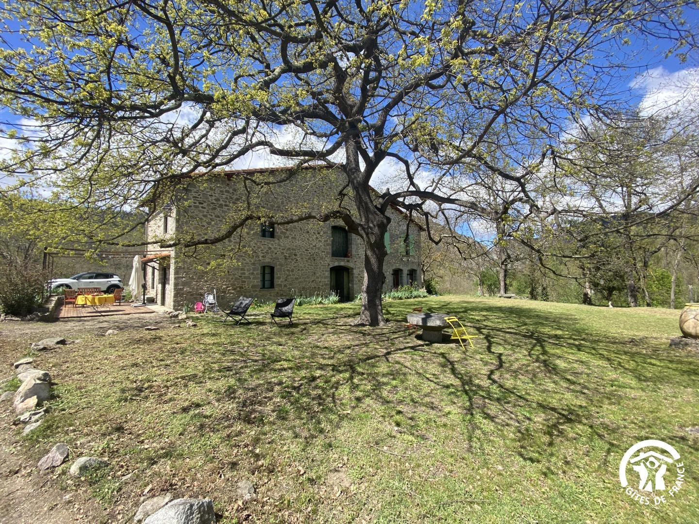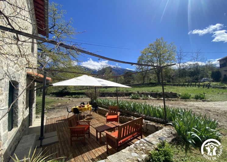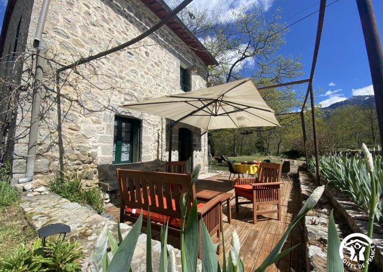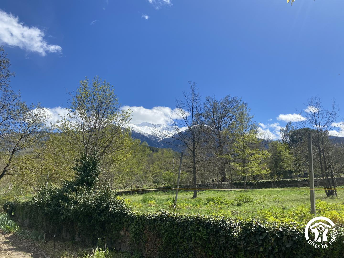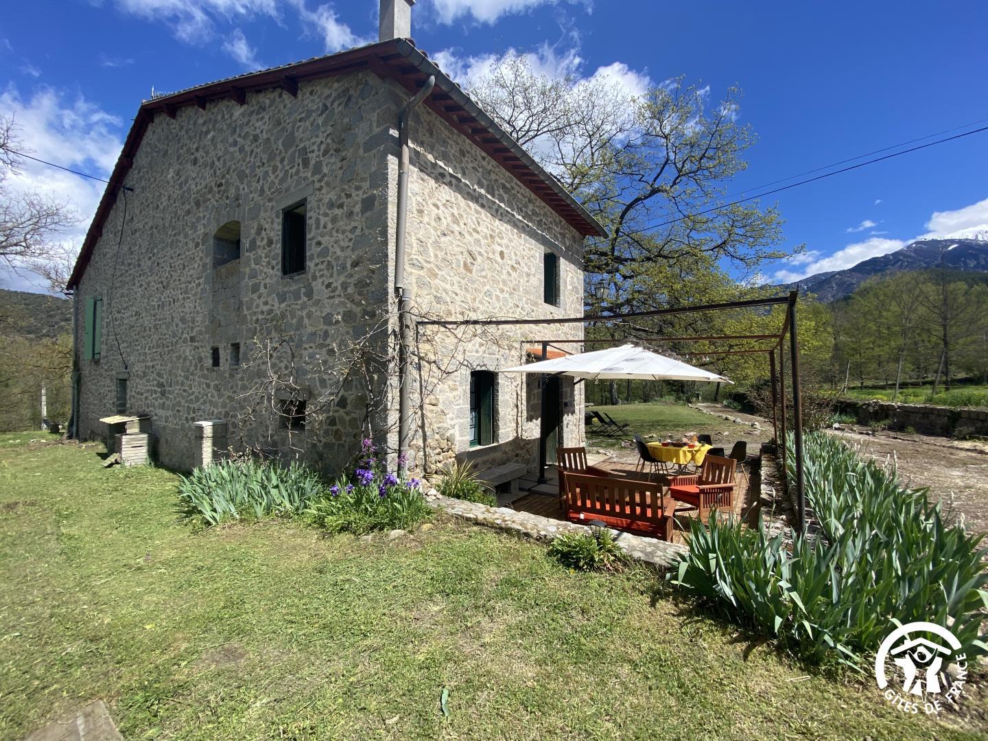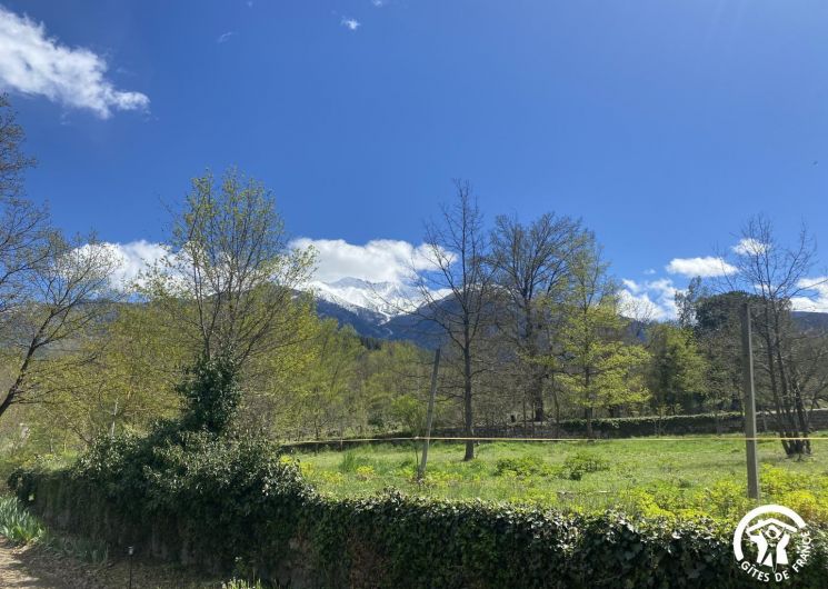 Cette maison de caractère en pierres du 19 ème siècle, rénovée, abrite la résidence du propriétaire, discret, et le gîte, tout en respectant l’intimité de chacun. Le jardin commun non clos, planté d’un chêne centenaire et fleuri, équipé de bains de soleil, offre une vue imprenable sur le Canigou. Un espace extérieur privatif au gîte permet de savourer des moments en toute tranquillité. Le propriétaire accueillant pourra vous indiquer un chemin bucolique menant à la rivière Saint Vincent située à proximité. Depuis chaque pièce, vous apprécierez la vue vers la nature et les montagnes. Rez de chaussée avec accès par deux marches : Cuisine avec espace repas et coin détente ouverte sur la terrasse de 26 m² équipée d’un salon de jardin, Dégagement équipé de jeux, Salle d’eau avec wc séparé par une porte. A l’étage : Un salon : canapé-lit 2 personnes, bibliothèque, Deux chambres communicantes : une chambre avec 1 lit 90×190, puis, en enfilade, une chambre avec 1 lit 160×190. Parking.