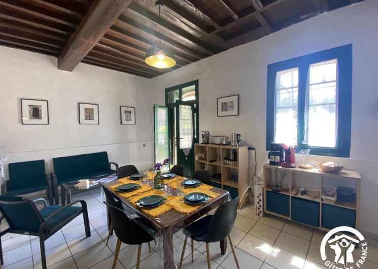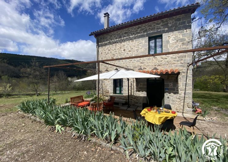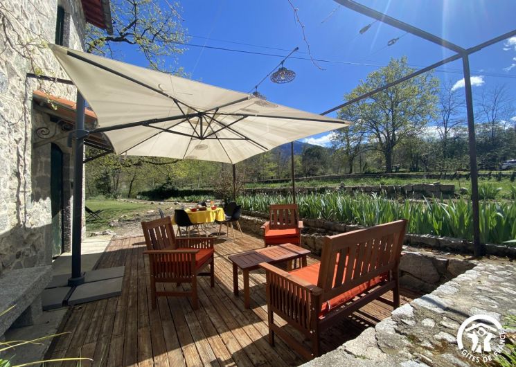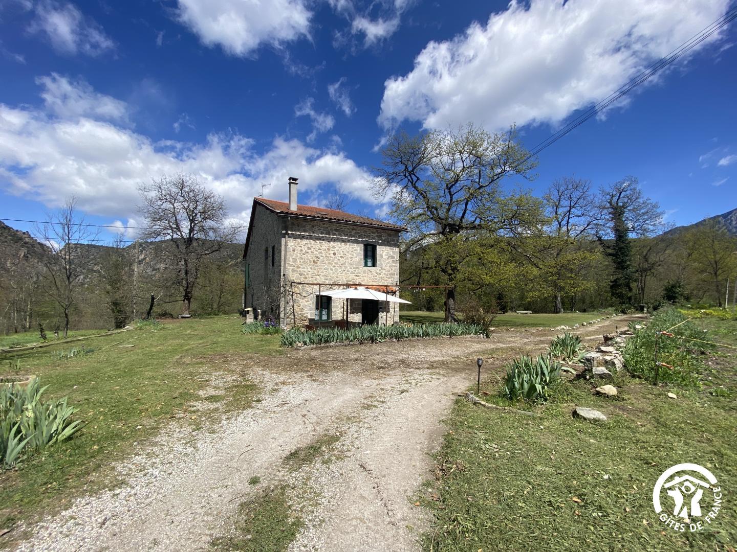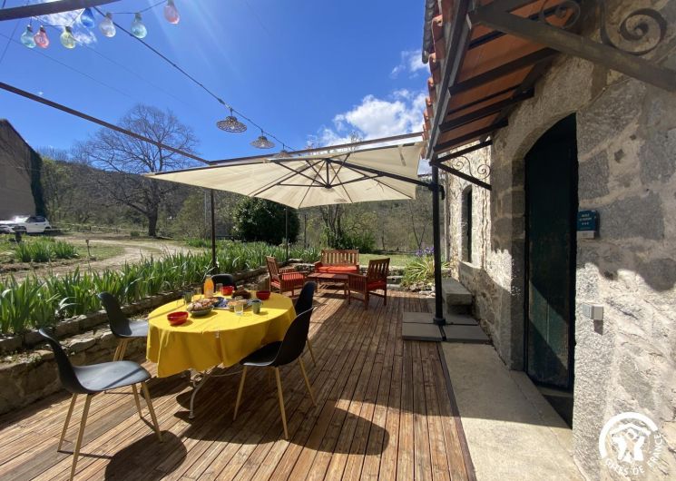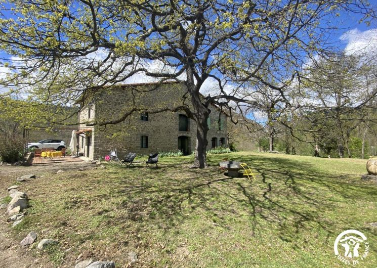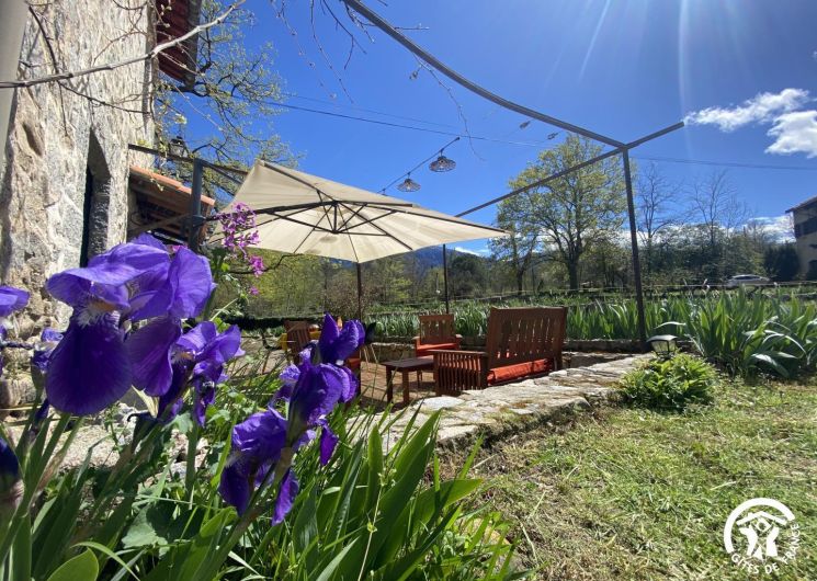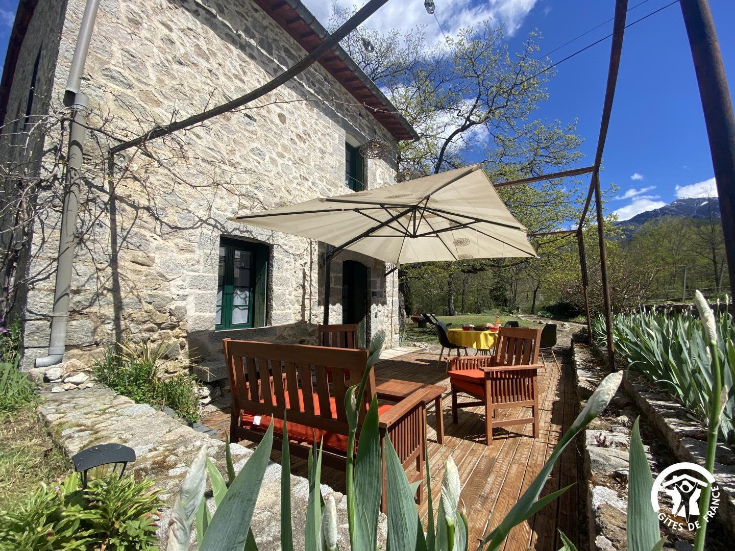 Cette maison de caractère en pierres du 19 ème siècle, rénovée, abrite la résidence du propriétaire, discret, et le gîte, tout en respectant l’intimité de chacun. Le jardin commun non clos, planté d’un chêne centenaire et fleuri, équipé de bains de soleil, offre une vue imprenable sur le Canigou. Un espace extérieur privatif au gîte permet de savourer des moments en toute tranquillité. Le propriétaire accueillant pourra vous indiquer un chemin bucolique menant à la rivière Saint Vincent située à proximité. Depuis chaque pièce, vous apprécierez la vue vers la nature et les montagnes. Rez de chaussée avec accès par deux marches : Cuisine avec espace repas et coin détente ouverte sur la terrasse de 26 m² équipée d’un salon de jardin, Dégagement équipé de jeux, Salle d’eau avec wc séparé par une porte. A l’étage : Un salon : canapé-lit 2 personnes, bibliothèque, Deux chambres communicantes : une chambre avec 1 lit 90×190, puis, en enfilade, une chambre avec 1 lit 160×190. Parking.