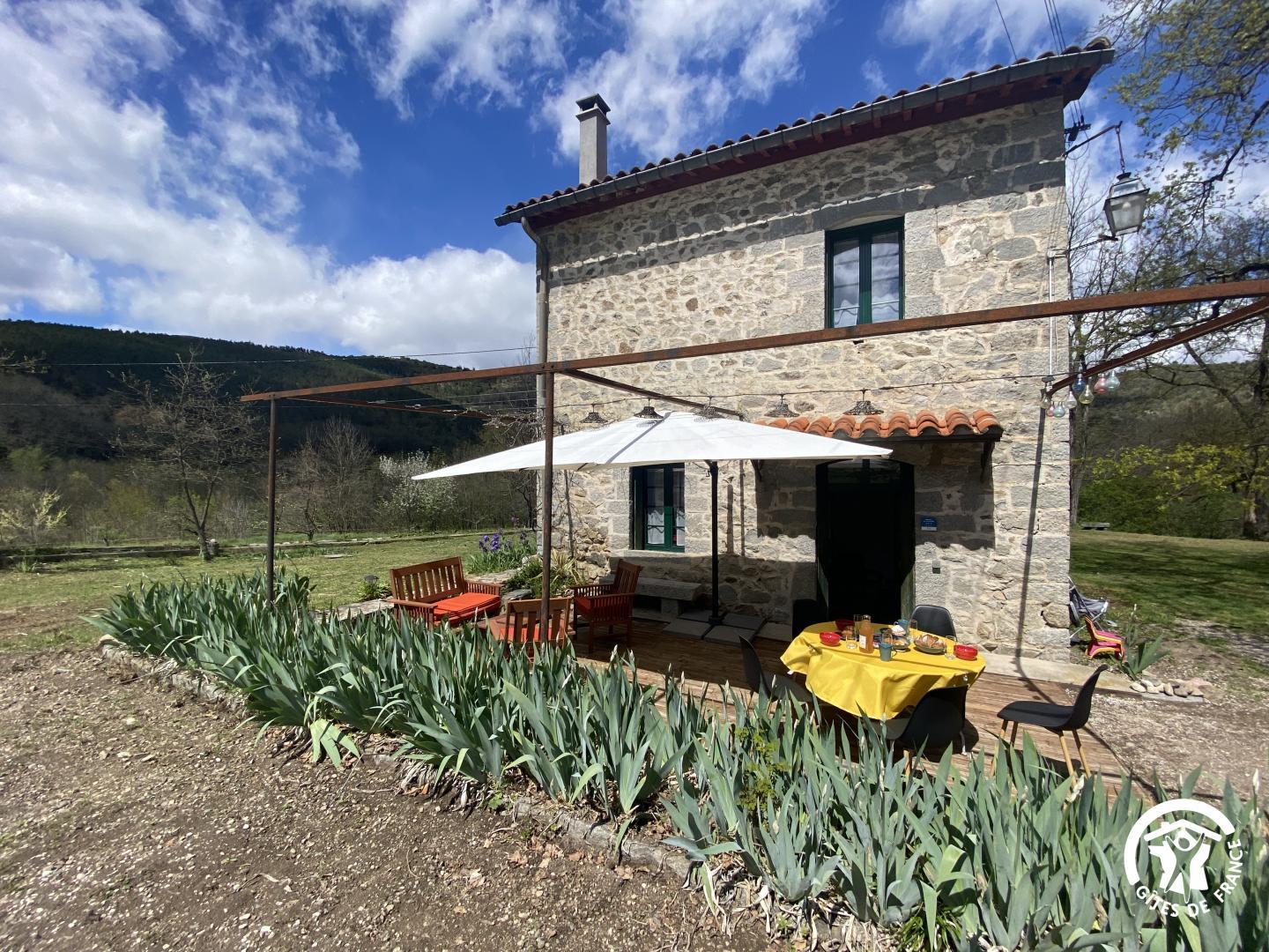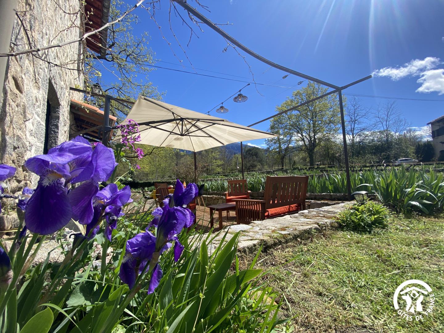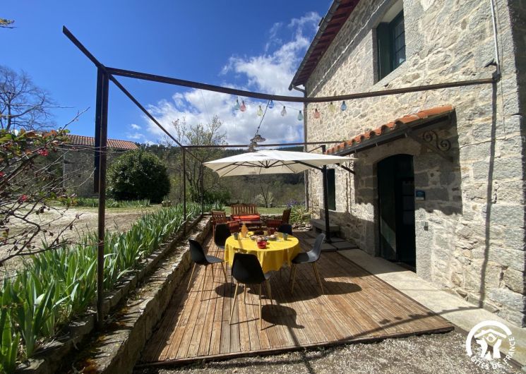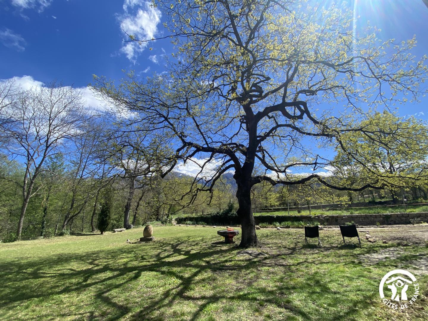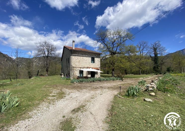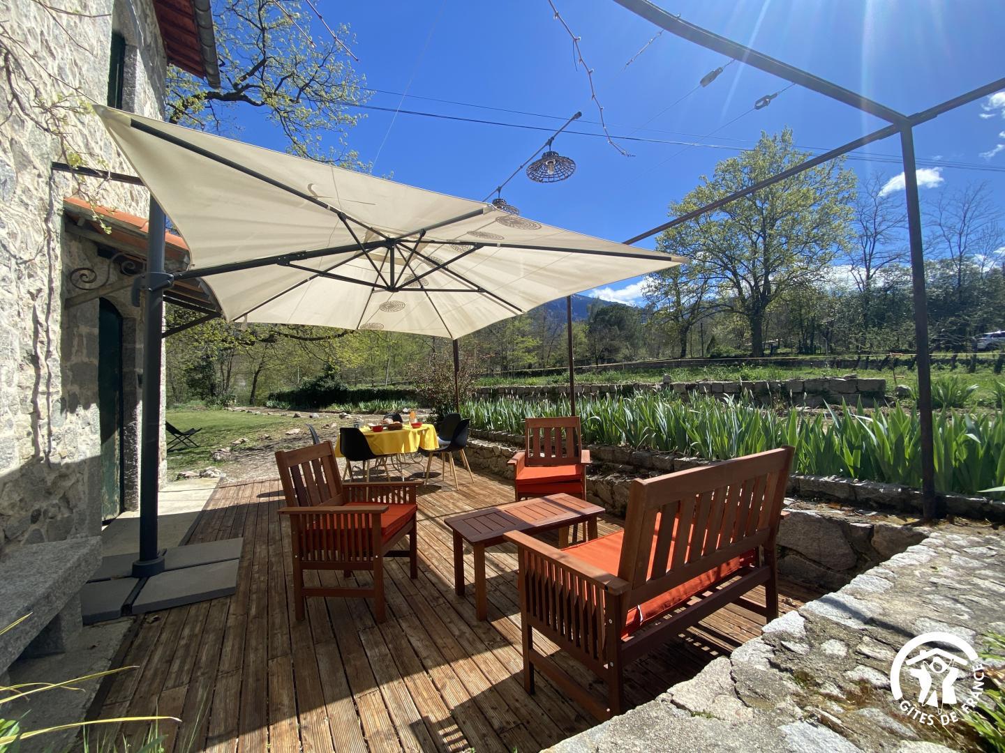 Cette maison de caractère en pierres du 19 ème siècle, rénovée, abrite la résidence du propriétaire, discret, et le gîte, tout en respectant l’intimité de chacun. Le jardin commun non clos, planté d’un chêne centenaire et fleuri, équipé de bains de soleil, offre une vue imprenable sur le Canigou. Un espace extérieur privatif au gîte permet de savourer des moments en toute tranquillité. Le propriétaire accueillant pourra vous indiquer un chemin bucolique menant à la rivière Saint Vincent située à proximité. Depuis chaque pièce, vous apprécierez la vue vers la nature et les montagnes. Rez de chaussée avec accès par deux marches : Cuisine avec espace repas et coin détente ouverte sur la terrasse de 26 m² équipée d’un salon de jardin, Dégagement équipé de jeux, Salle d’eau avec wc séparé par une porte. A l’étage : Un salon : canapé-lit 2 personnes, bibliothèque, Deux chambres communicantes : une chambre avec 1 lit 90×190, puis, en enfilade, une chambre avec 1 lit 160×190. Parking.