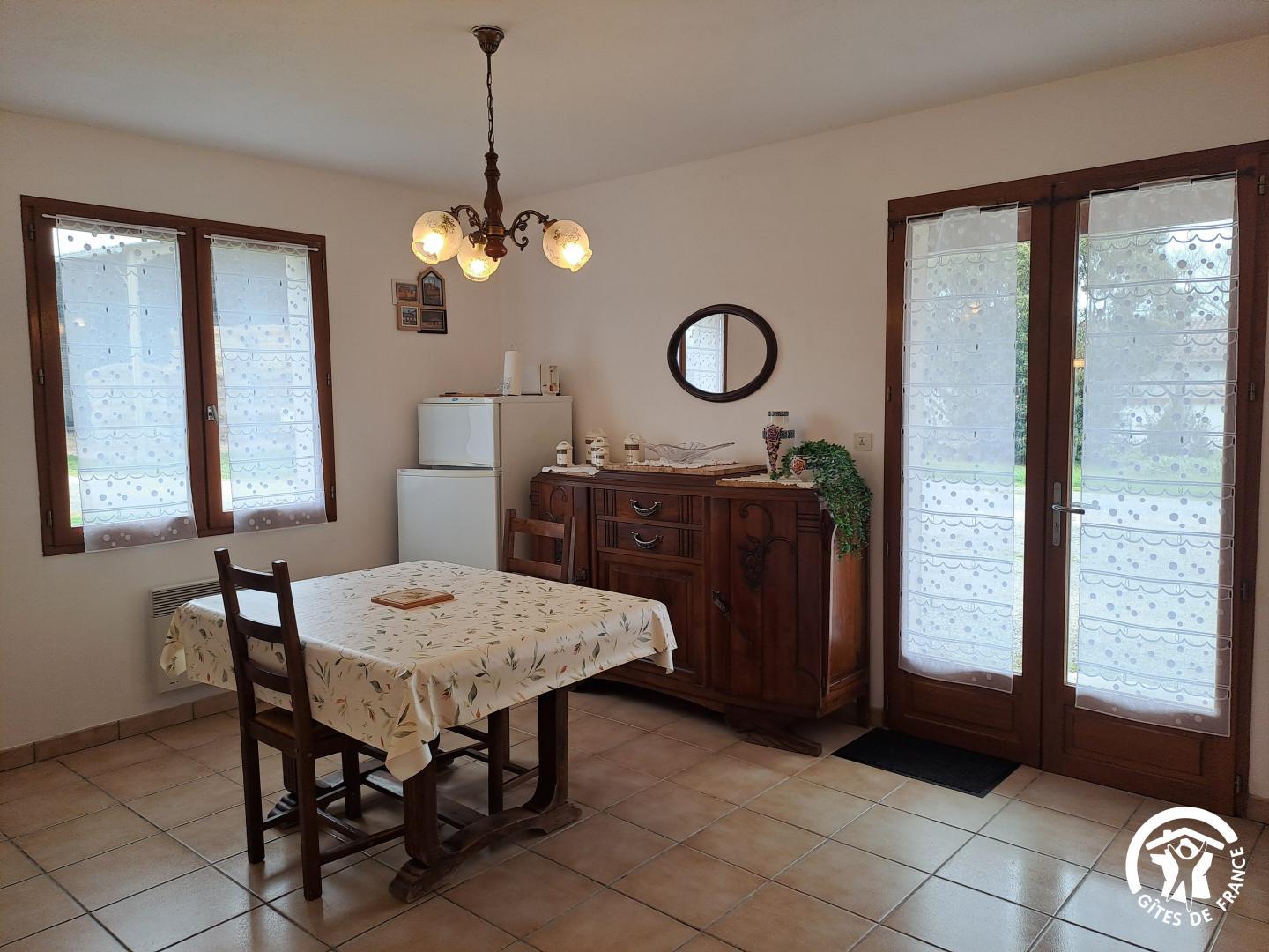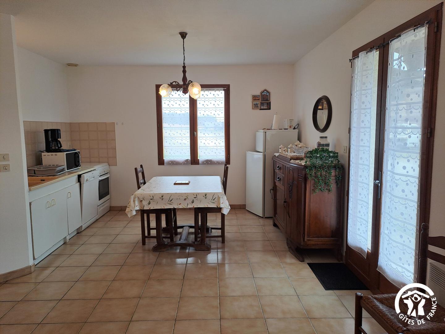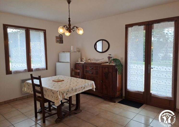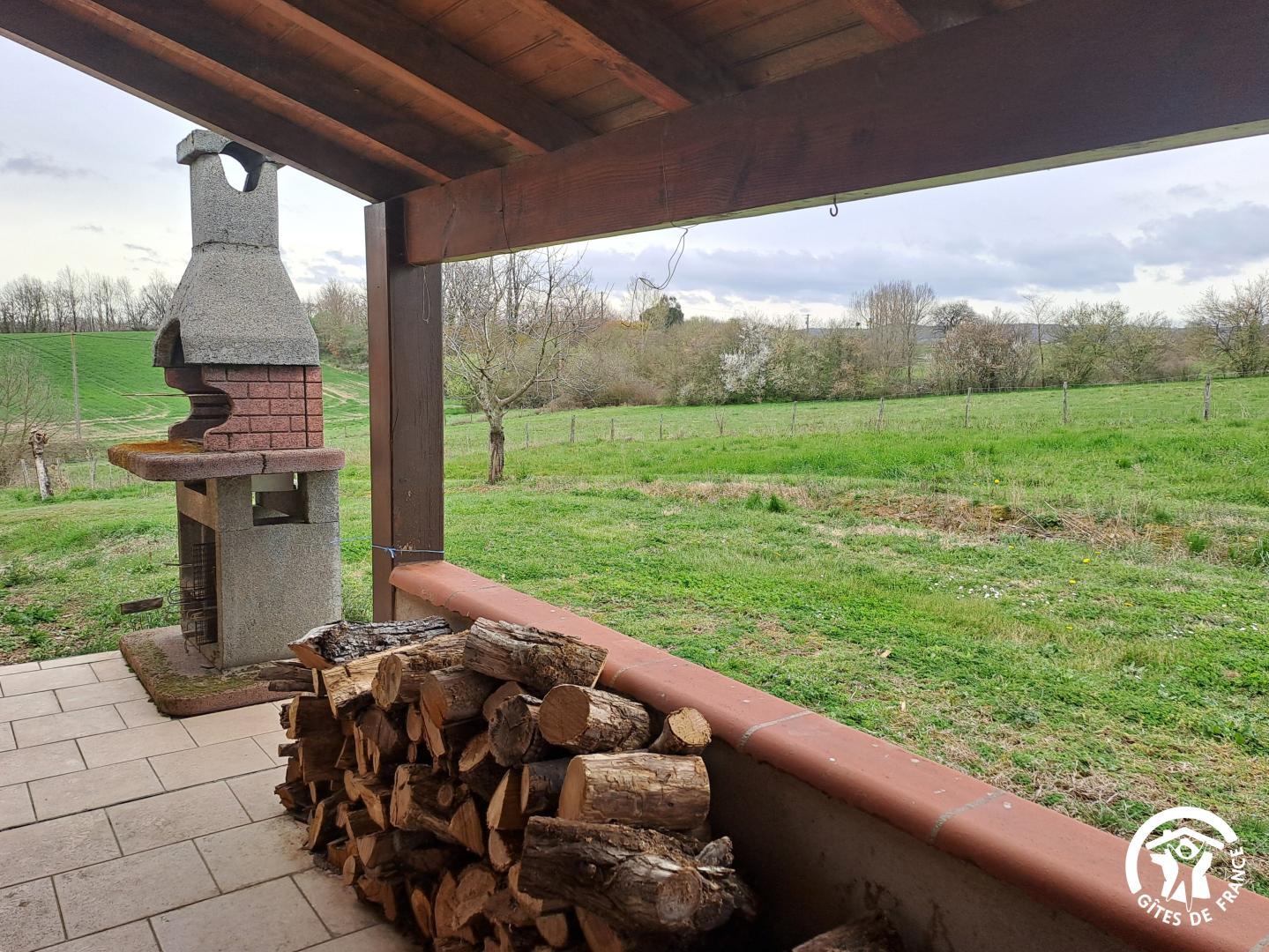 L’un des atouts du gîte est sa terrasse couverte, un véritable espace de vie extérieur, où l’on profite aussi bien des matinées ensoleillées que des douces soirées. Aménagée avec un salon de jardin et un barbecue, elle donne directement sur un espace de verdure.