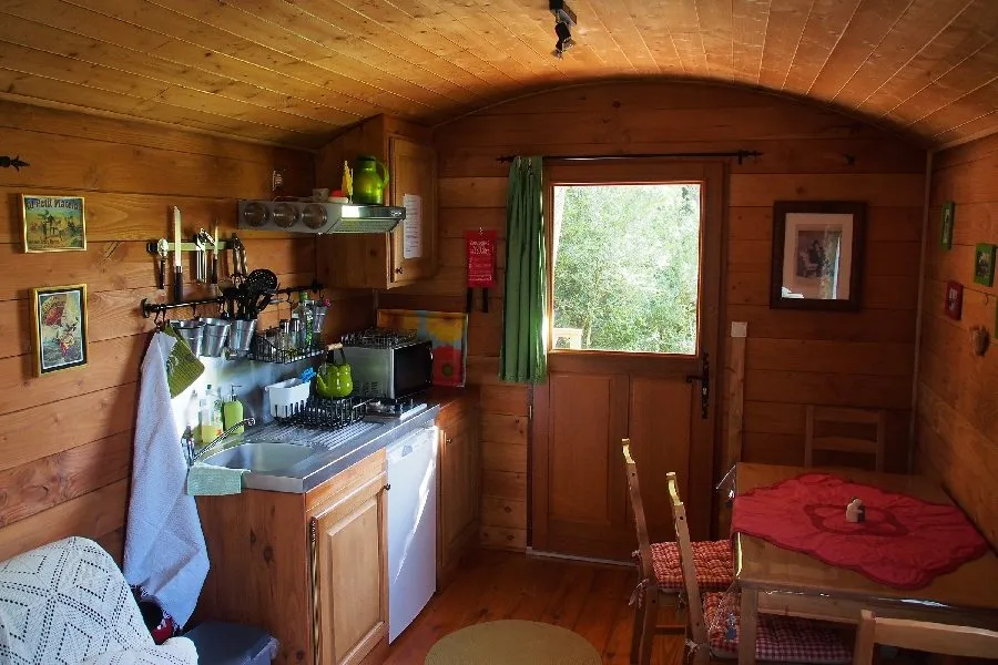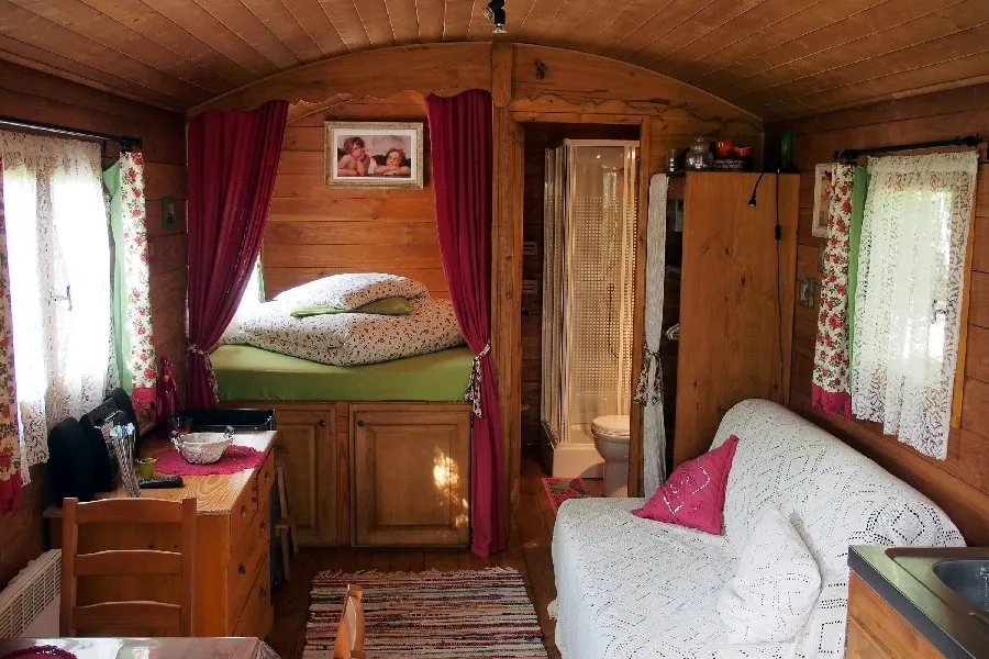 Ce gîte style « tiny house » est aménagé dans une roulotte, un petit espace bien réfléchi avec une décoration soignée.