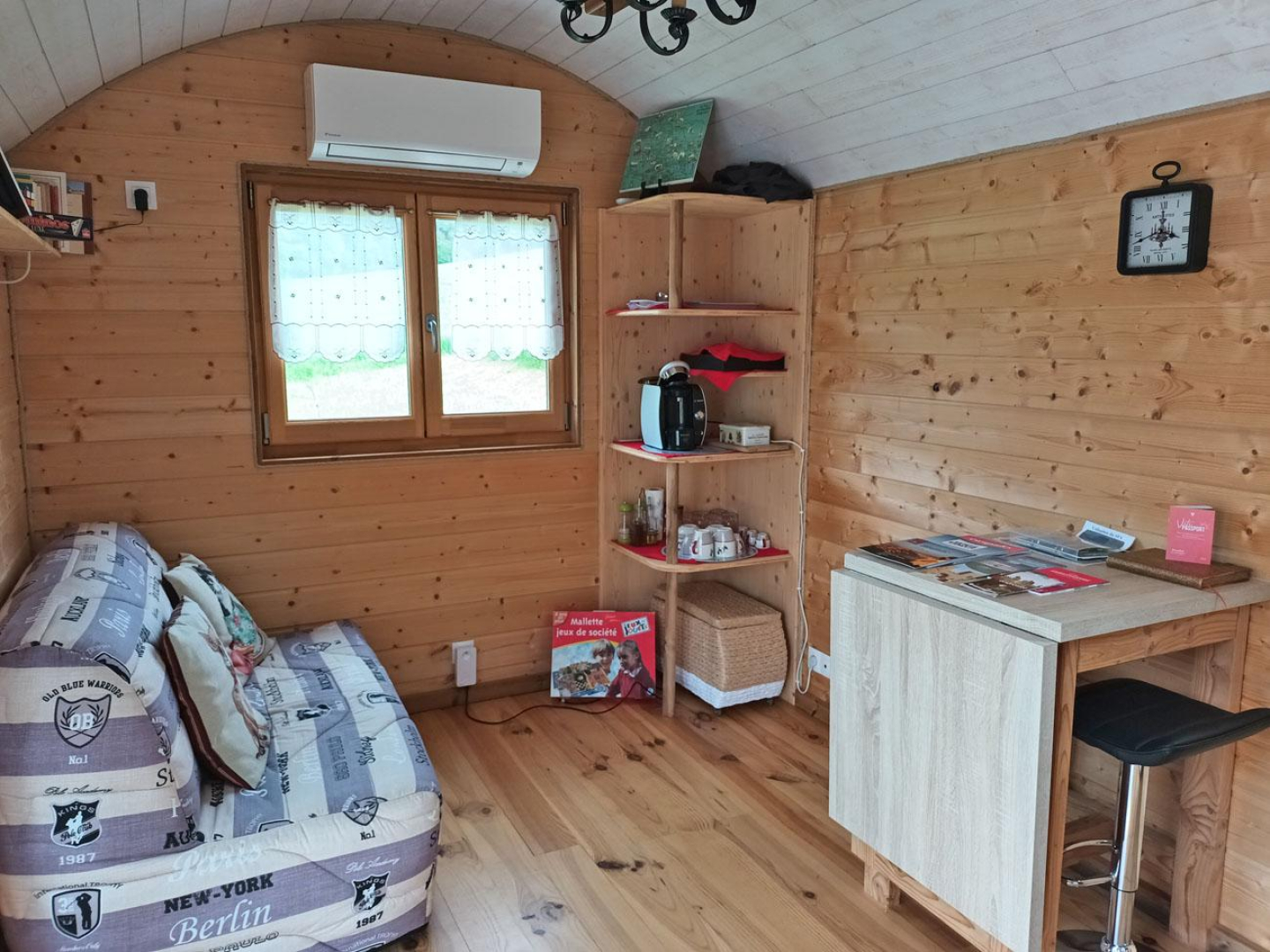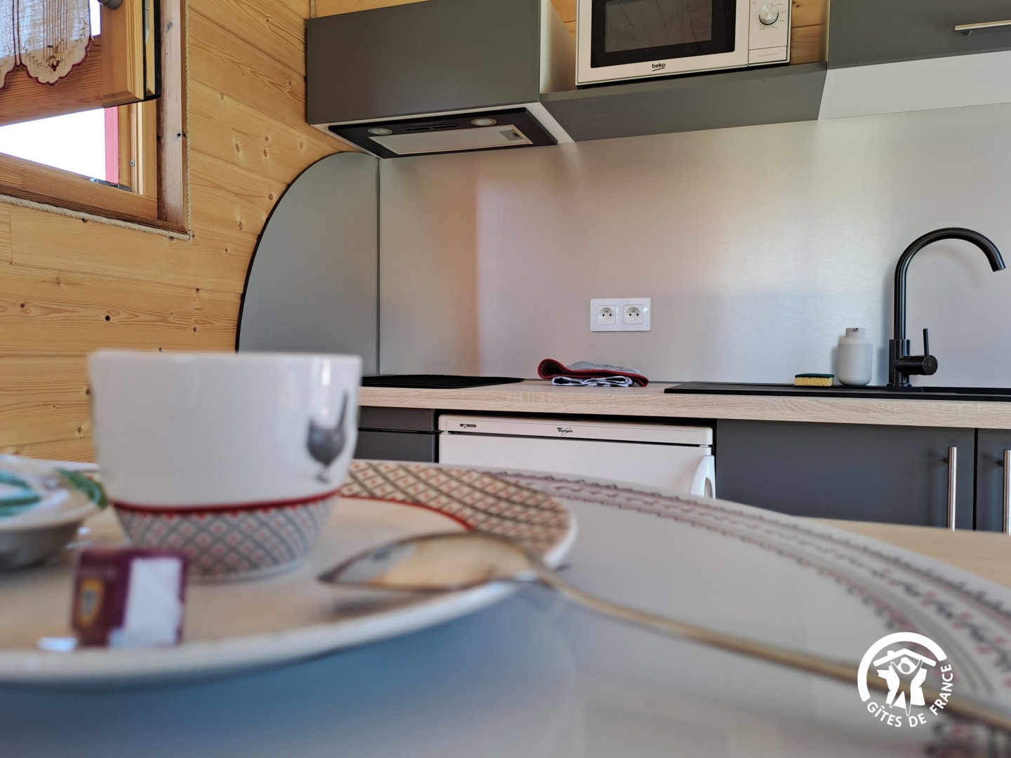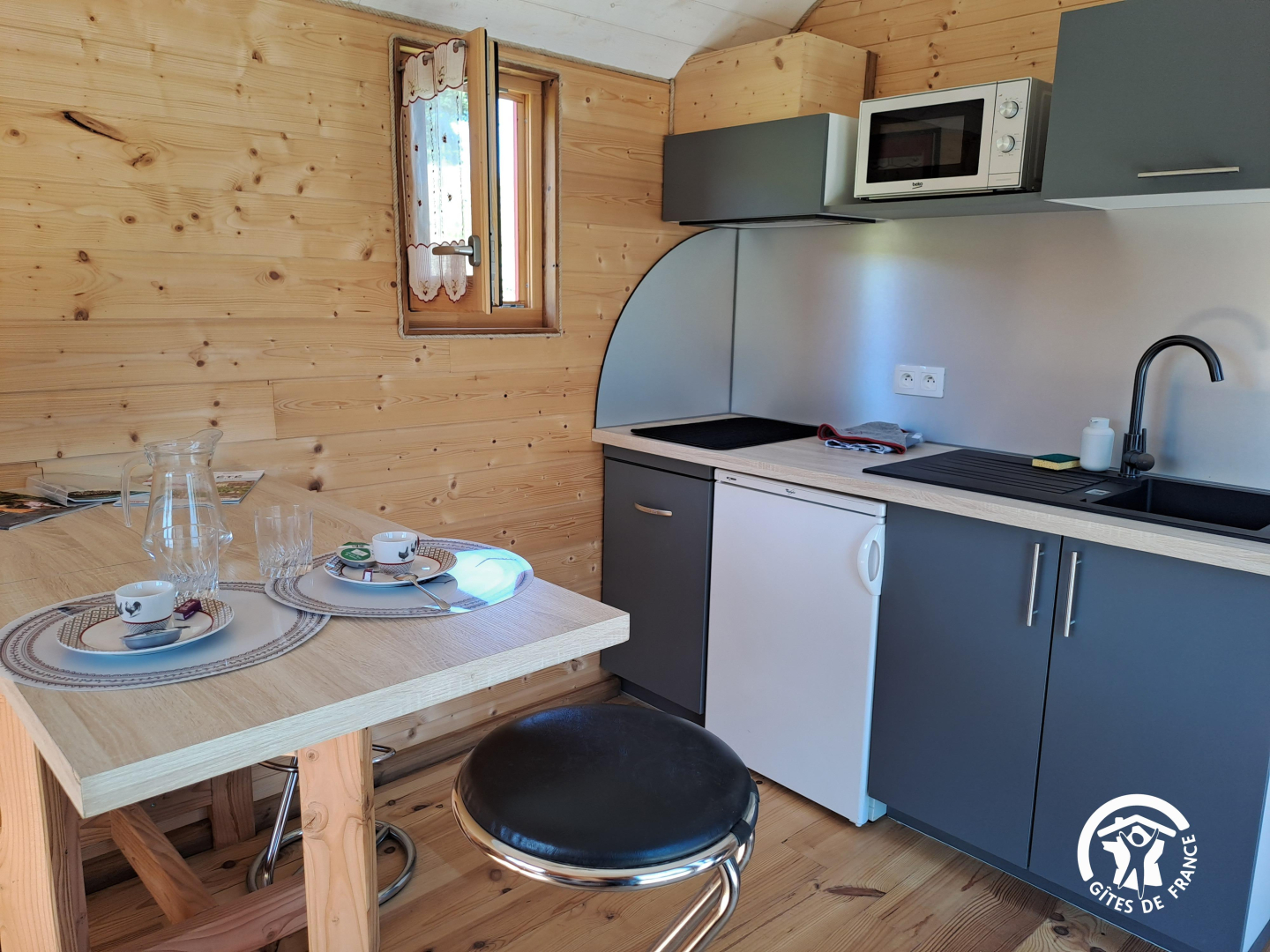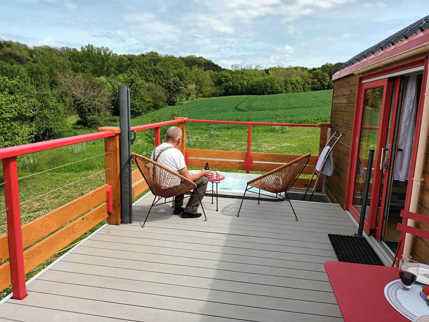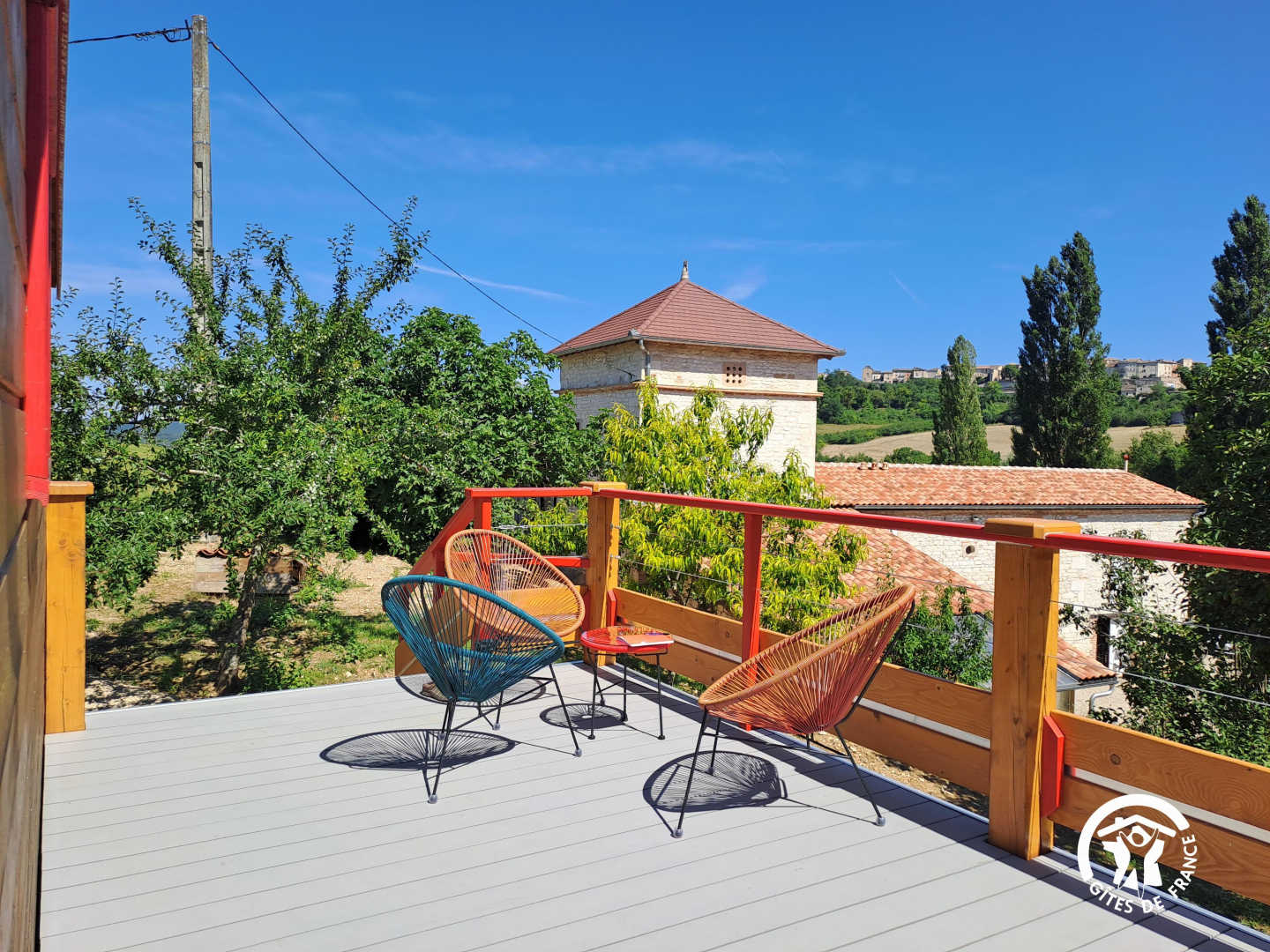 Une jolie roulotte toute en bois pour 2 personnes, au pied de Castelnau-de-Montmiral, avec un spa intégré sur la terrasse et la climatisation en cas de fortes chaleurs