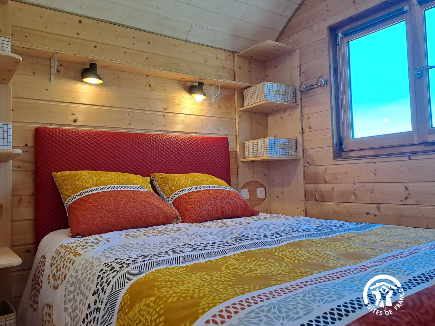 Pièce à vivre avec canapé, table, tabourets de bar et coin cuisine comprenant : plaque à induction, lave-vaisselle, micro-ondes et machine à café à dosettes Tassimo Chambre avec lit double en 140 x 200, étagères de rangement.