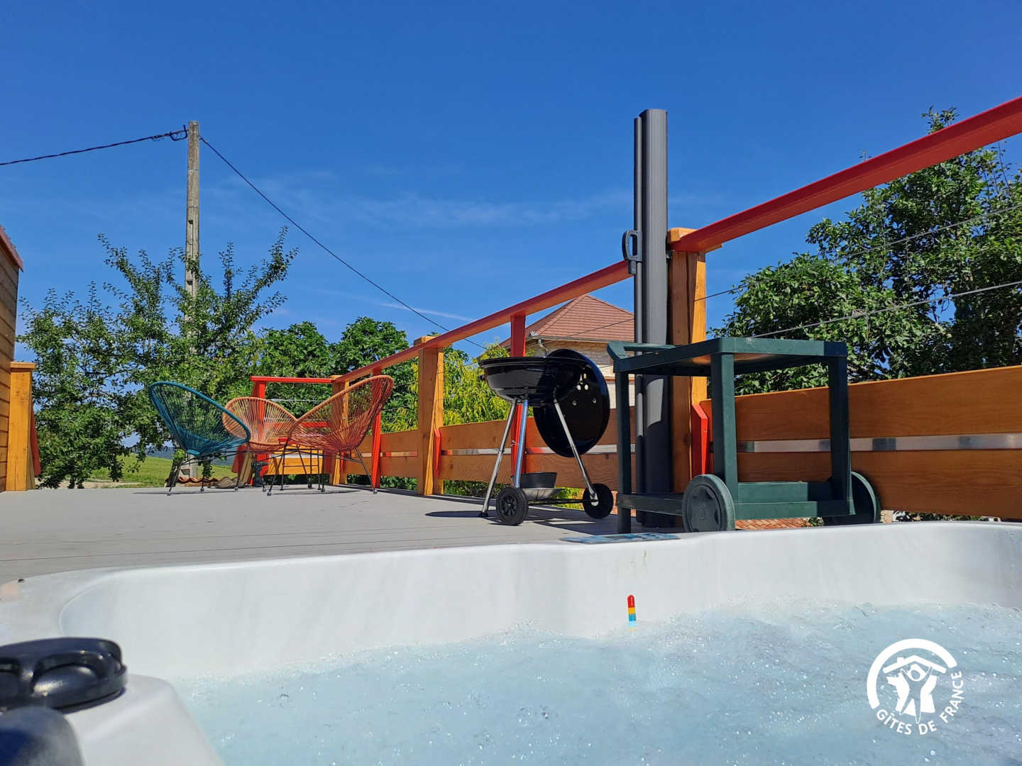 Terrasse de 26 m² avec Spa intégré, table basse de jardin et fauteuils type Acapulco, barbecue, jeux de société, boules de pétanque.