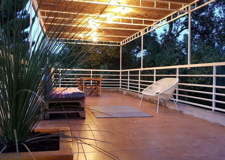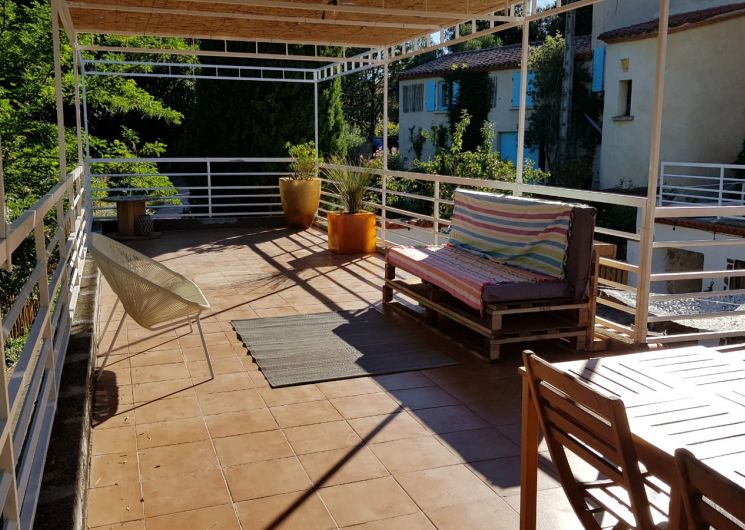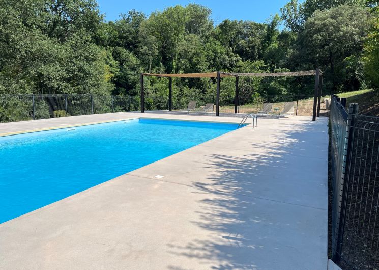Appartement situé au 1er étage, pleine nature, composé d’un coin cuisine équipé, salon, séjour 1 ch (lit 160) 1 lit 140 dans le salon, grande terrasse privée avec pergola, piscine et jardin partagés.