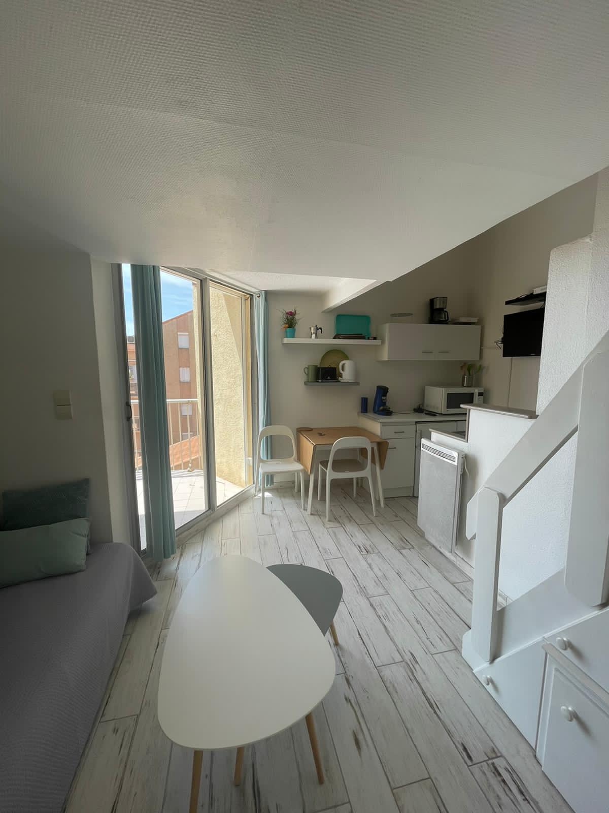 Un escalier étroit et raide relie le séjour (en bas) à la chambre et la cabine (à l’étage) . Appartement non fumeur ( fumer sur la terrasse uniquement ). Situé dans un quartier calme vous êtes à deux pas des commerces et de la plage. Le stationnement est gratuit dans la rue ou sur les parkings à proximité, wifi gratuit , TV écran plat 80cm.