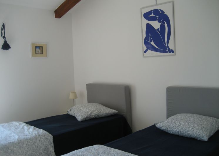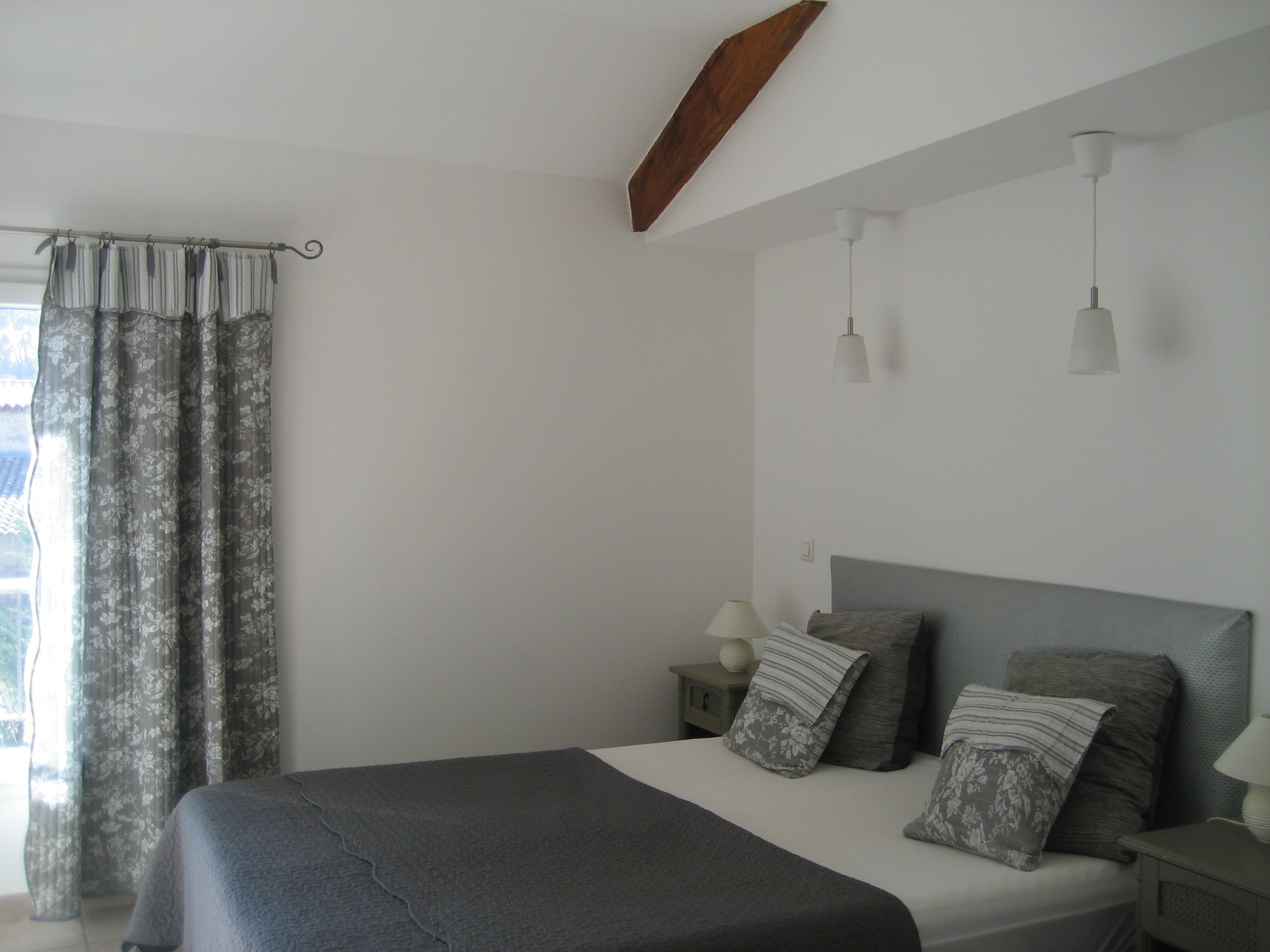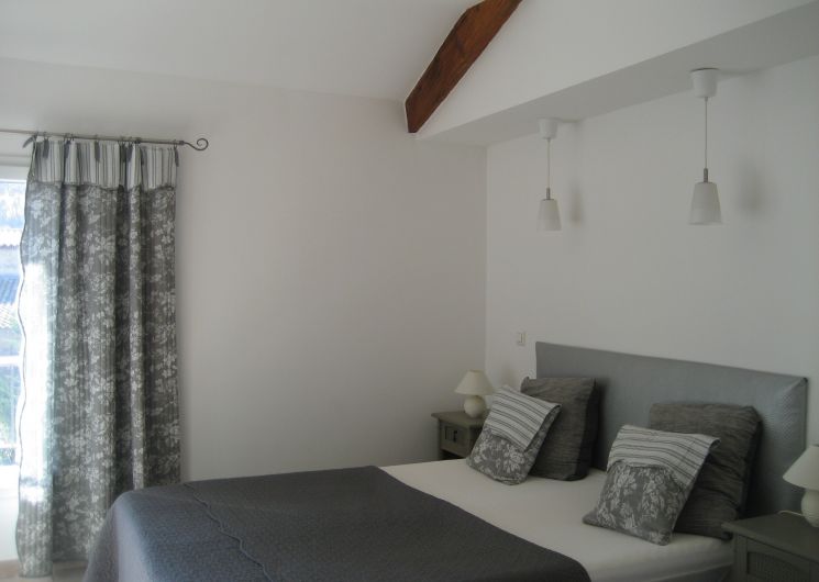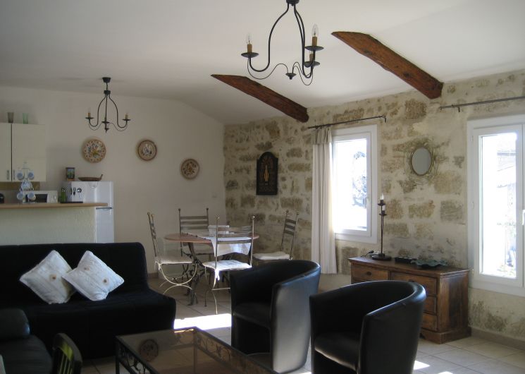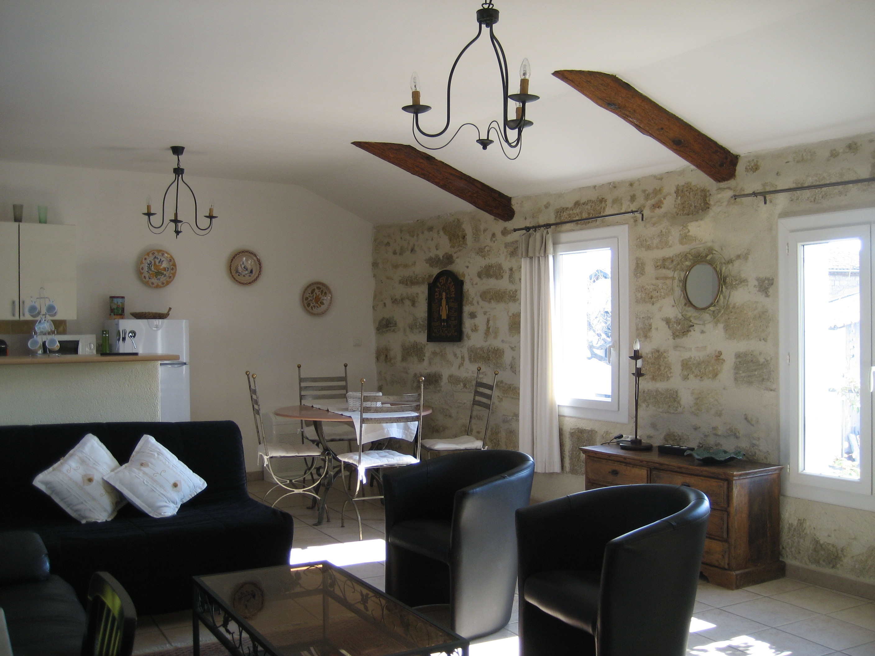 A l’étage, l’appartement s’étend sur 70 m² ; il est très lumineux et entièrement climatisé. Grand séjour de caractère avec poutres et pierres apparentes : cuisine ouverte et coin repas, salon télévision avec 2 canapés et 2 fauteuils, coin wifi / bureau. Couloir desservant les 2 chambres, la salle d’eau et les WC séparés.
