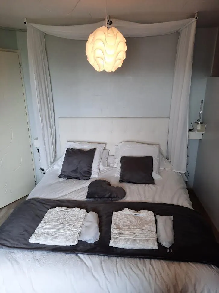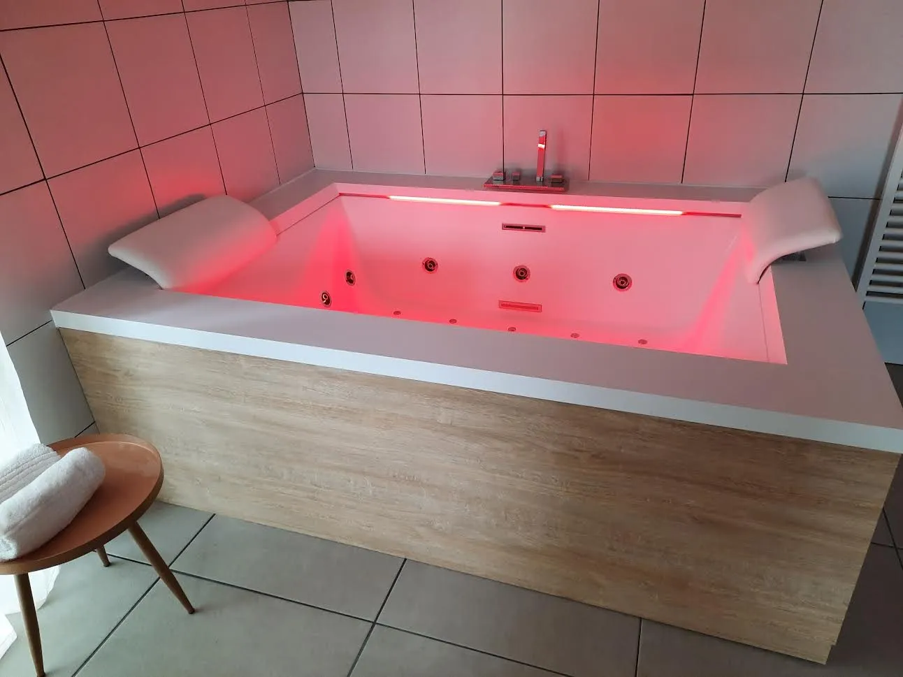 – 1 espace détente avec sauna pour 2 personnes, baignoire balnéo 2 places avec jets d’eau et d’air, peignoirs disponibles, chaises longues confortables.