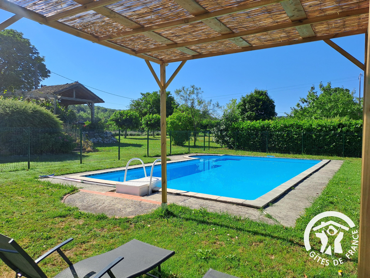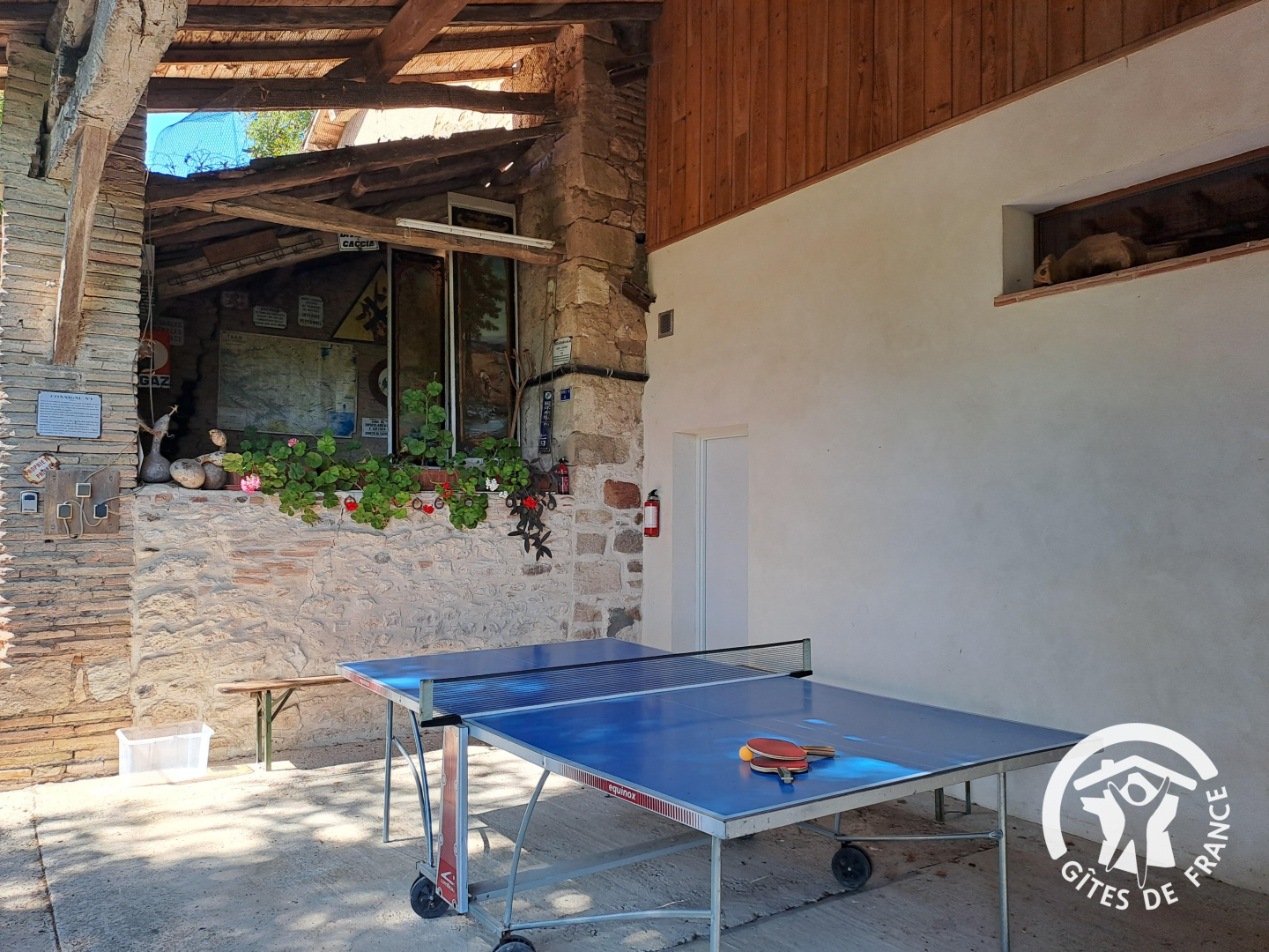 – A l’extérieur, vous disposez d’une grande terrasse, un appentis couvert dédié aux jeux avec une table de ping-pong, un salon de jardin, un barbecue fabriqué main. La piscine est sécurisée par une barrière, elle est accessible aux locataires entre 9h30 et 21h.