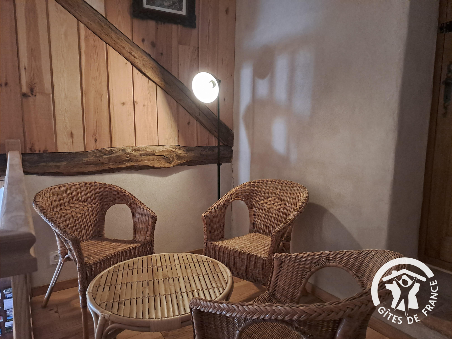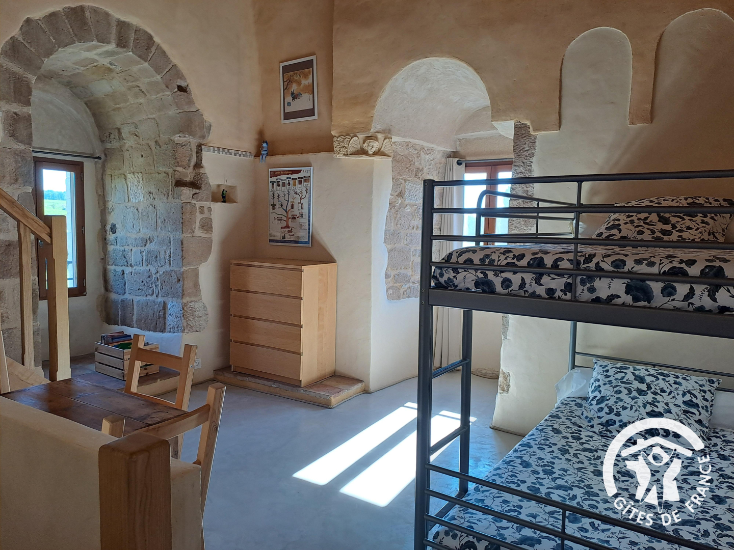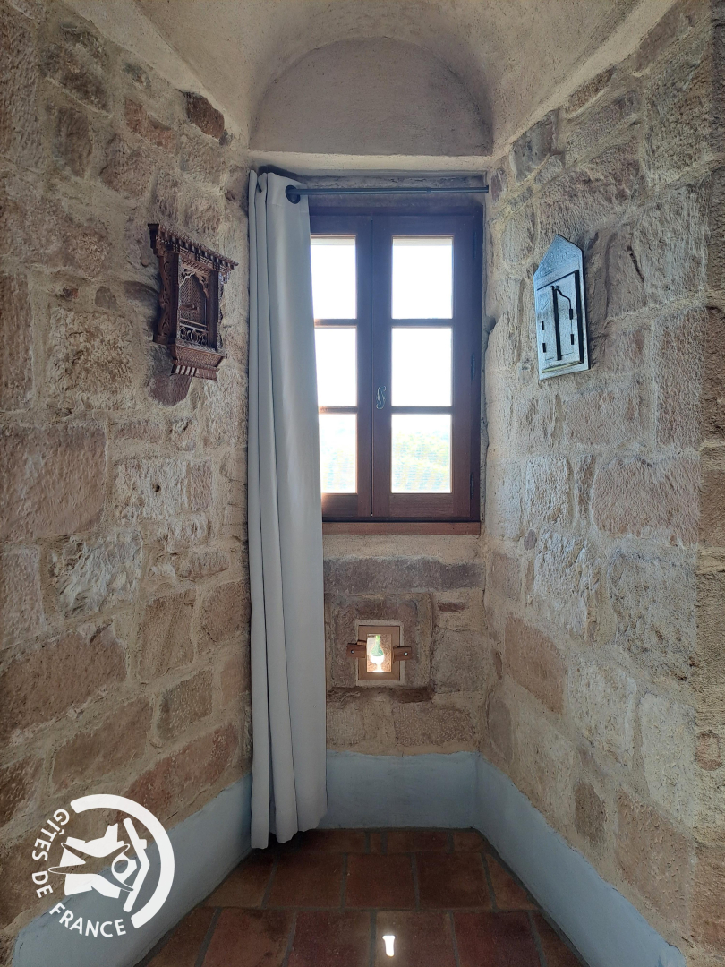 Le gîte est mitoyen à l’habitation des propriétaires. Il est aménagé sur plusieurs niveaux, jusqu’à atteindre le sommet de la tour.