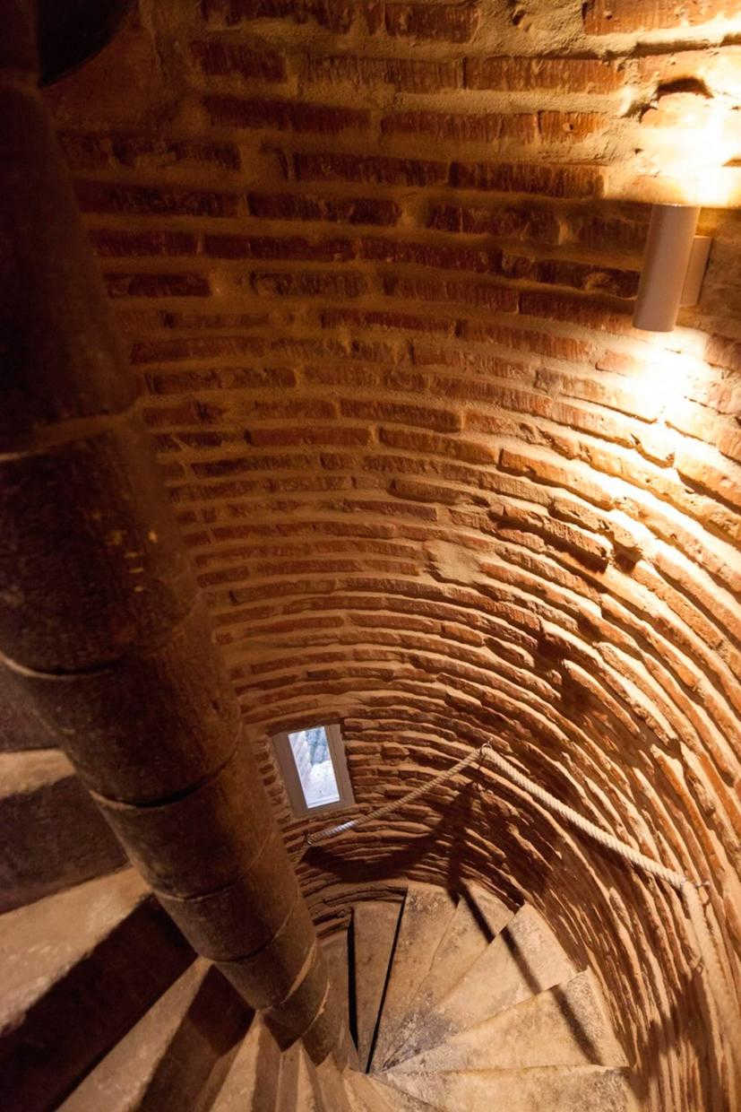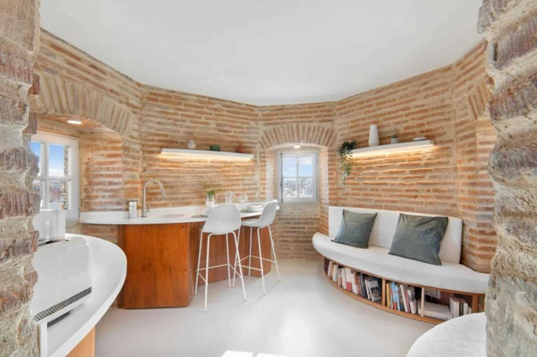 L’appartement en triplex, au confort haut-de-gamme, est accessible par un escalier en pierre en colimaçon de 110 marches (main courante en corde). Aménagé dans le haut de la tour, il est tourné vers la cour intérieure (façades et entrée en cours de rénovation). Les trois pièces superposées sont circulaires et mesurent environ 9m² chacune. Leurs plafonds en croisées d’ogives sont remarquables. Au niveau bas de l’appartement : la salle d’eau avec WC. Au niveau au-dessus : la chambre double avec un lit pour 2 personnes en 160cm. Au dernier niveau : le séjour avec coin-cuisine et espace détente, qui ménage une vue imprenable sur les toits par trois fenêtres balayant chacune une portion de la ville comme le ferait une table d’orientation ; par temps clair, on peut même apercevoir la chaîne des Pyrénées !
