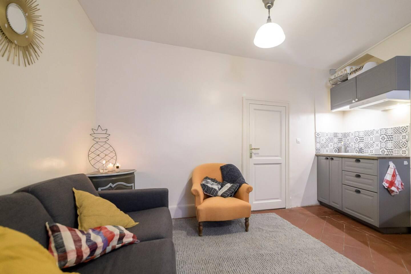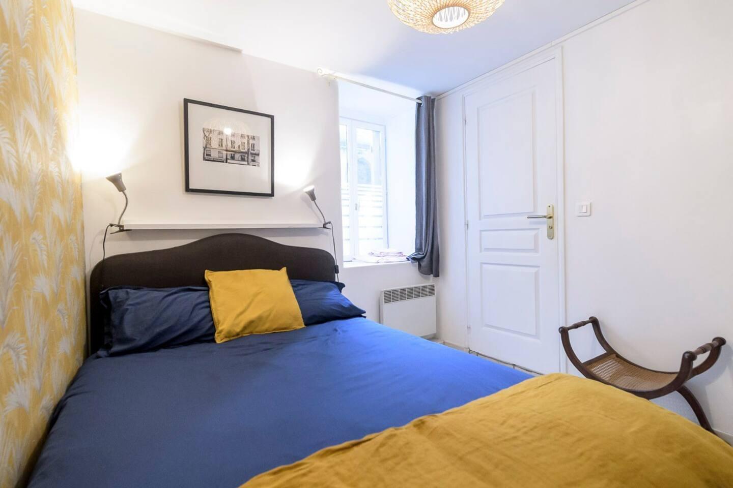 Le salon comporte un canapé lit pour 2 personnes et dans la chambre séparée un lit en 140. Animaux bienvenus avec demande préalable. Draps, housses de couette et serviettes fournies. Maison de rue, murs épais, tomettes au sol.
