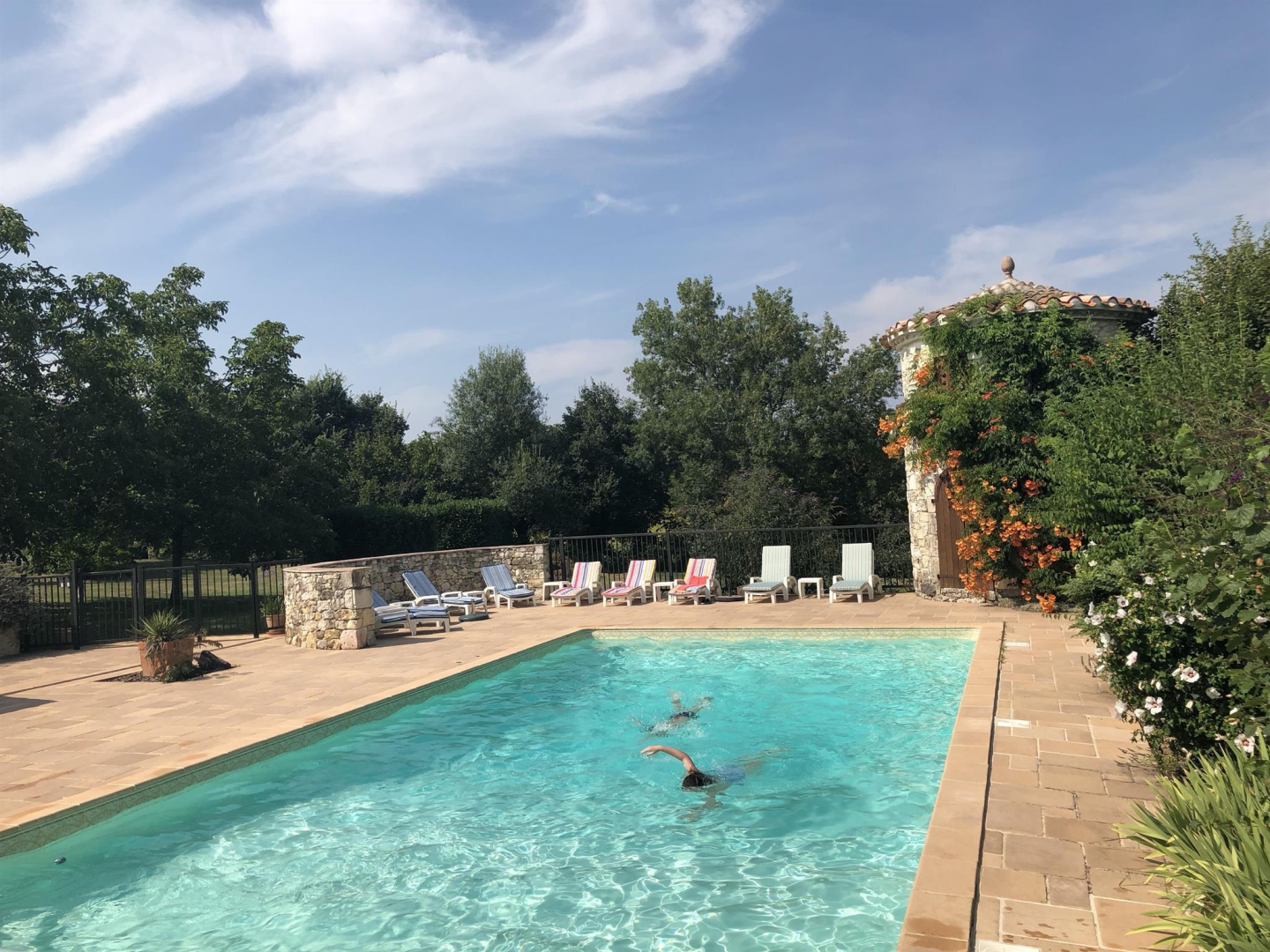 Piscine 12x6m, terrasse, barbecue, transats. La piscine et la terrasse sont clôturées et il y a deux portes d’accès « sécurité enfants ». La piscine a une partie peu profonde avec de larges marches d’angle. Belle pelouse et parties ombragées bienvenues en été.