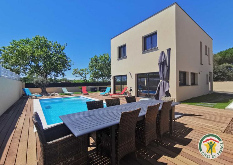 Elle se compose d’une cuisine familiale entièrement équipée et du salon/salle à manger au rez-de-chaussée ainsi que d’une suite parentale avec salle d’eau-wc. A l’étage vous trouverez 3 chambres confortables ( 2 chambres avec un lit double (160) ainsi qu’une chambre avec deux lits simples (90) pouvant devenir un grand lit double) , 1 salle d’eau, WC, et de tous les équipements pour un séjour de rêve. Détendez-vous dans le jardin, où vous pourrez profiter de la piscine extérieure chauffée du mois d’avril au mois d’octobre (dimensions : 7m de longueur et 3,50m de largeur. Profondeur 1,5m) , d’un espace barbecue avec sa cuisine d’été. Idéal pour une escapade en famille ou entres amis. ATTRAITS TOURISTIQUES : Agde (cité phocéenne), Cap d’Agde (station balnéaire), Béziers (Cathédrale, Canal du Midi, les 9 écluses), le Bassin de Thau (parcs ostréicoles), Pézenas (cité de Molière).