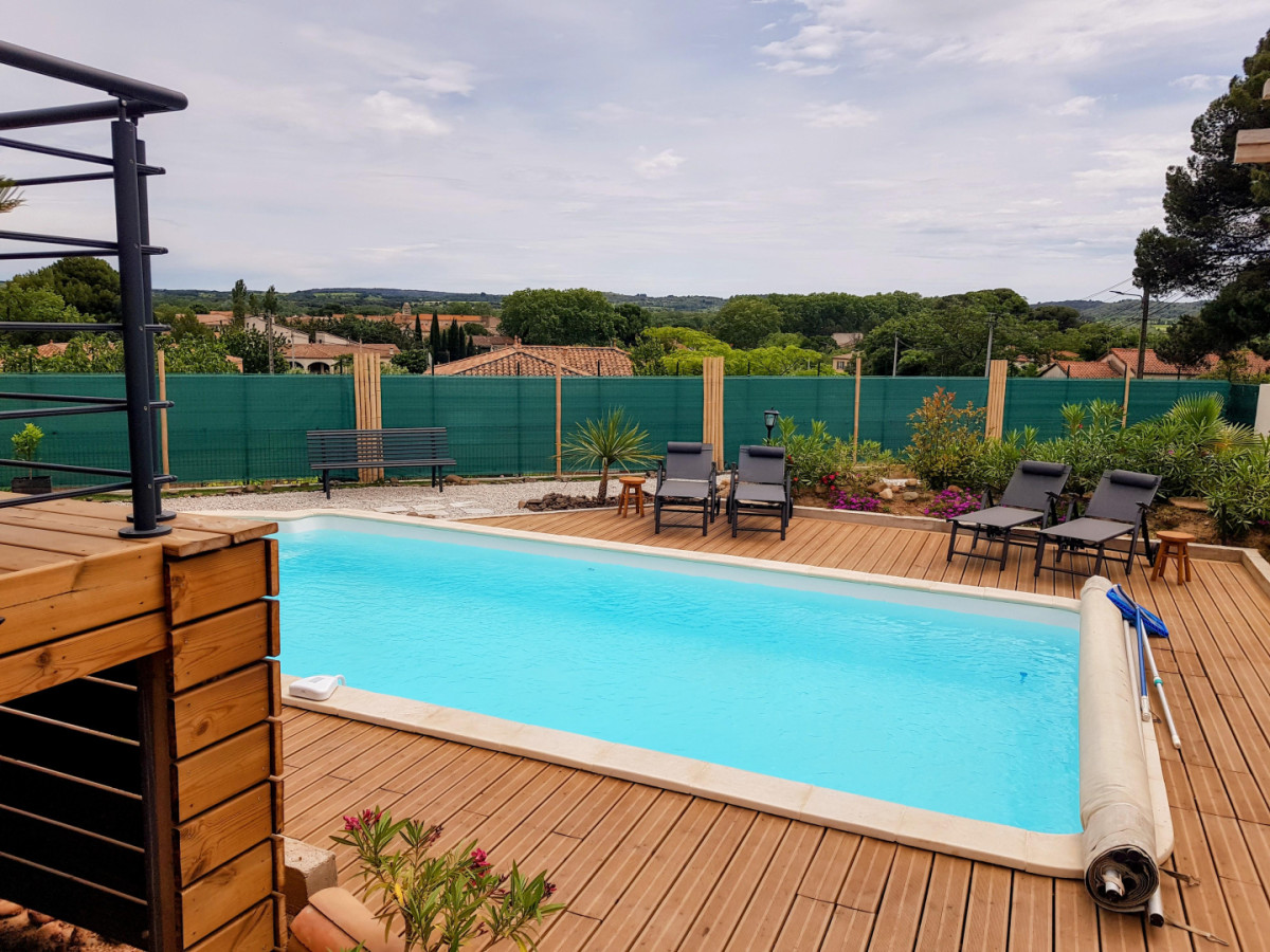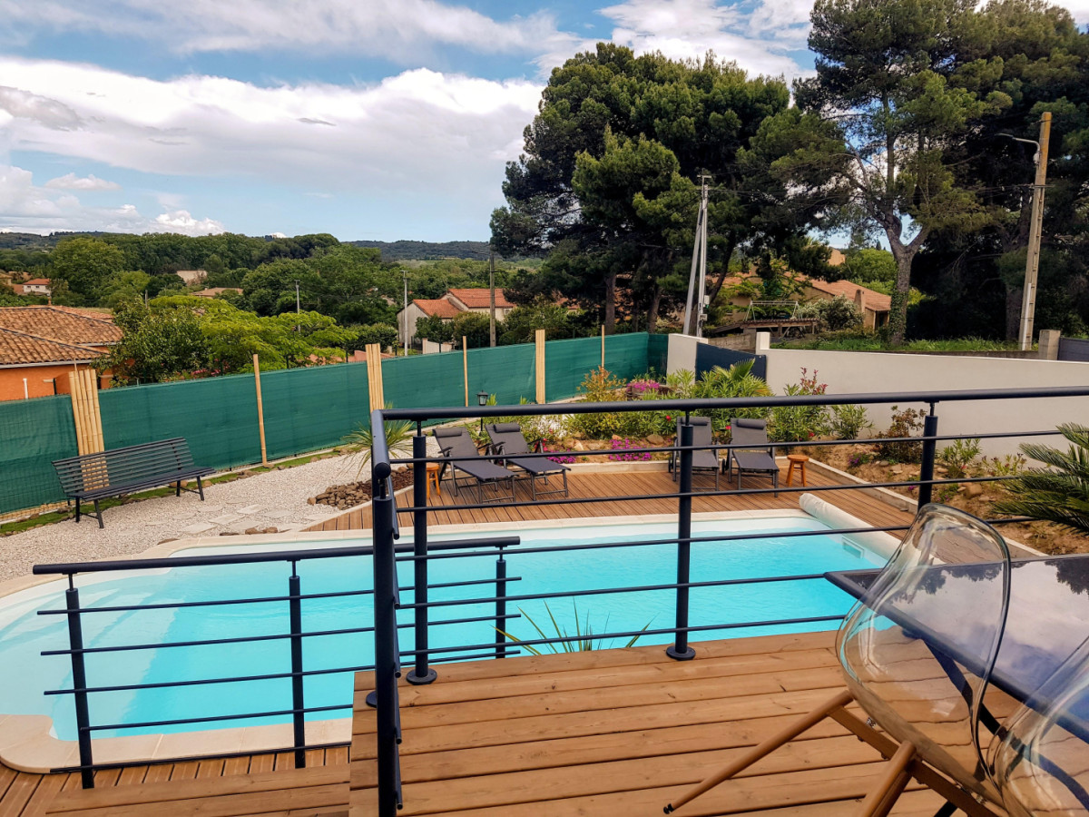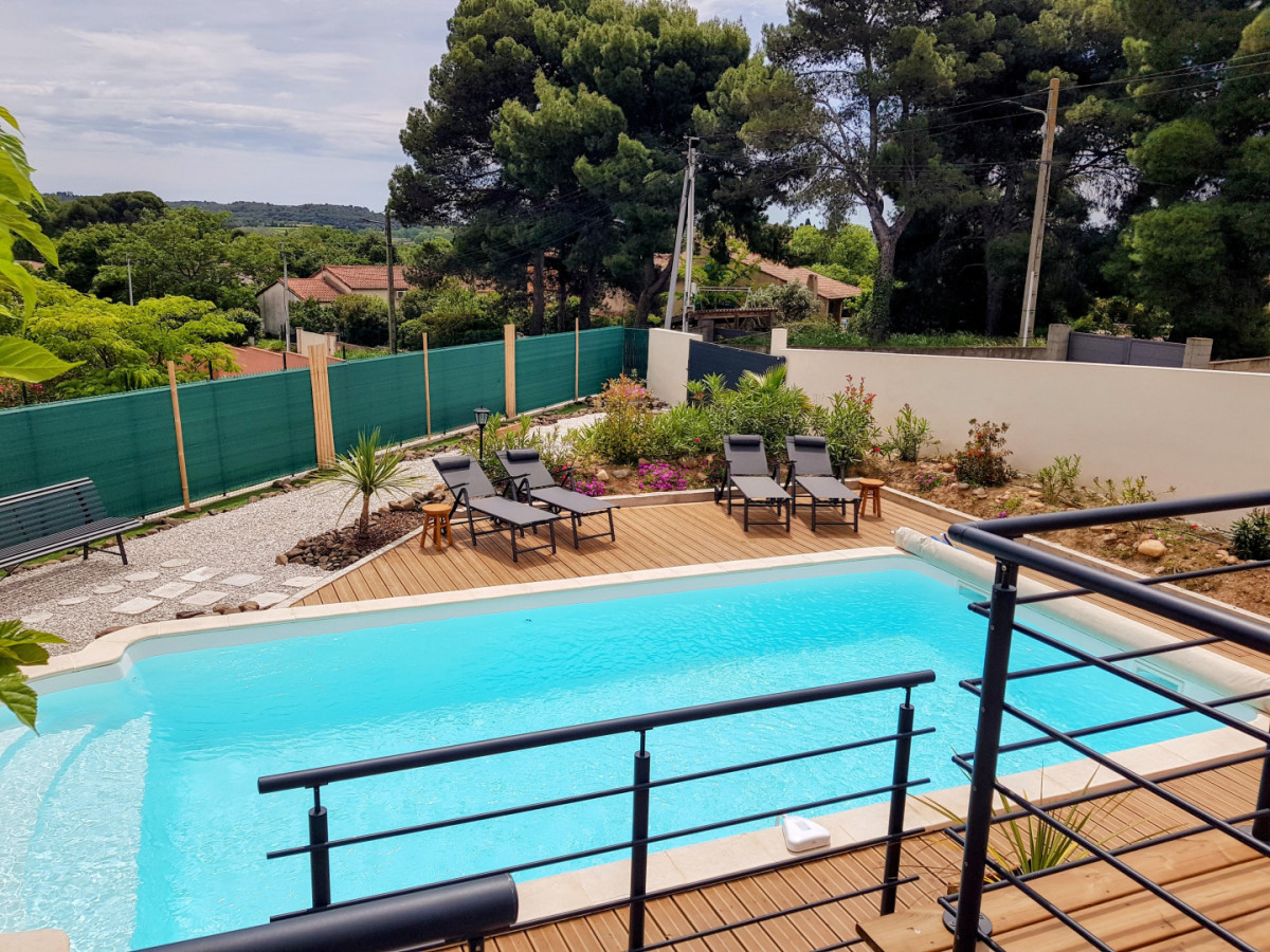 Maison individuelle climatisée de 100 m², de plein pied, à proximité du centre du village, des commerces, des animations et du fleuve Hérault. La Villa possède trois chambres, dont une chambre parentale avec un lit double, une chauffeuse et une salle d’eau avec douche et vasque avec miroir. La deuxième chambre dispose d’un lit double et d’un grand placard de rangement et la troisième chambre est idéale pour des enfants ou des amis avec deux lits simples, un bureau ainsi qu’un placard avec une multitude de jeux de société mis à disposition ! Le gîte possède une autre salle d’eau, indépendante, avec baignoire, vasque avec miroir, sèche-cheveux et lave-linge, ainsi qu’un WC indépendant. Une pièce à vivre très lumineuse de 50 m² offre un grand espace joliment décoré pour encore plus de confort et de convivialité. Dans le salon, vous trouverez deux canapés et un fauteuil en cuir, une TV, une borne radio/hifi, un vélo d’appartement ainsi qu’une borne Arcade. La cuisine est moderne et parfaitement équipée avec LV, four, micro-ondes, machine à café expresso et cafetière traditionnelle, bouilloire, réfrigérateur avec compartiment congélateur, plaques de cuisson à induction… De l’équipement pour bébés est mis à disposition (lit parapluie, chaise haute, baignoire…). A l’extérieur, accessible depuis le salon du gîte, vous pourrez profiter d’une terrasse en surplomb offrant une vue dégagée sur les environs et d’une seconde terrasse, en contrebas, à l’ombre d’un grand murier platane, mais aussi d’une grande piscine sans vis-à-vis, de 8m x 4m, d’1,40m de profondeur, traitée au sel, avec bâche à barre et alarme immergée, et d’un espace de détente fleuri. Le portail et les volets du gîte sont électriques. NB : les serviettes de toilette en option sont proposées en lot de deux pour 7€. Attractions touristiques : Pézenas, Saint Guilhem le Désert, le lac du Salagou, les Gorges de l’Hérault, le village de Canet et les multiples petits villages de l’arrière-pays, l’étang de Thau.