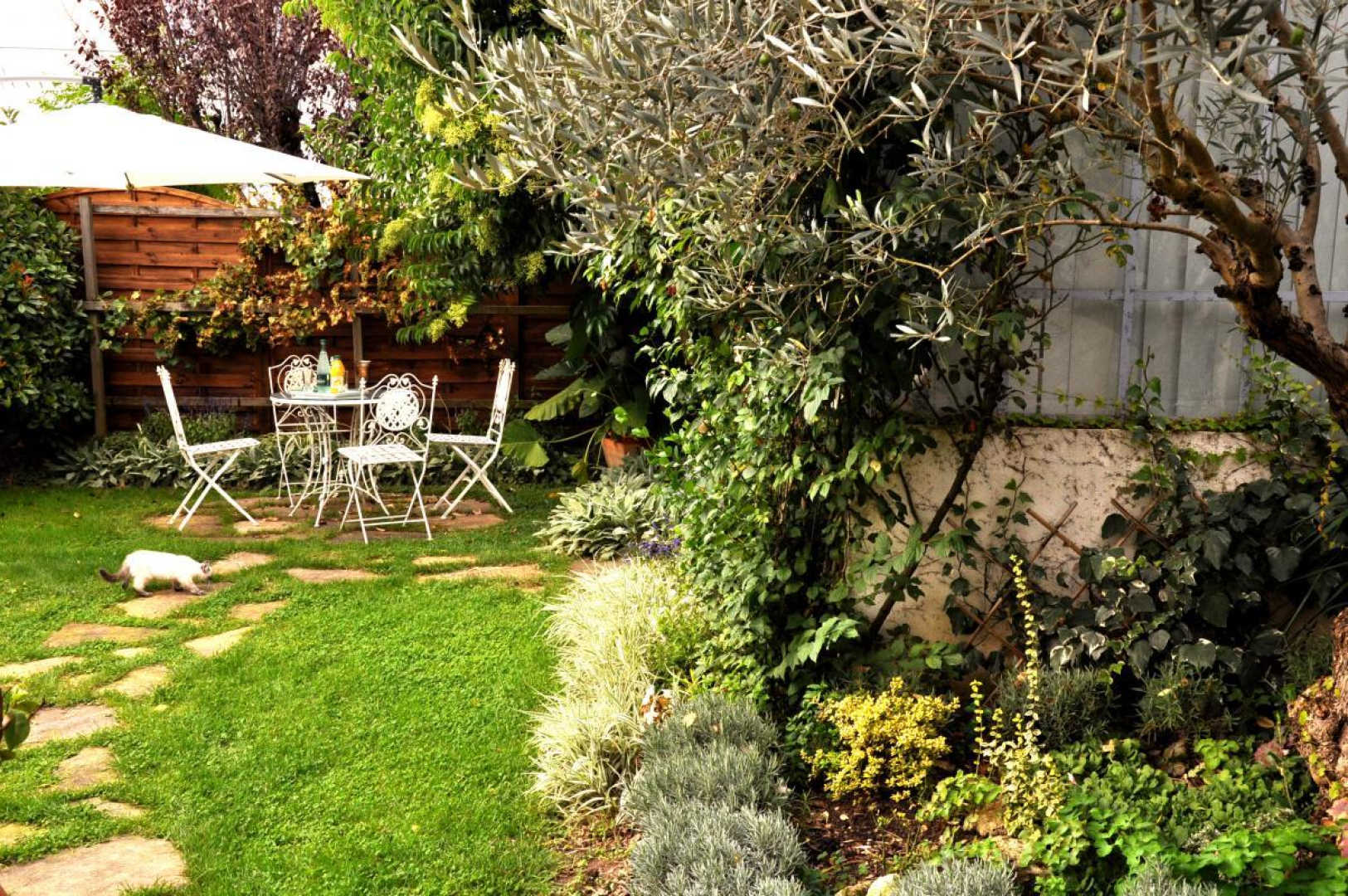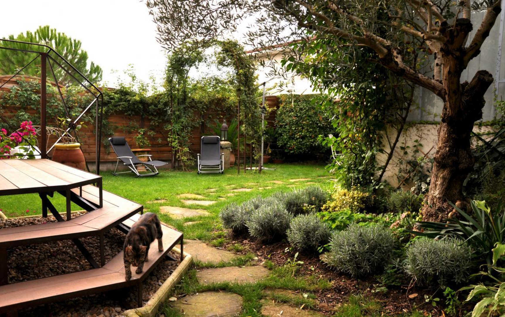 – un petit jardin engazonné, arboré et fleuri avec mobilier de jardin