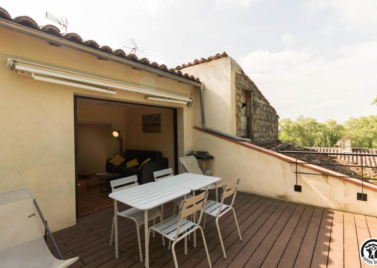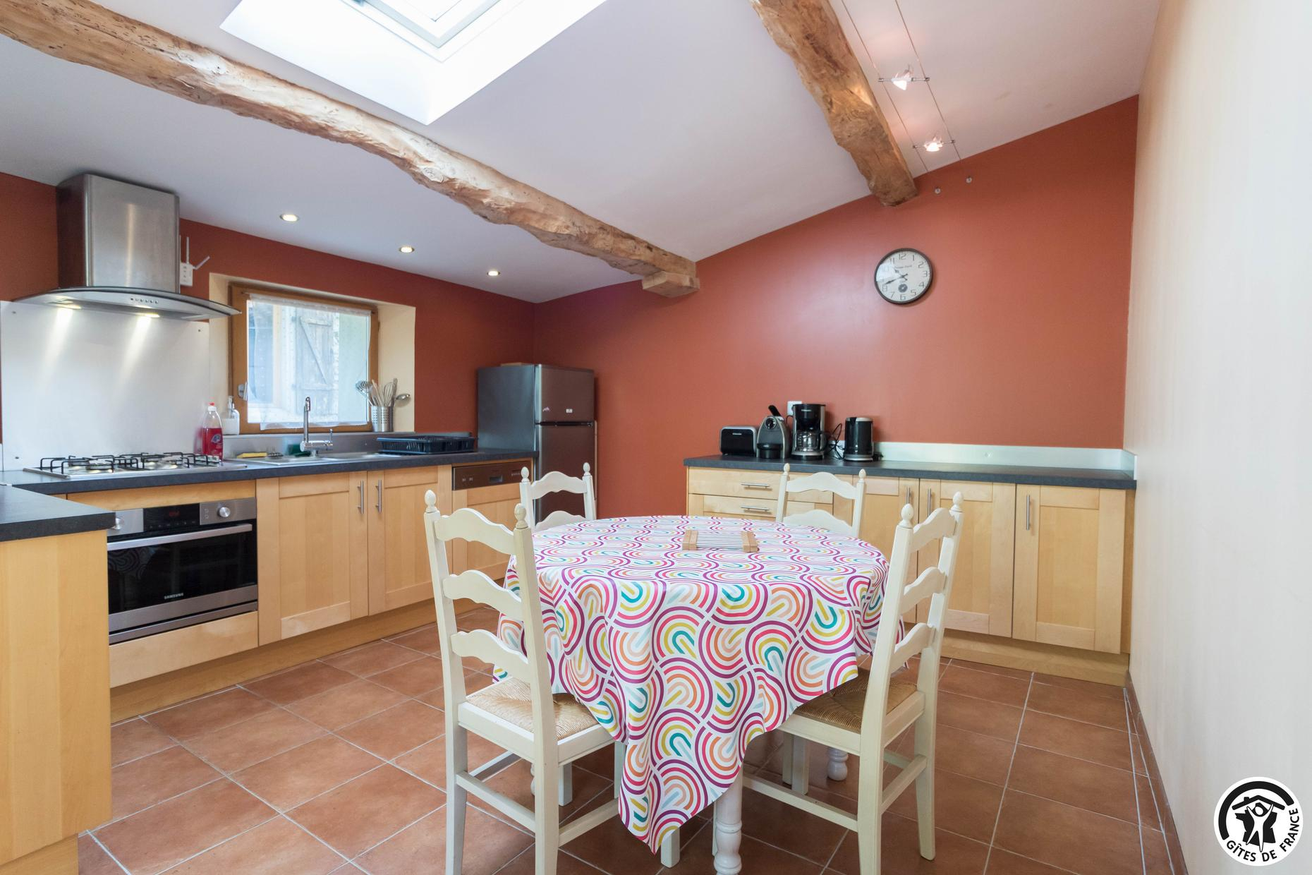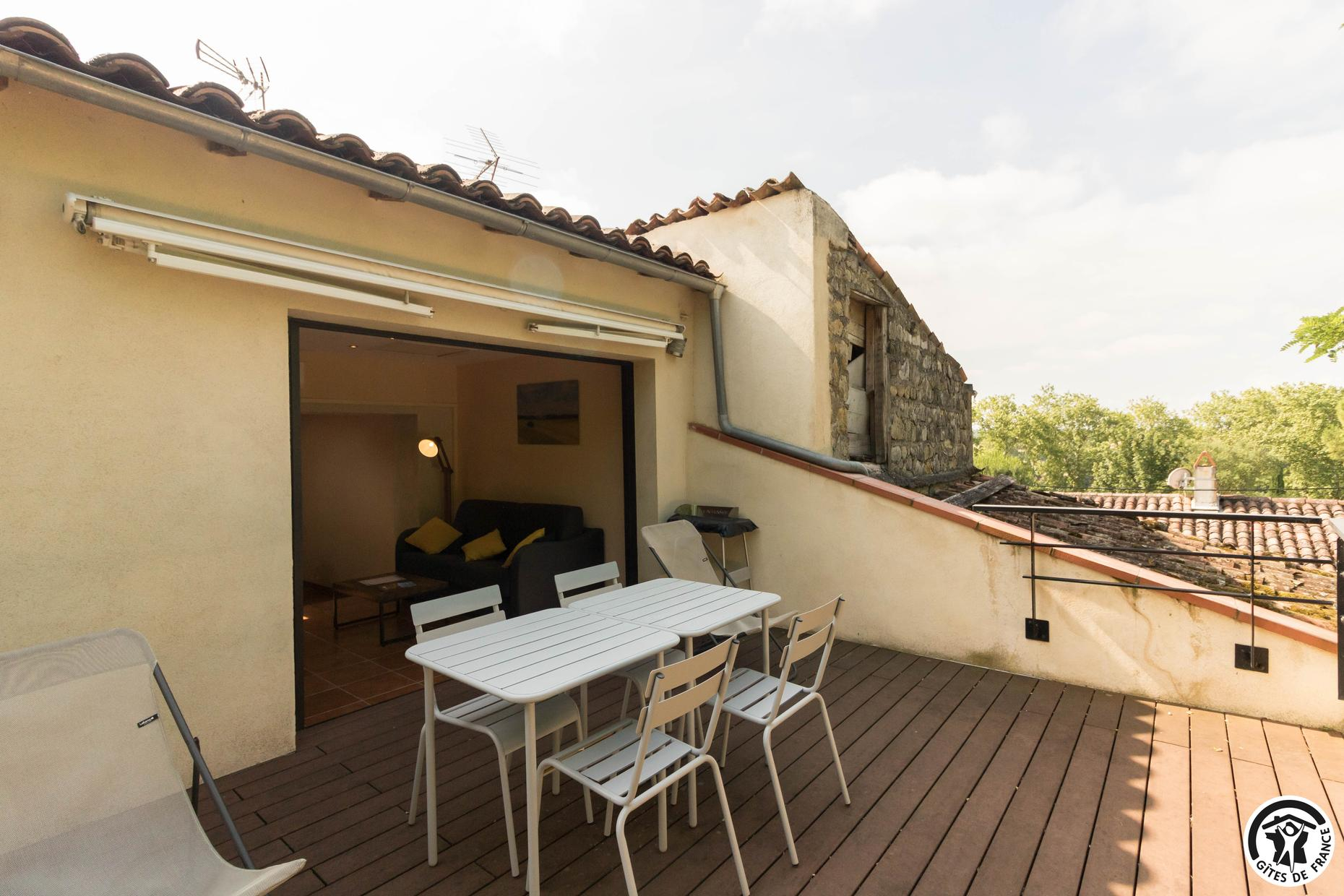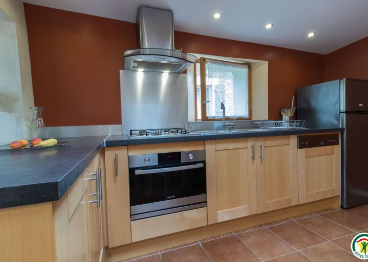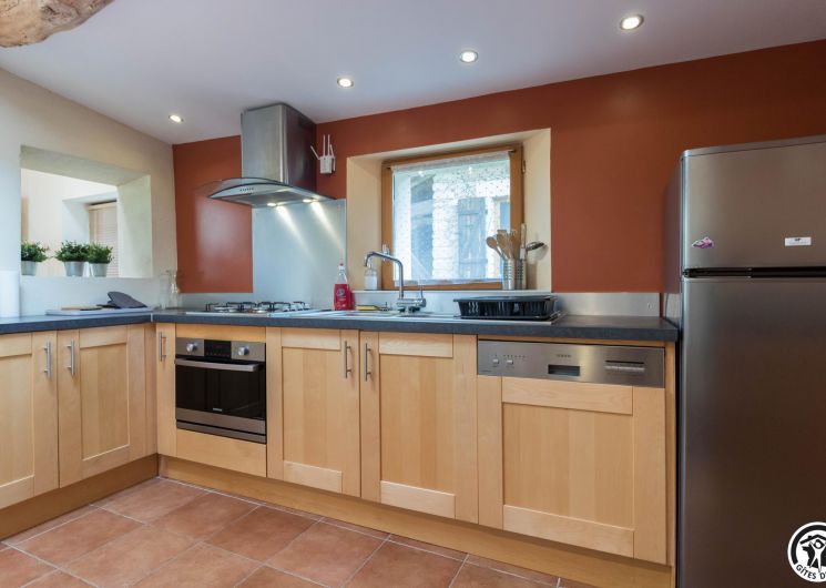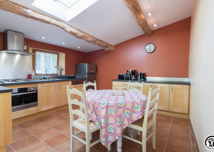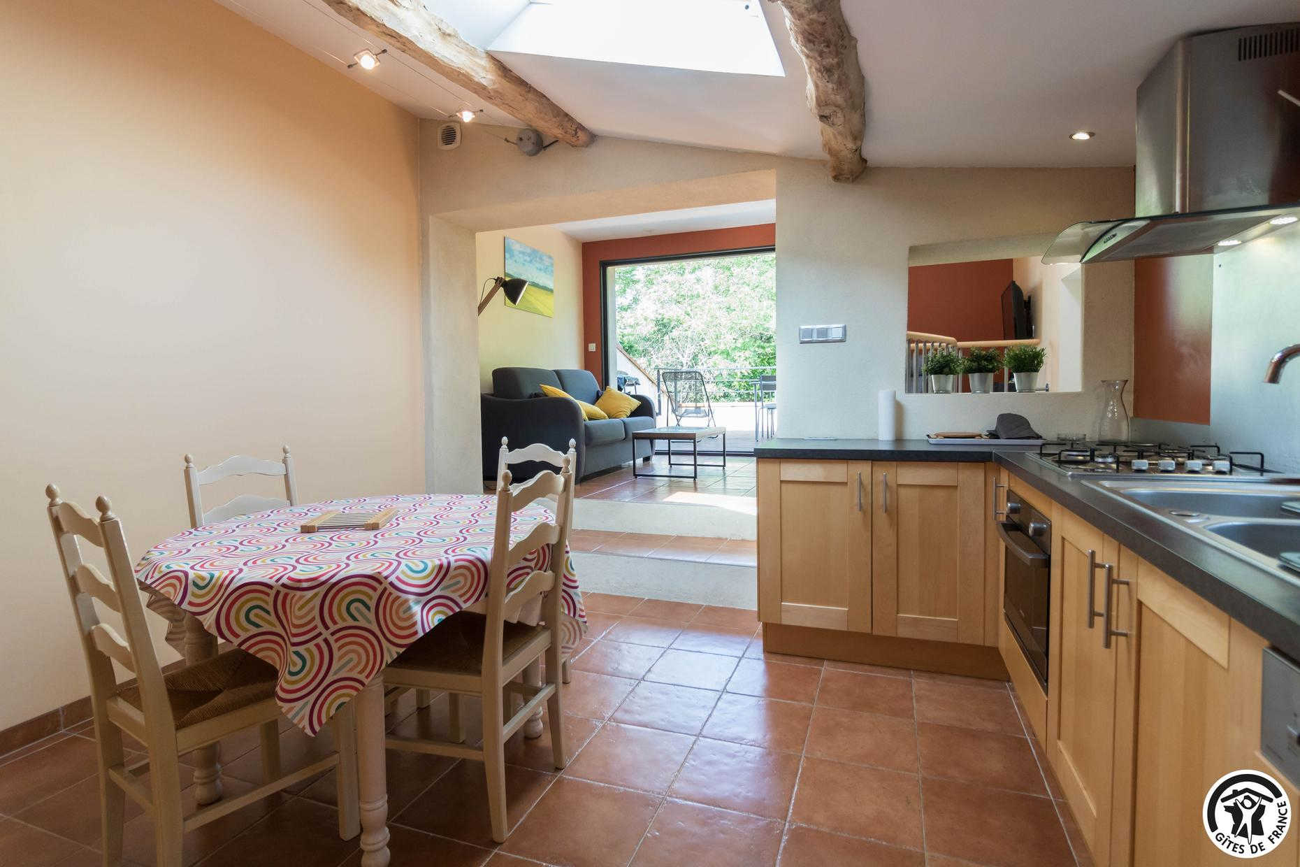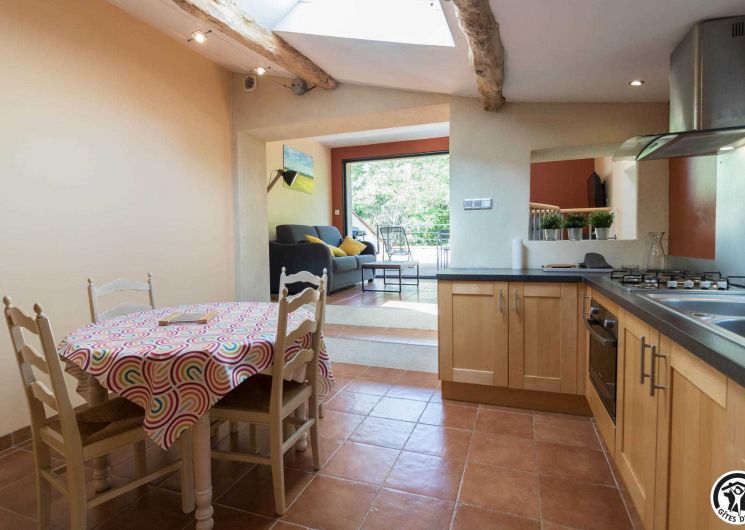 – Accès à l’étage par un escalier en colimaçon : cuisine (4 plaques gaz et micro-ondes) et salon donnant sur une grande terrasse par une baie vitrée à galandage, pour une ouverture totale sur l’extérieur.