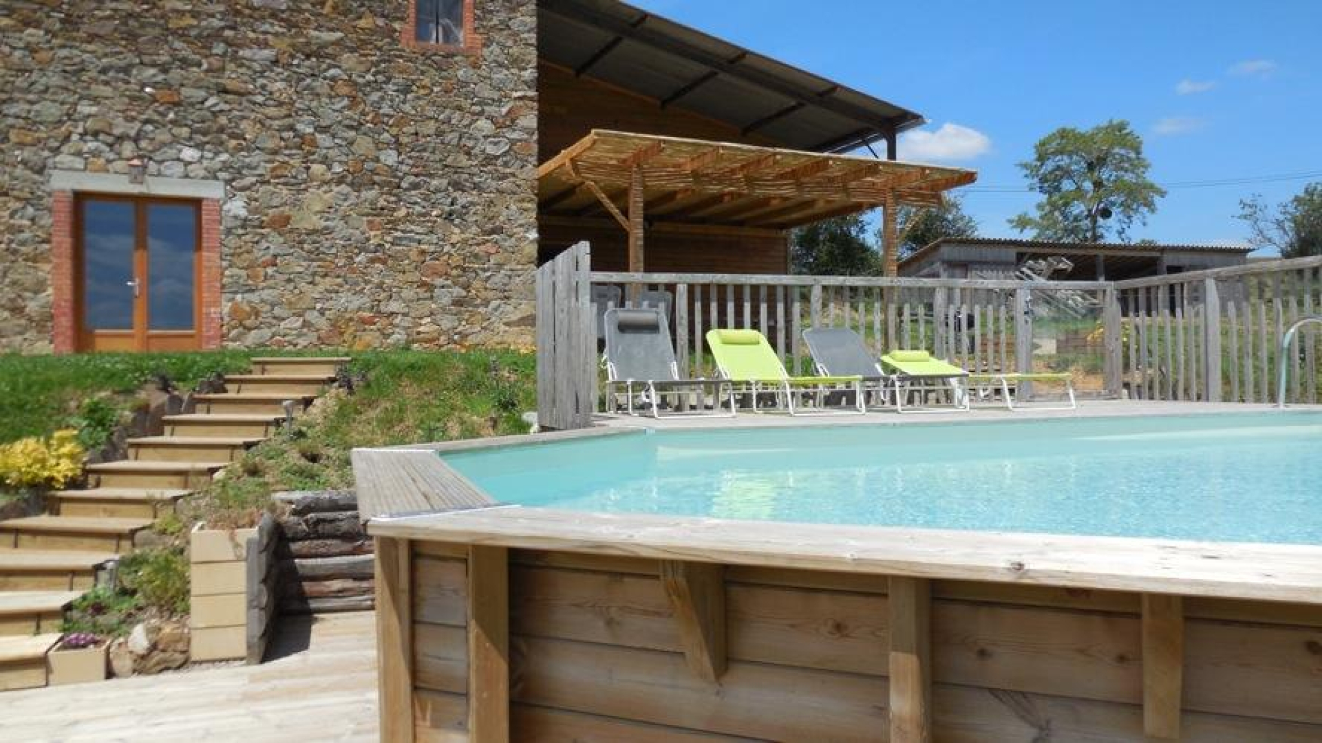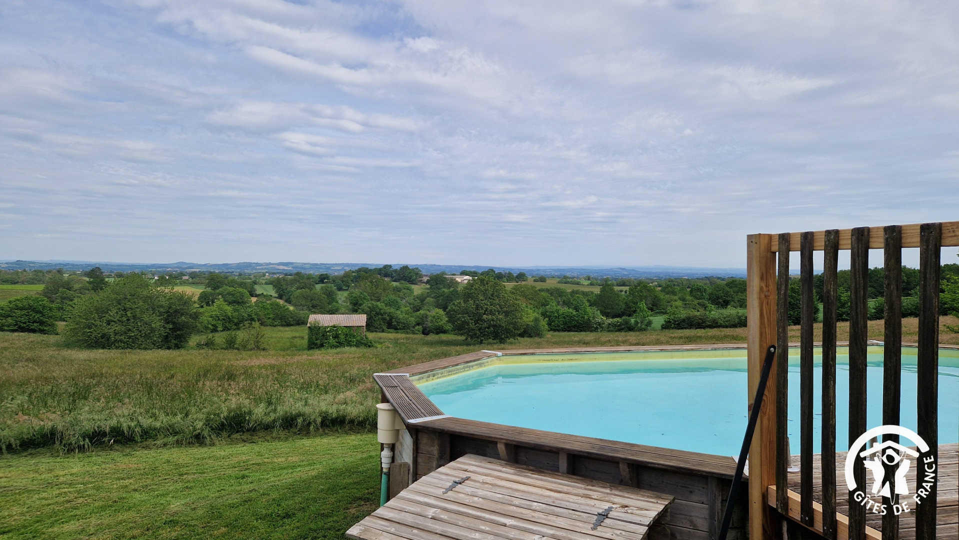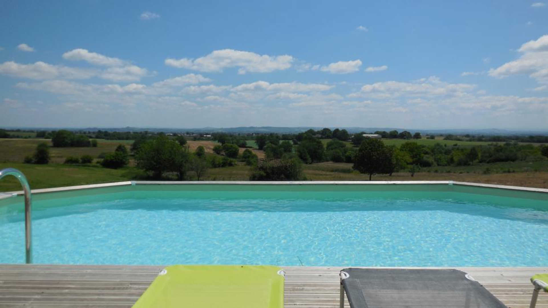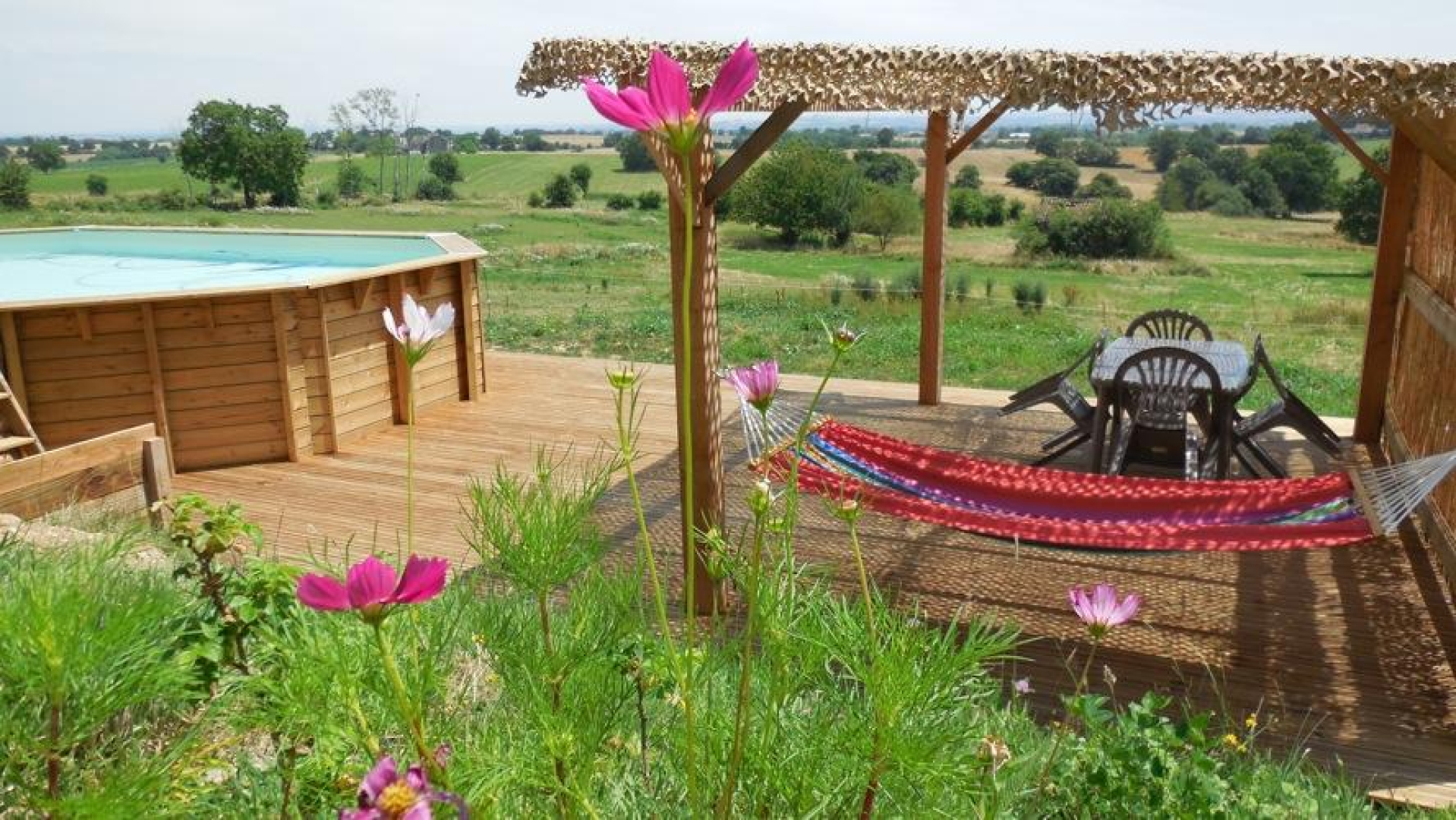 Dimensions de la piscine hors-sol : 8 x 4,50 mètres sur 1,30 mètres de hauteur. Piscine ouverte de juin à septembre.
