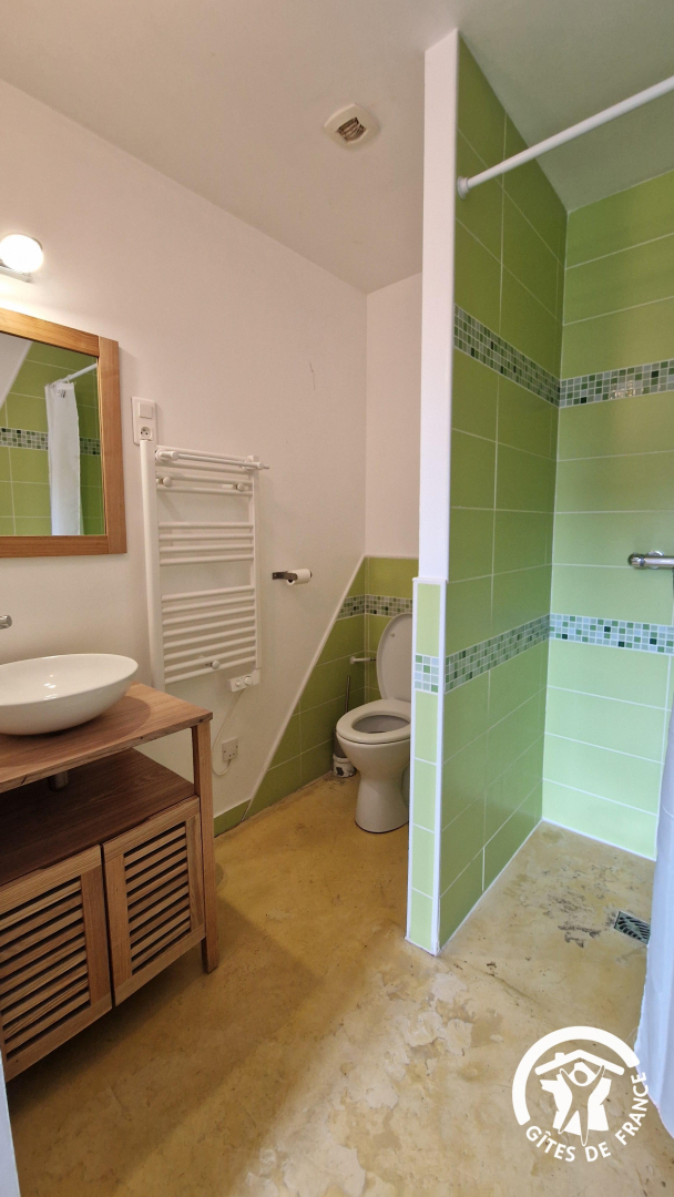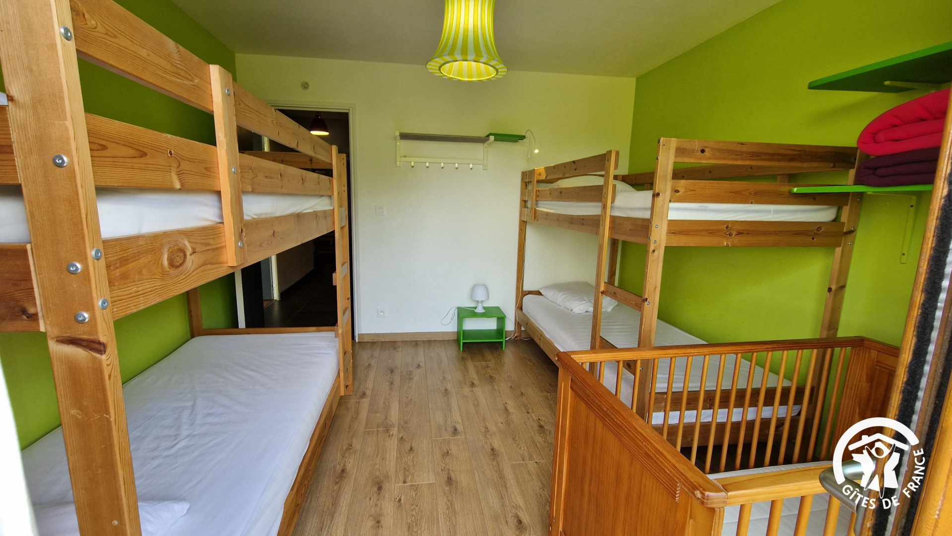 – Quatre chambres dont 2 avec salle d’eau privative (douche, wc et vasque), et une salle d’eau commune avec wc et lave-linge. Chambres de 2 à 4 personnes avec lits en 90x200cm, lits superposés en 90x200cm et lits doubles en 140x200cm.