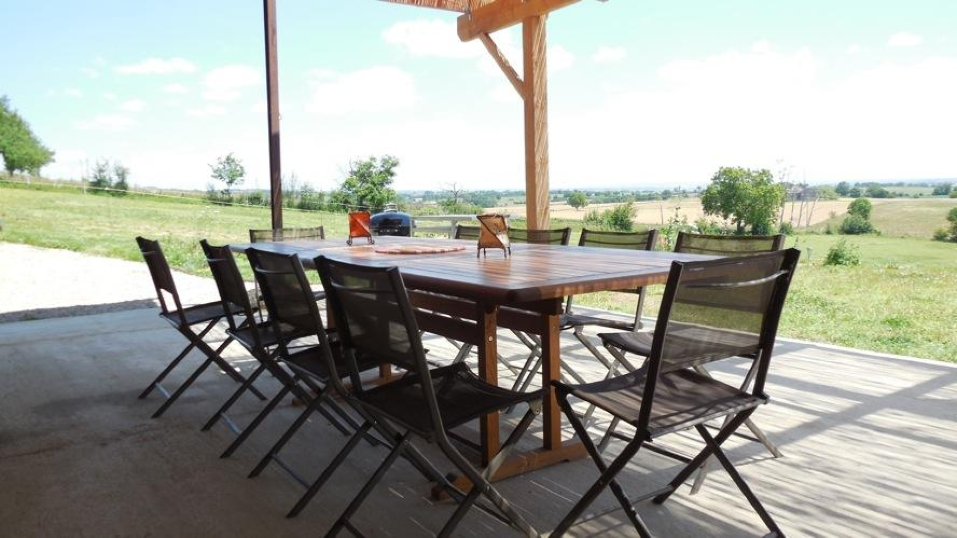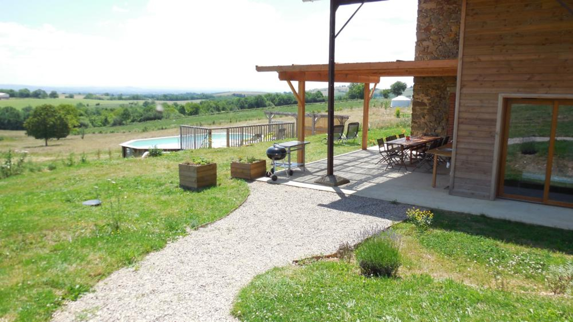 Terrasse couverte, plancha, barbecue rond au charbon Weber®, piscine hors-sol avec terrasse, grand terrain de 3 hectares où vos enfants pourront joyeusement s’ébattre. Il descend en pente douce vers un petit étang alimenté par une source.